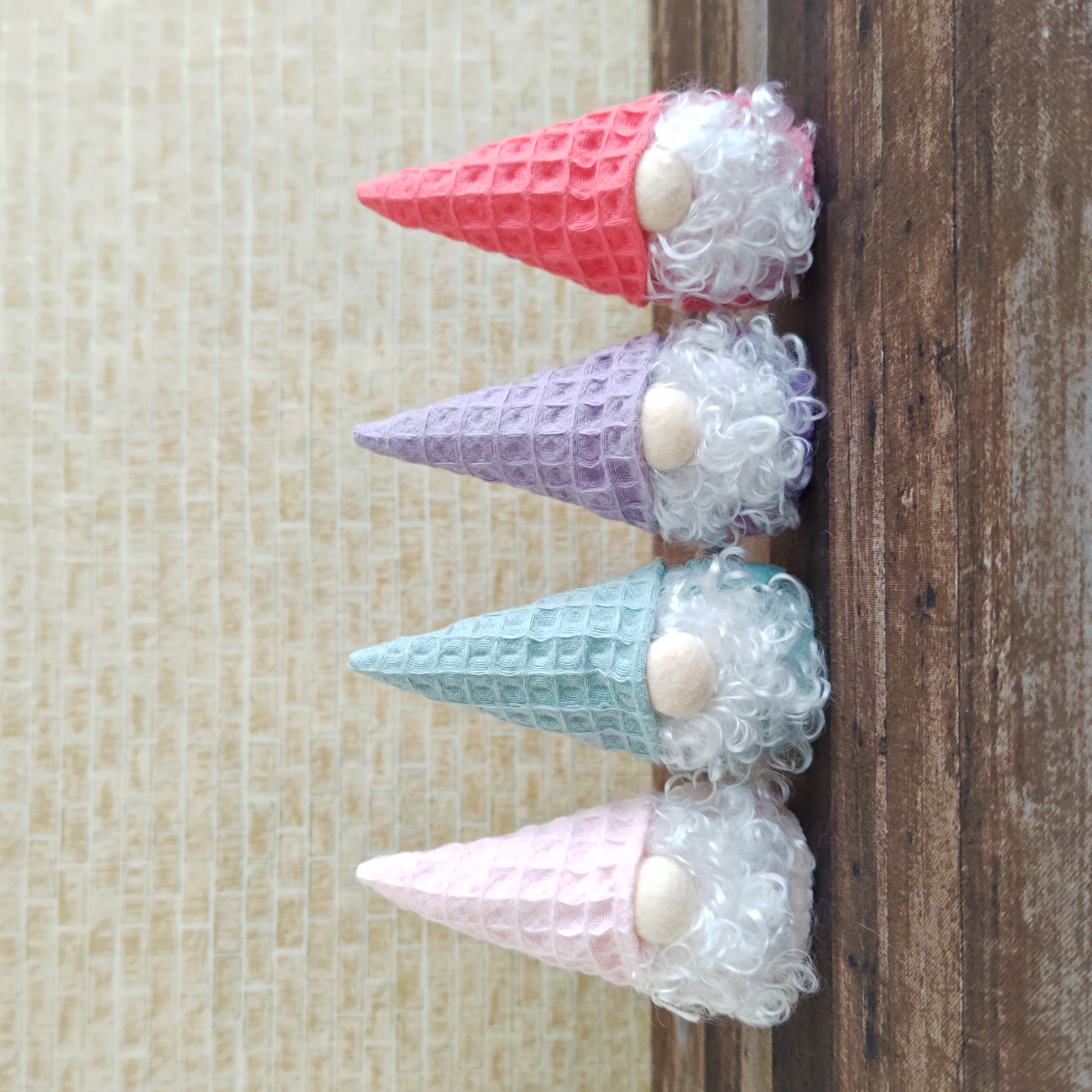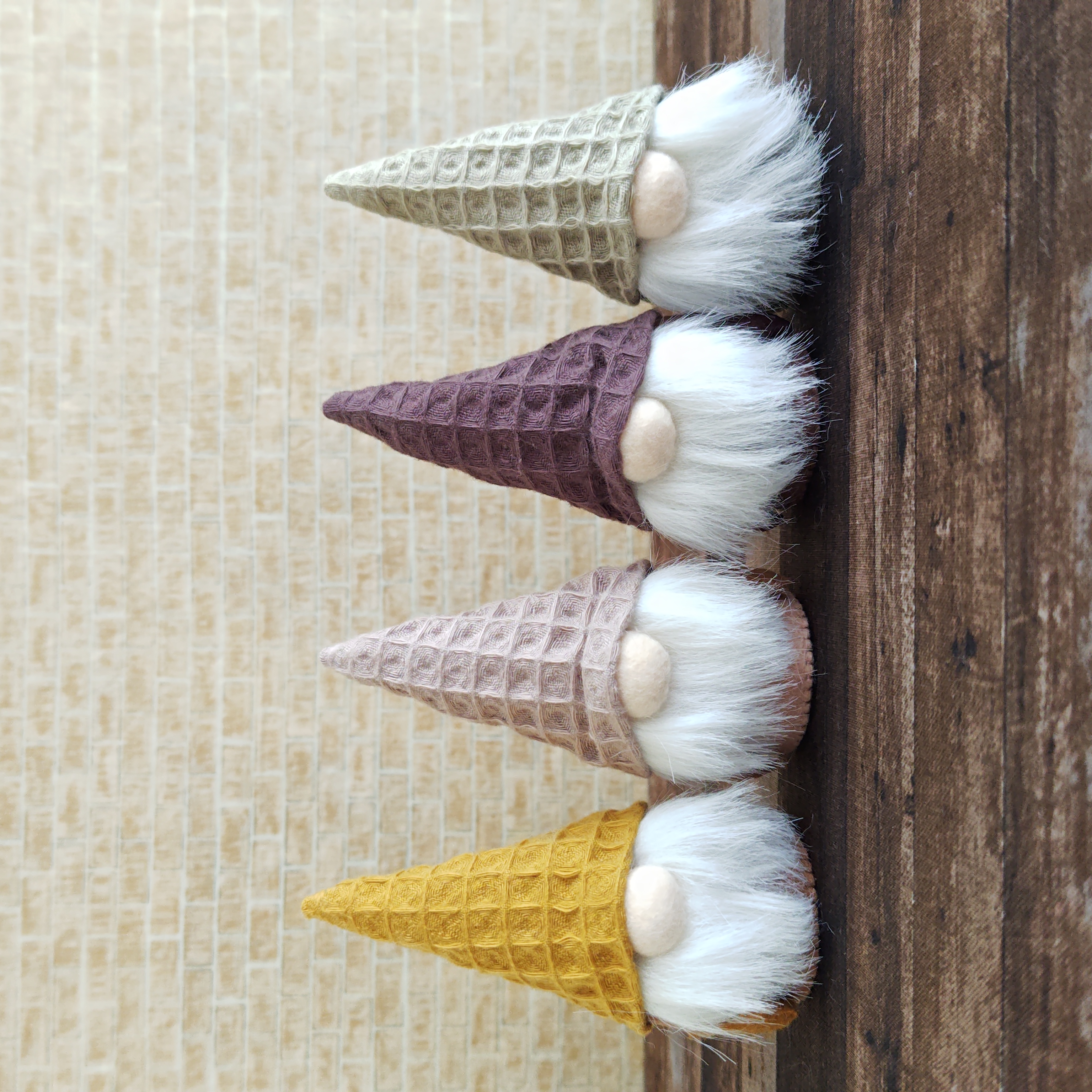 小人の妖精トムテを作りました。左から、キャラメル/ミルクティー/ココア/グリーンティーアイスコーンの帽子をかぶったおいしそうなカラーのトムテです。おひげ違いのトムテも。くるくるのおひげもいいね♡ミルクティートムテ小人のくるみ割り人形を作ろうかと考えていた時にこの生地をみつけたのでアイスコーンにしてみました。帽子にしたら可愛いけど、でもこれだとくるみ割り人形じゃないなーってことで小人の妖精トムテになりました。
