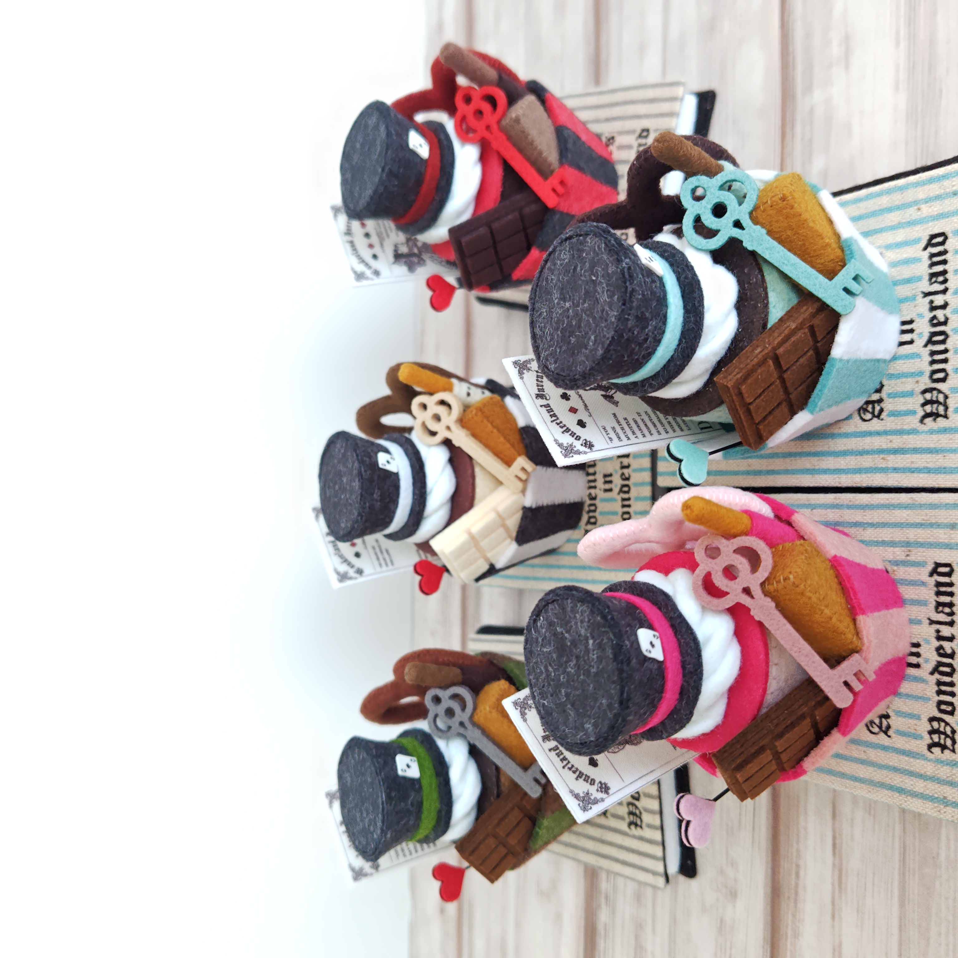 アリスをイメージして作ったフェルト製のオブジェ。アリスの世界観をカップデザートにつめこみました♡プリンに板チョコ・キャラメル・チョコスティック・プレッツェルのお菓子と、鍵・ハート・帽子・カードをデコレーション。それぞれのイメージのカラーで5種作りました。赤×黒【ハートの女王】ライトブルー×白【アリス】濃淡ピンク【チェシャ猫】緑×茶【いかれ帽子屋】白×黒【白うさぎ】久しぶりのアリス作品です。