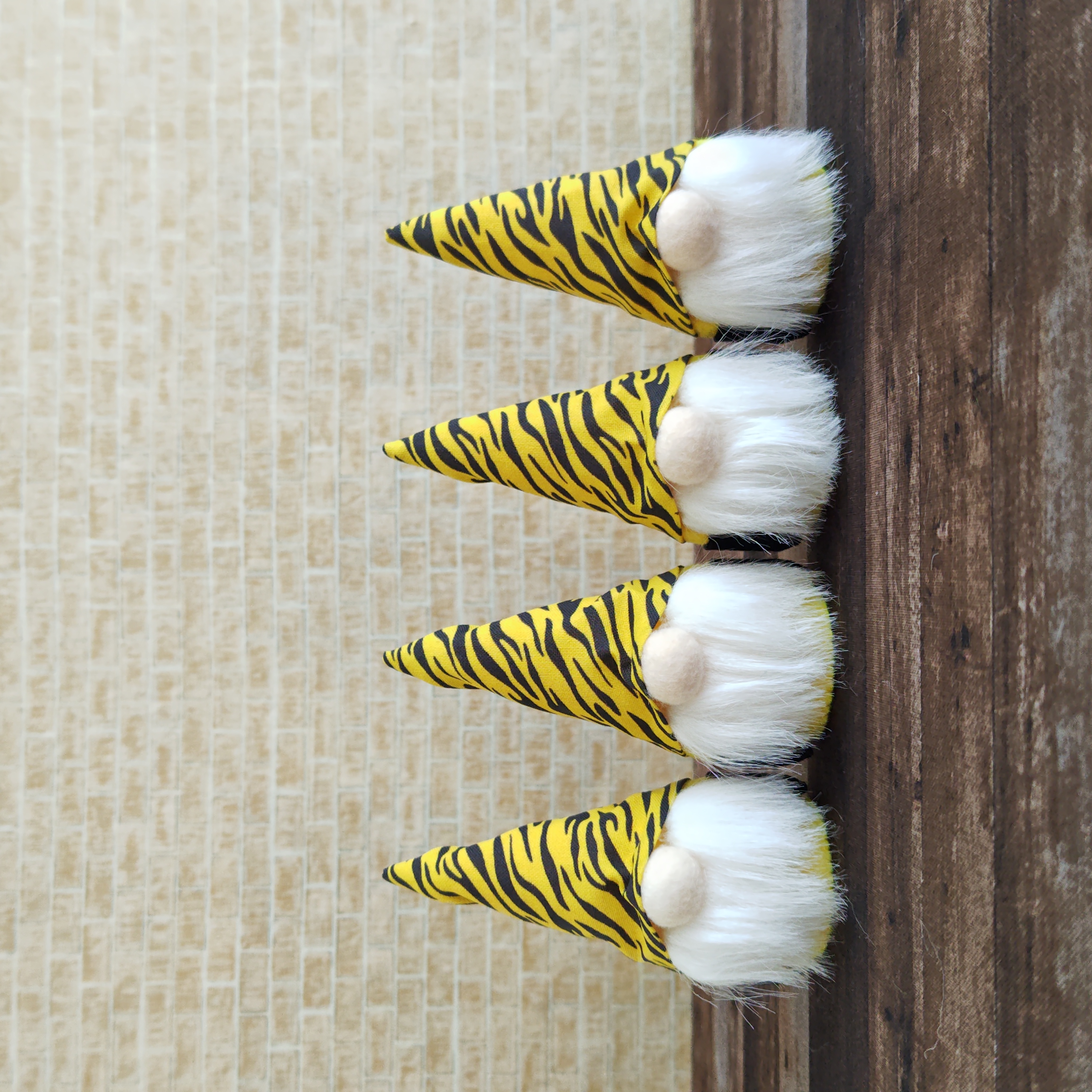 黄×黒の虎トムテを作りました。黄色のボディに虎柄の帽子。静かにお家で全力応援しているらしい虎ファンのトムテです。背番号がいいね♡ピンク×黒の虎トムテもいますよ。
