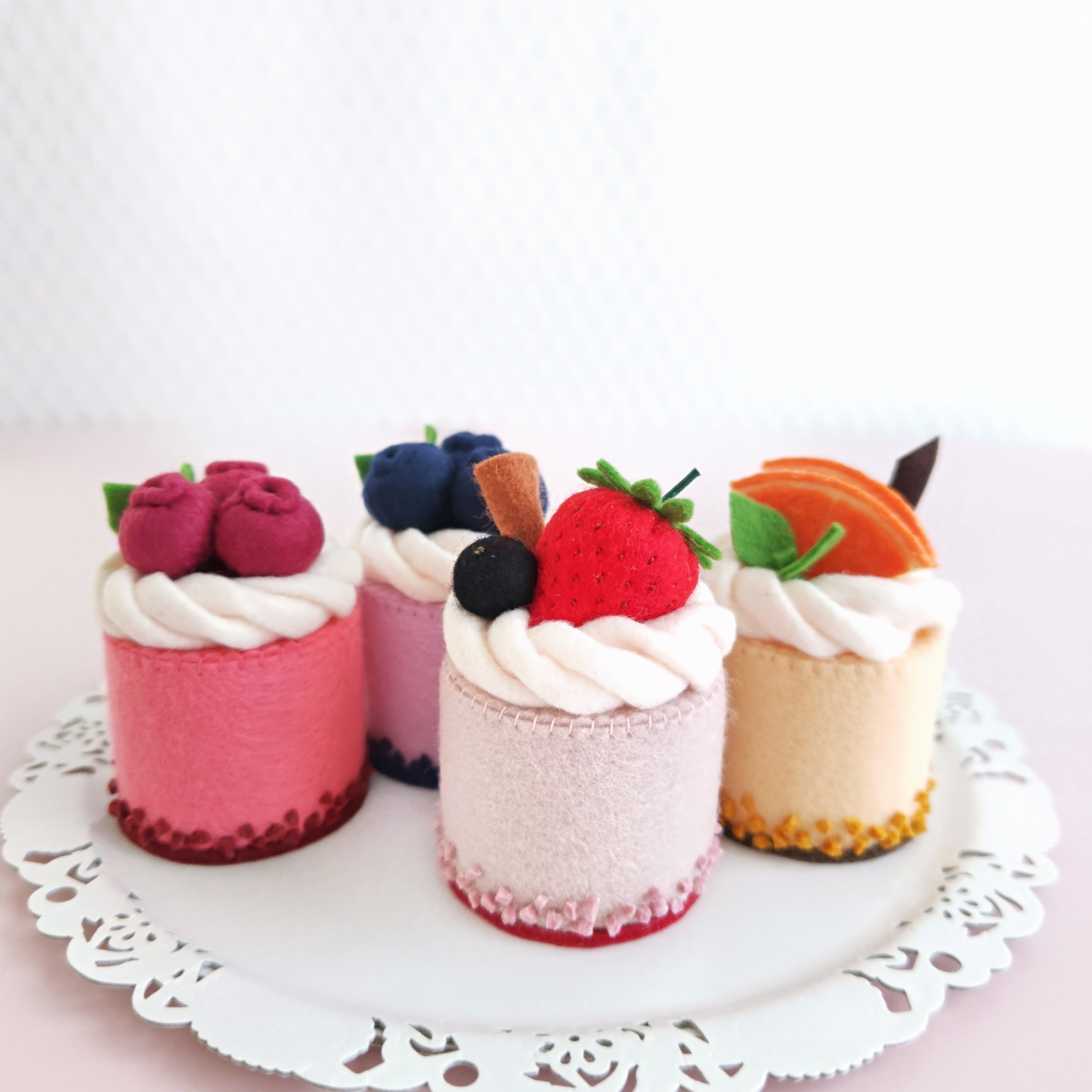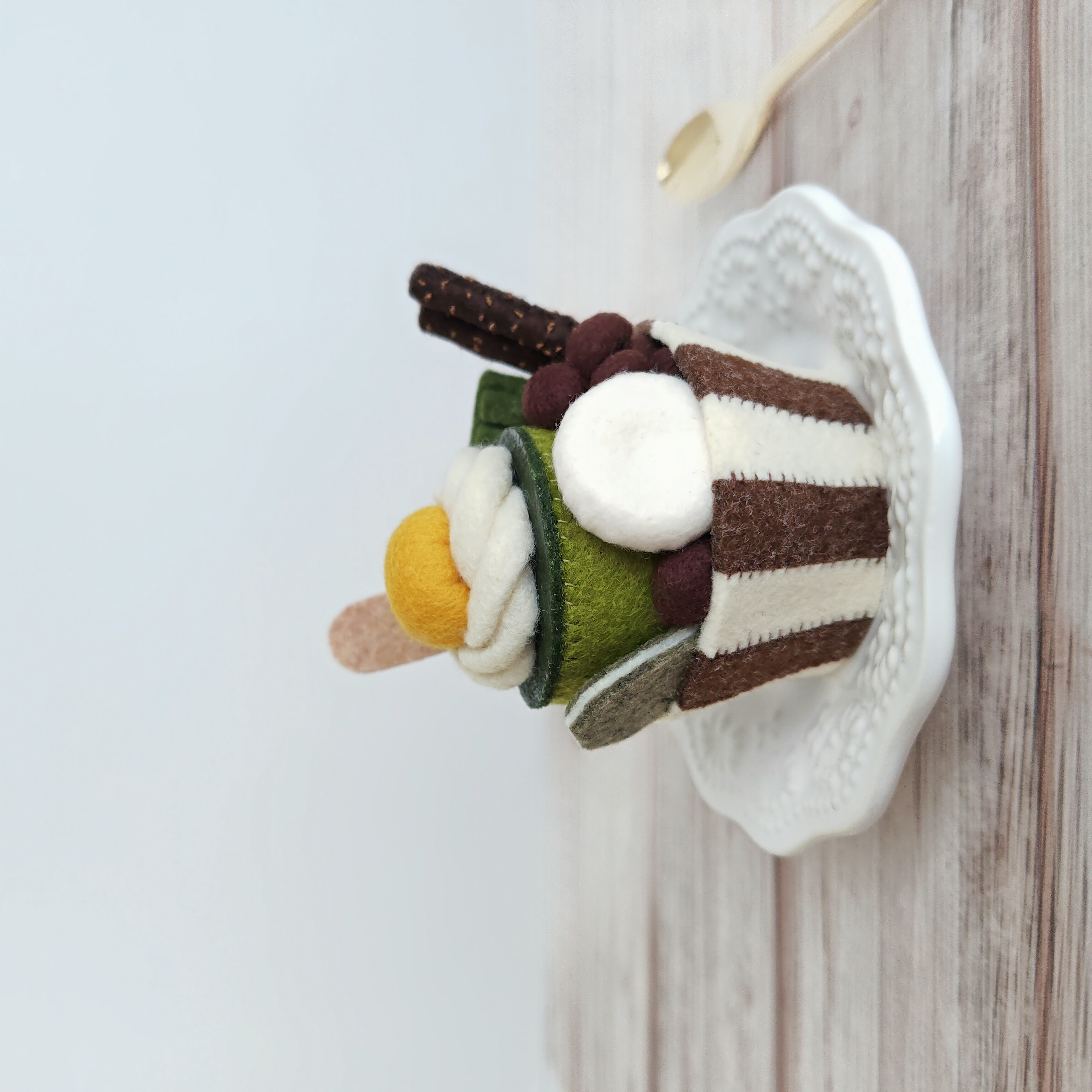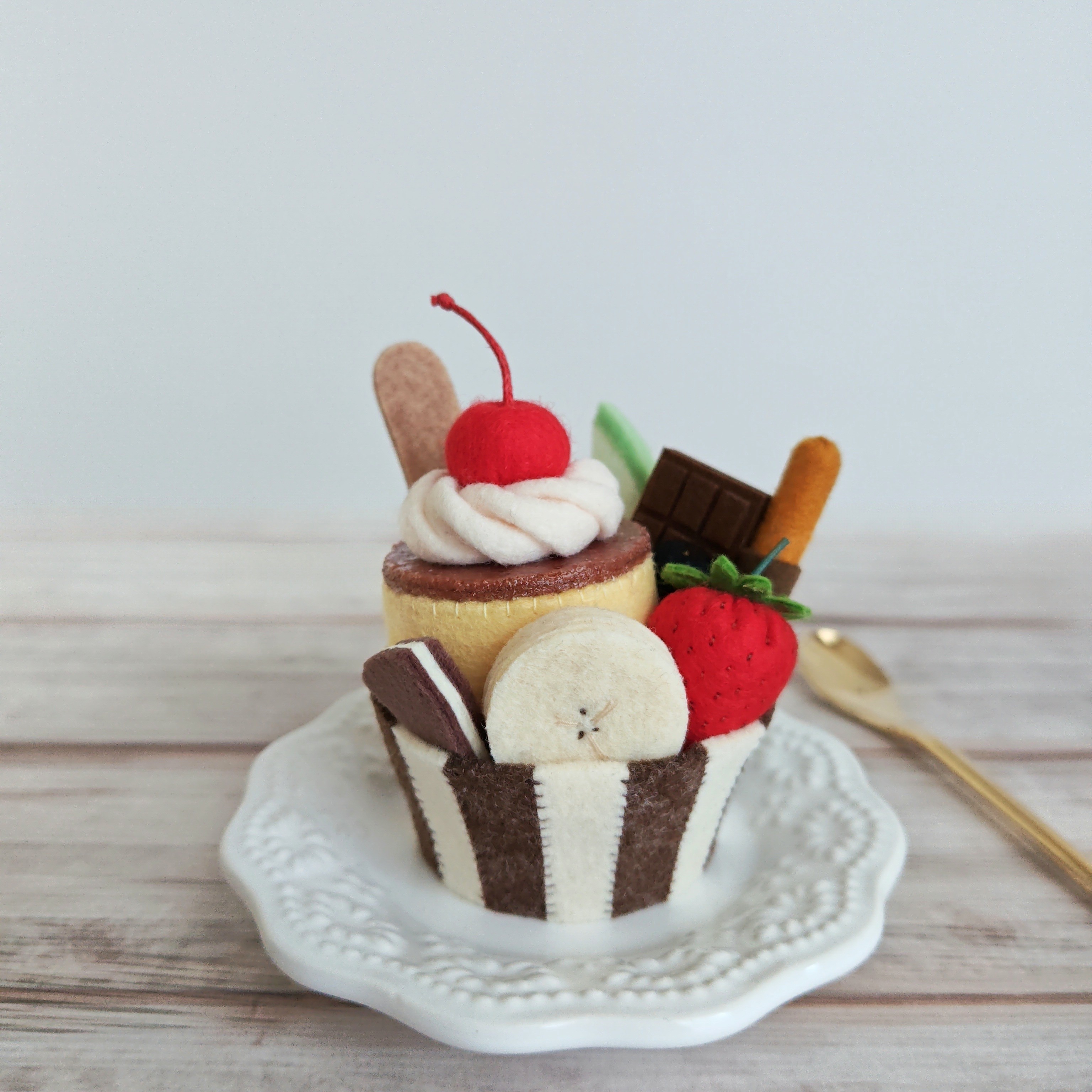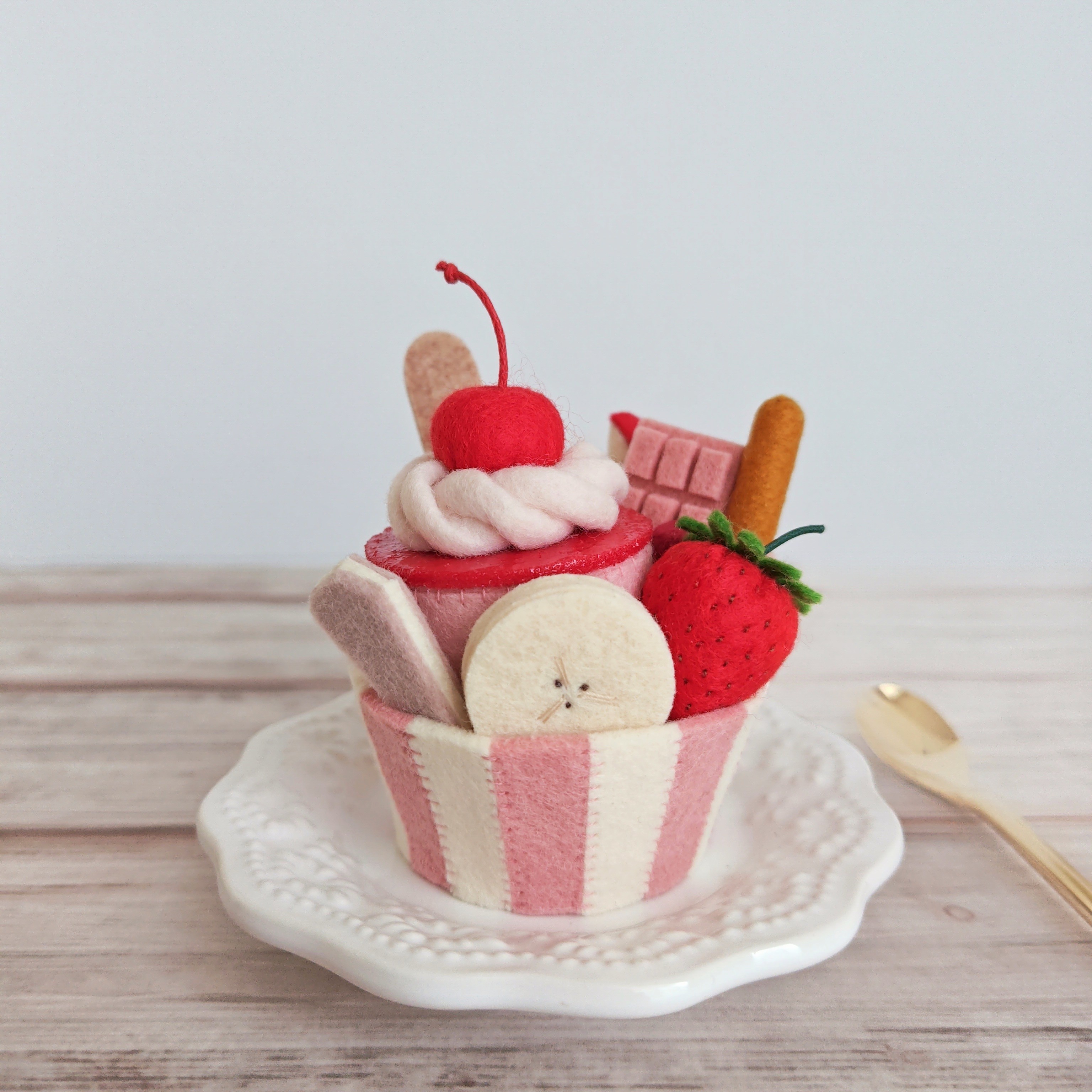 新しくカップデザートができました。カスタードプリンにメロン・ブラックベリー・いちご・バナナ・チェリーのフルーツと、板チョコ・チョコプレッツェル・クリームサンドビスケットのお菓子をデコレーションしたプリンアラモードです。カップもスプーンも全部フェルトで作りました。