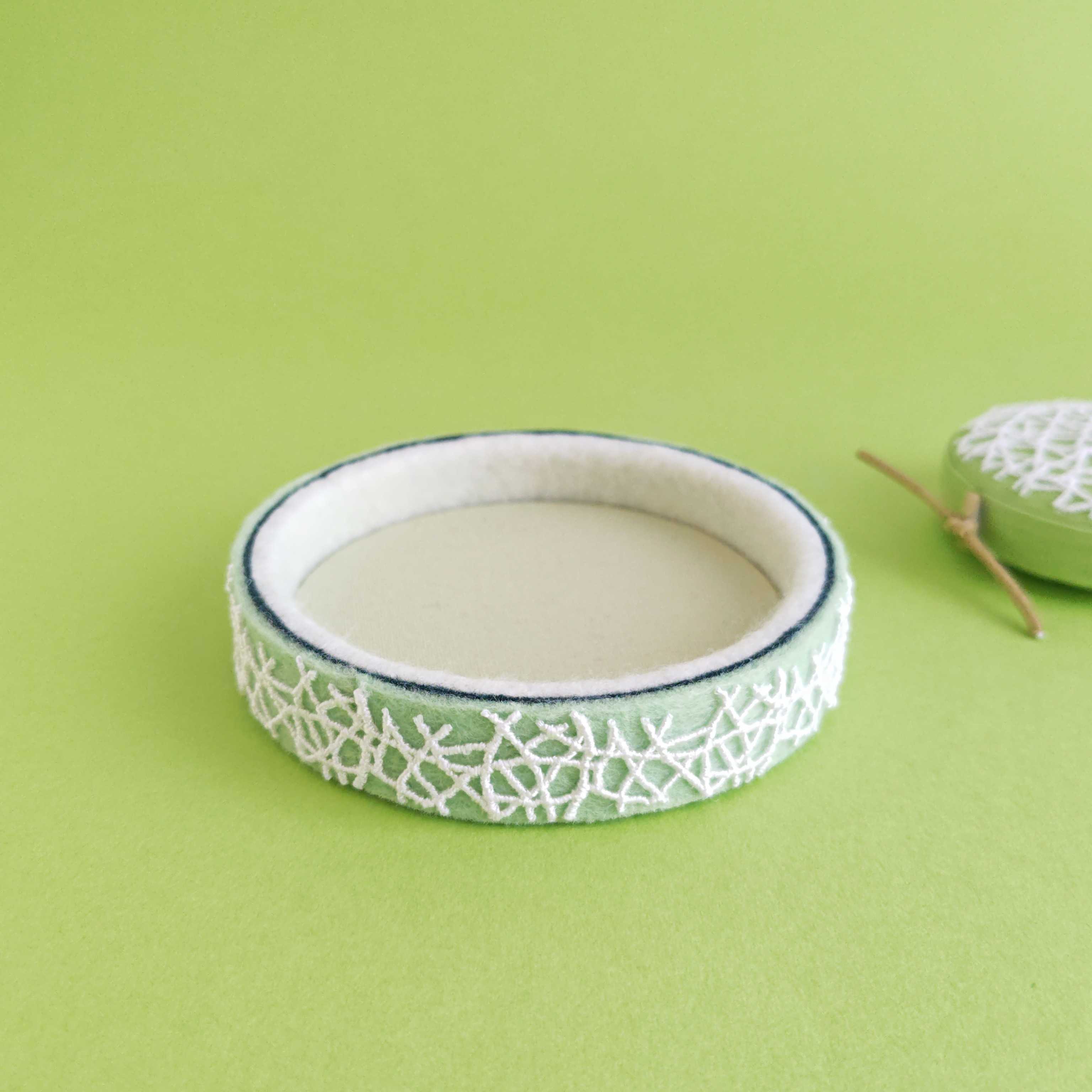 メロンでトレーも作ってみました。ケーキ製作時にデコレーション用のフルーツとかを一時的に置いておくトレーとして使っています。すいかも作りました。ピンクッションを作ったのでお揃いで。「今日はメロン」「今日はすいかで」と、気分に合わせて使い分けています。