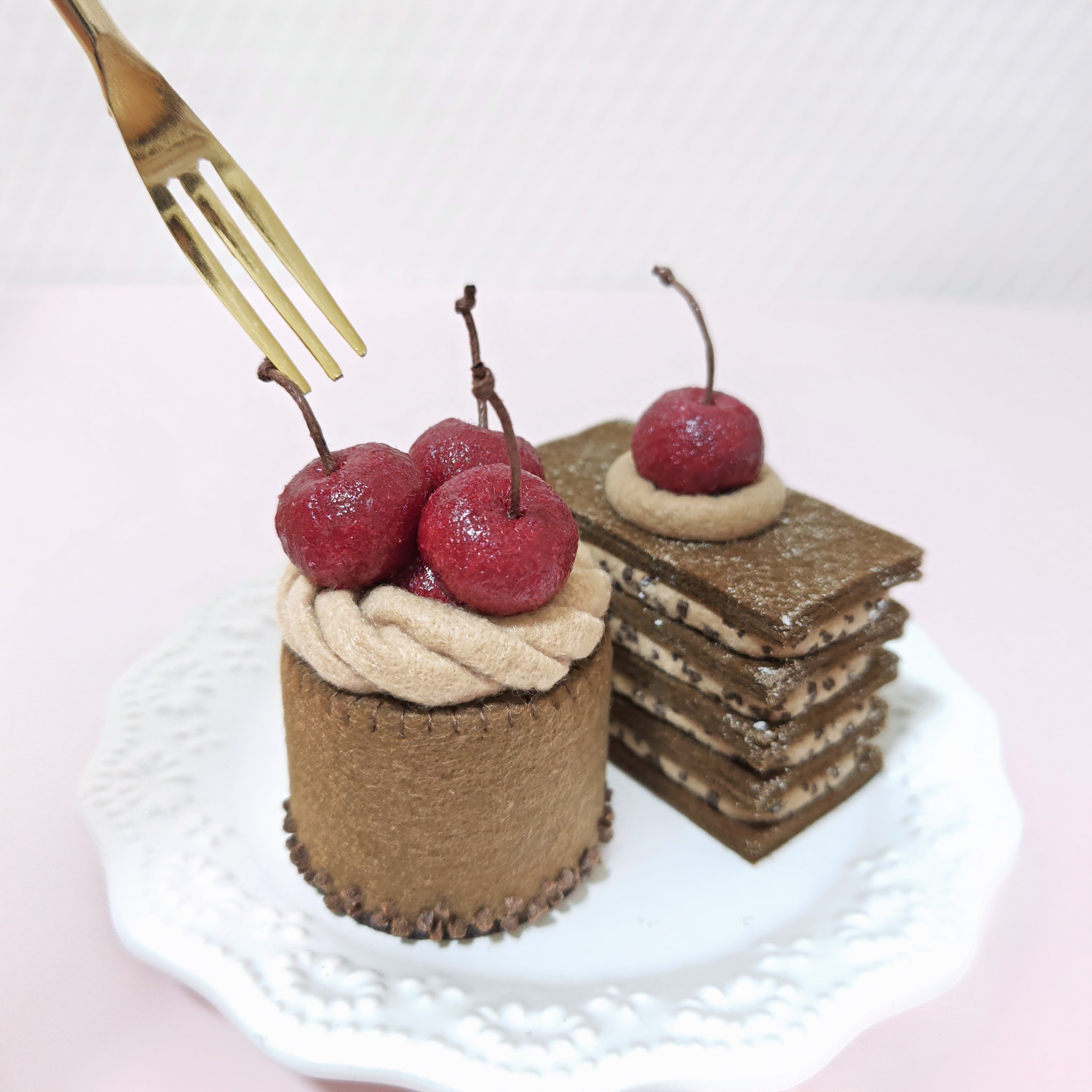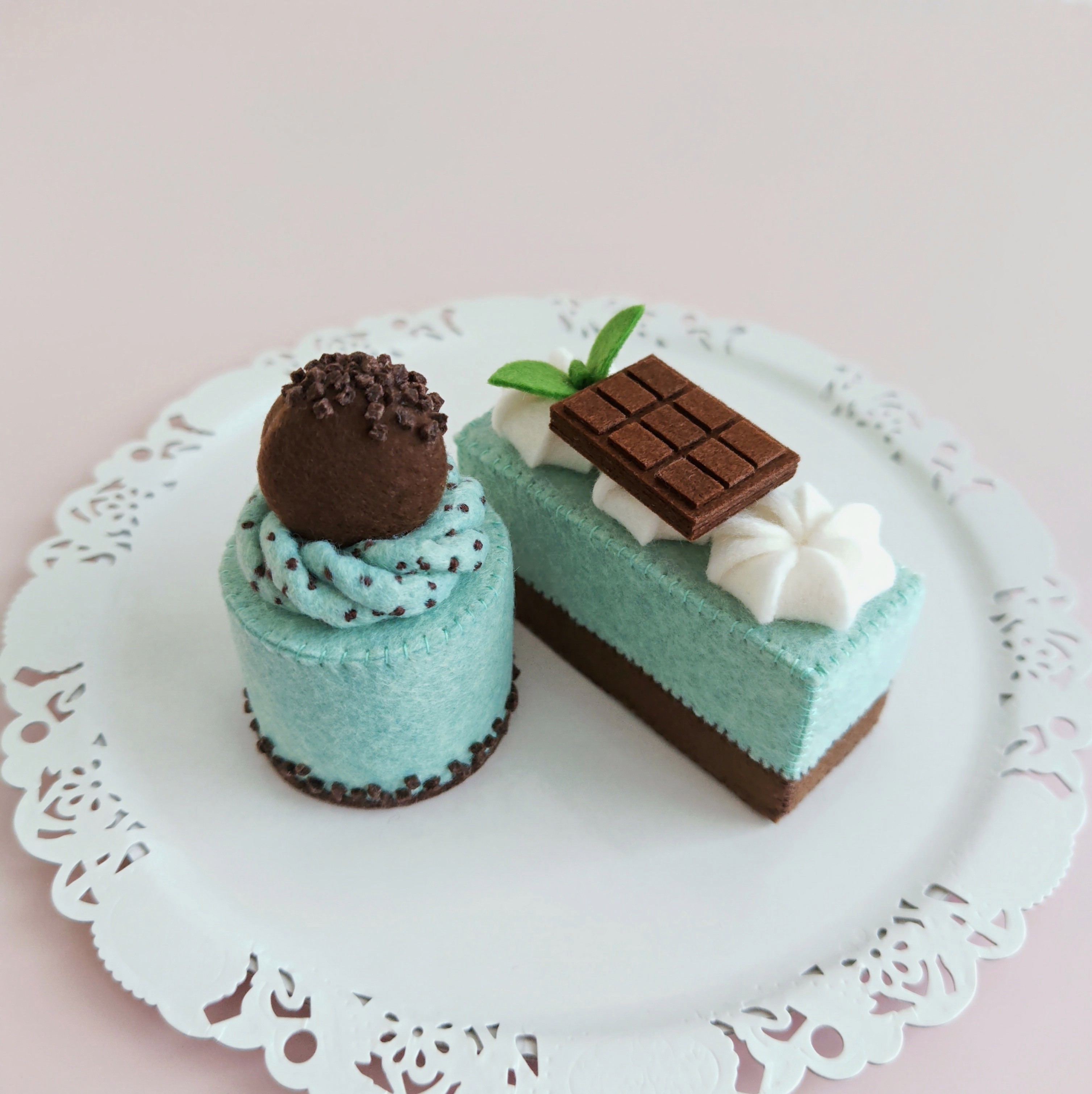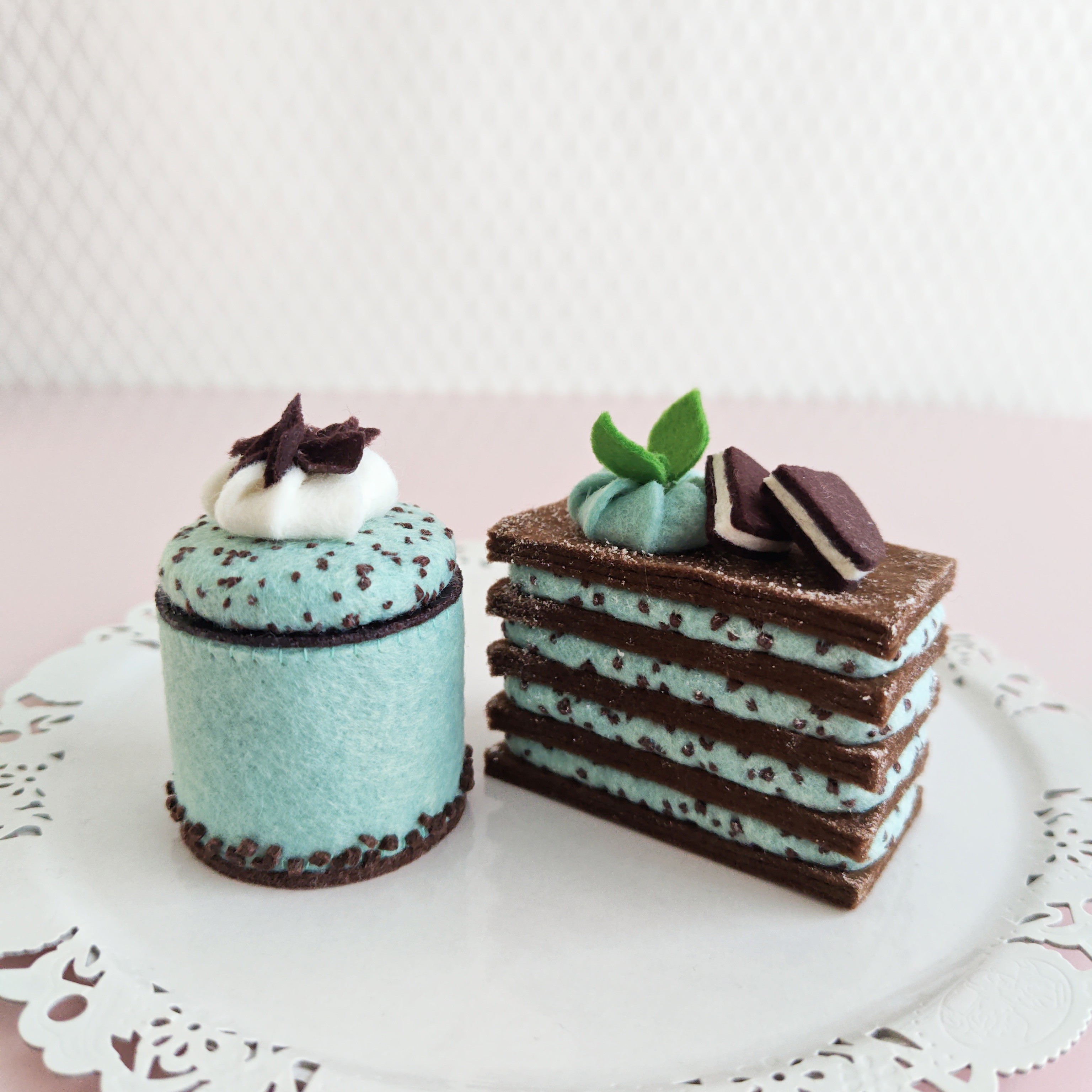 チョコミントのケーキです。ミントに使えそうな良い色のフェルトを見つけたのでチョコミントのケーキを作りました。チョコミントは苦手なので食べませんが、色合いがかわいくて見た目は好きです。チョコミントって名前もなんかかわいい♡