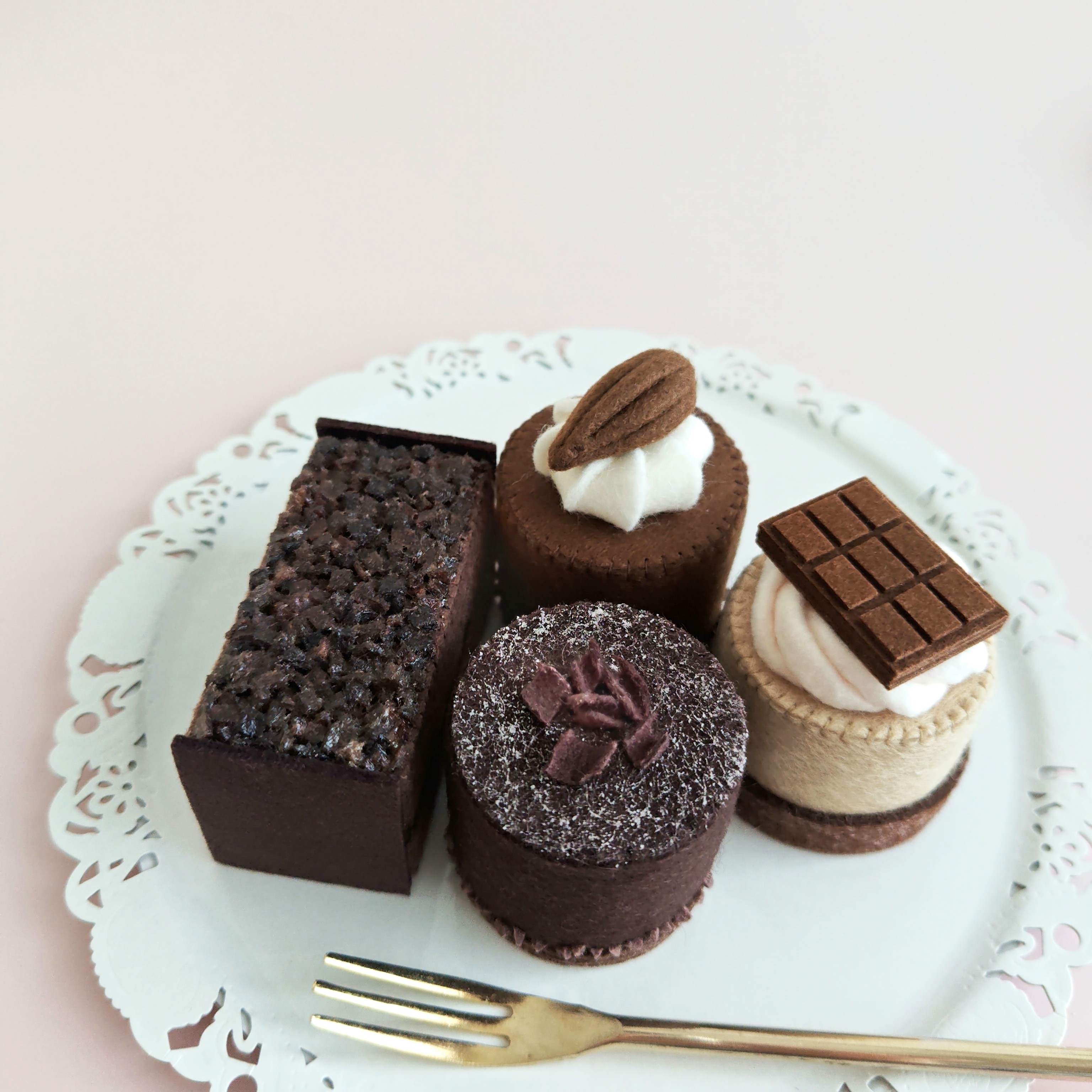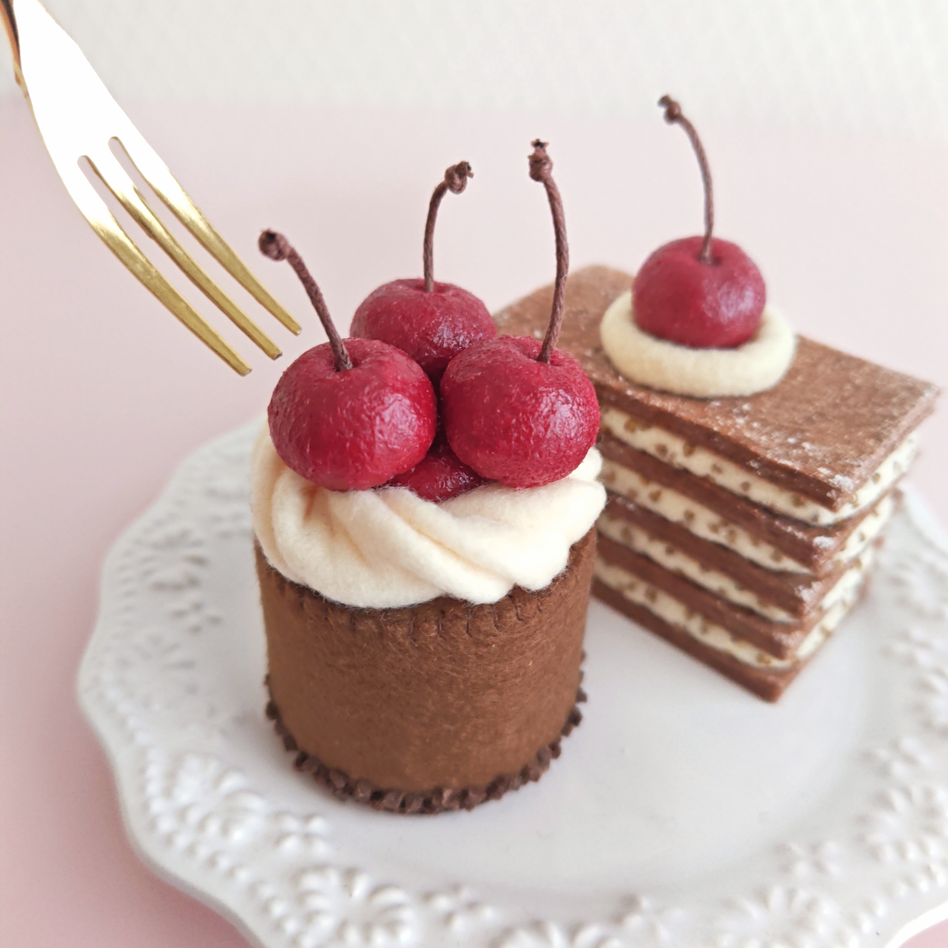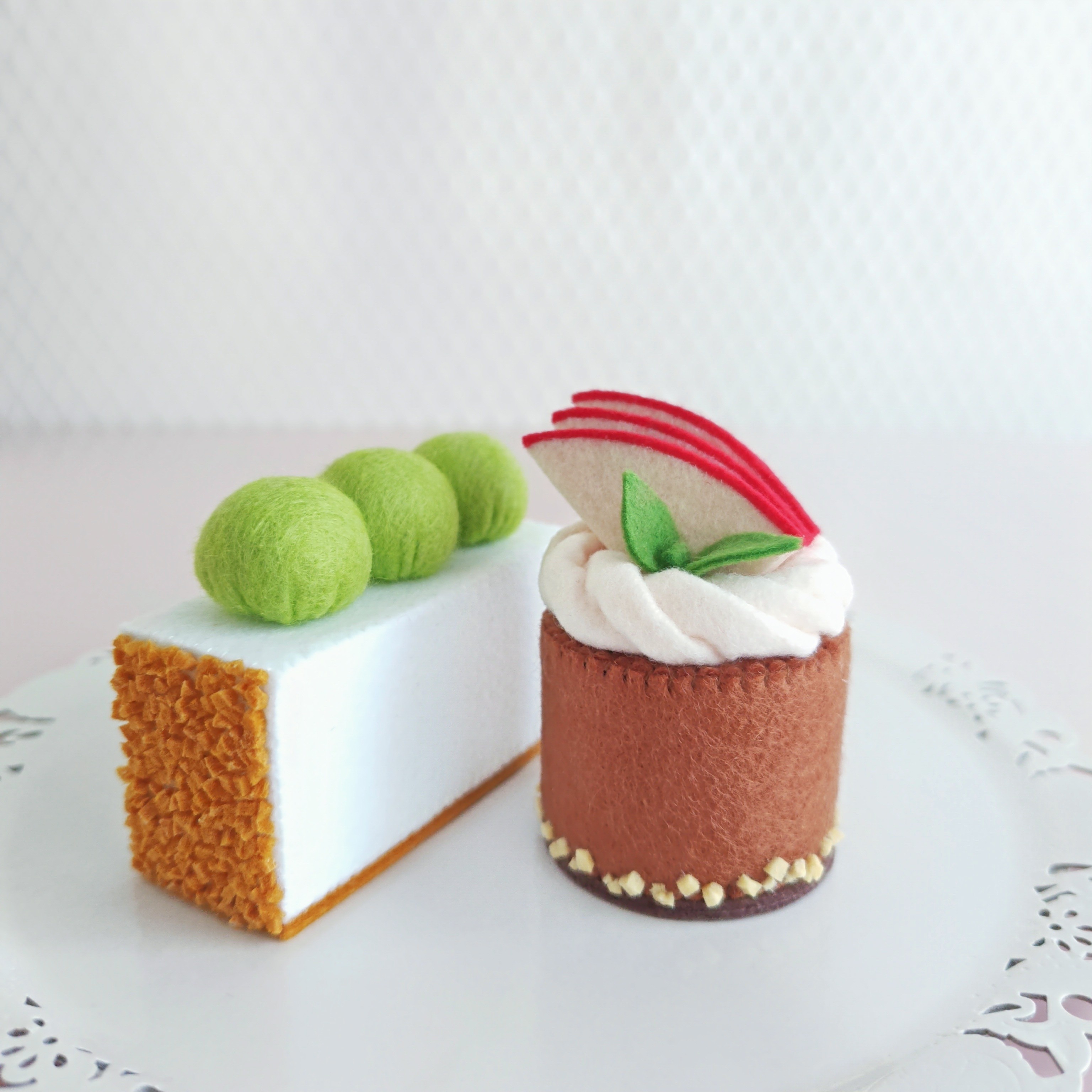 チョコミントのケーキです。ミントに使えそうな良い色のフェルトを見つけたのでチョコミントのケーキを作りました。チョコミントは苦手なので食べませんが、色合いがかわいくて見た目は好きです。チョコミントって名前もなんかかわいい♡