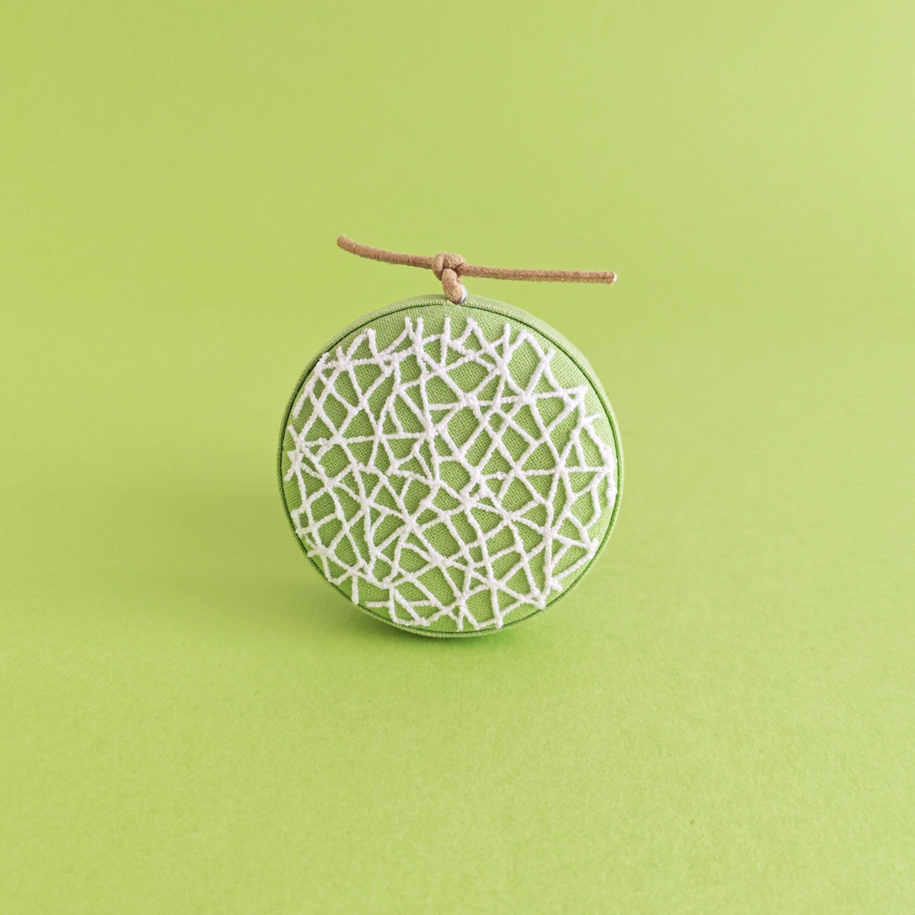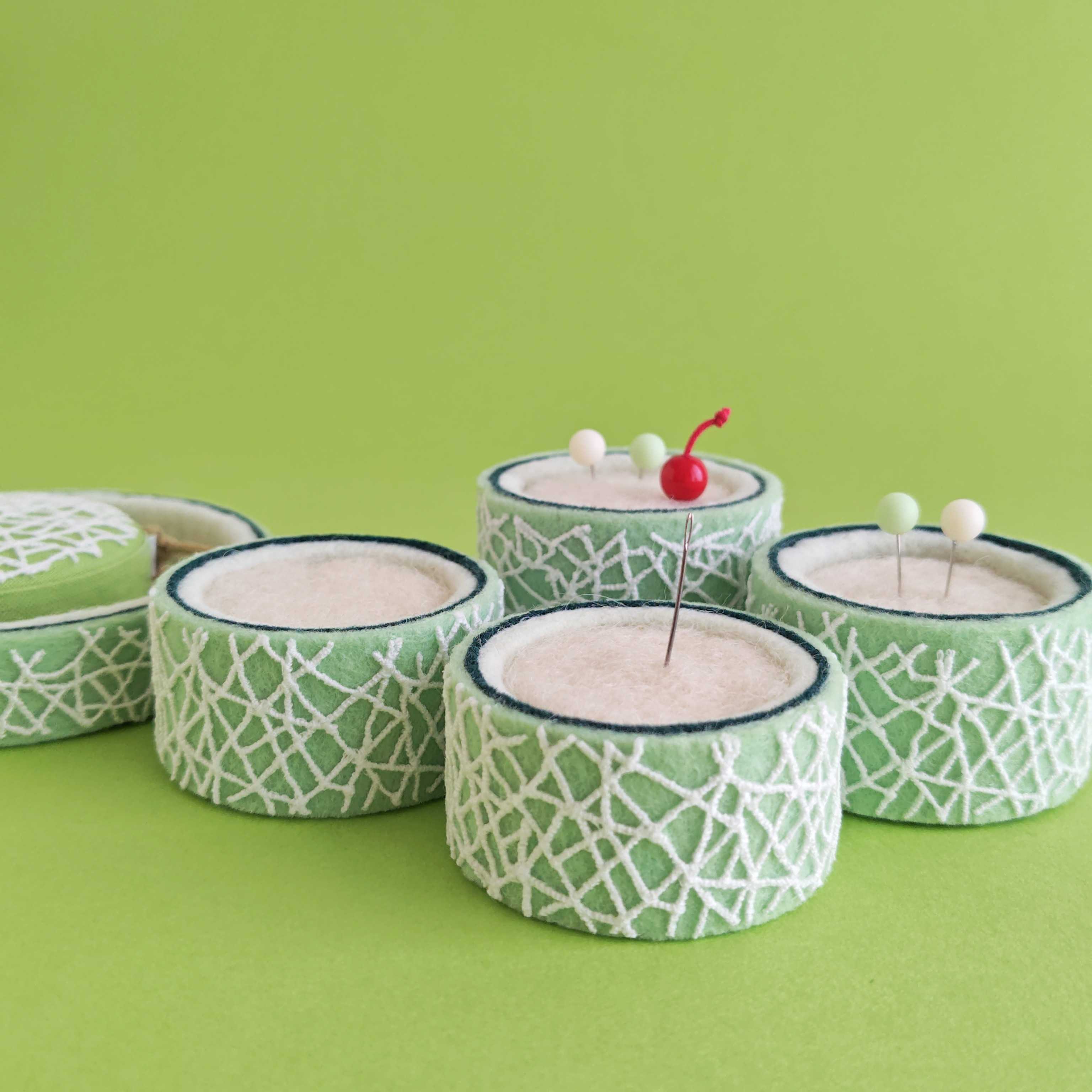 メロンのピンクッションです。メロンなピンクッション。針を刺す部分はフラットに。短い針でも埋まってしまうことがなく丸いドーム型より刺しやすくて使いやすいです。ピンクッション綿は布等で包まずにあえてそのまま入れました。最初は布で包んだものを入れてみましたがフラットではなく少しふっくらしてしまうのと、針穴が目立つのが気になるので布は無しにしました。ピンクッションとして使用するものなので見た目だけじゃなく使い心地にもこだわって作りました。すいかも作ってみました。すいかはピンクッション綿ではなく赤色の羊毛フェルトを入れています。待ち針もかわいいものを作って刺して気分を上げています。(実際に使うのは小学生の時のお裁縫箱に入っていた使いやすいセル待ち針なんですが…)