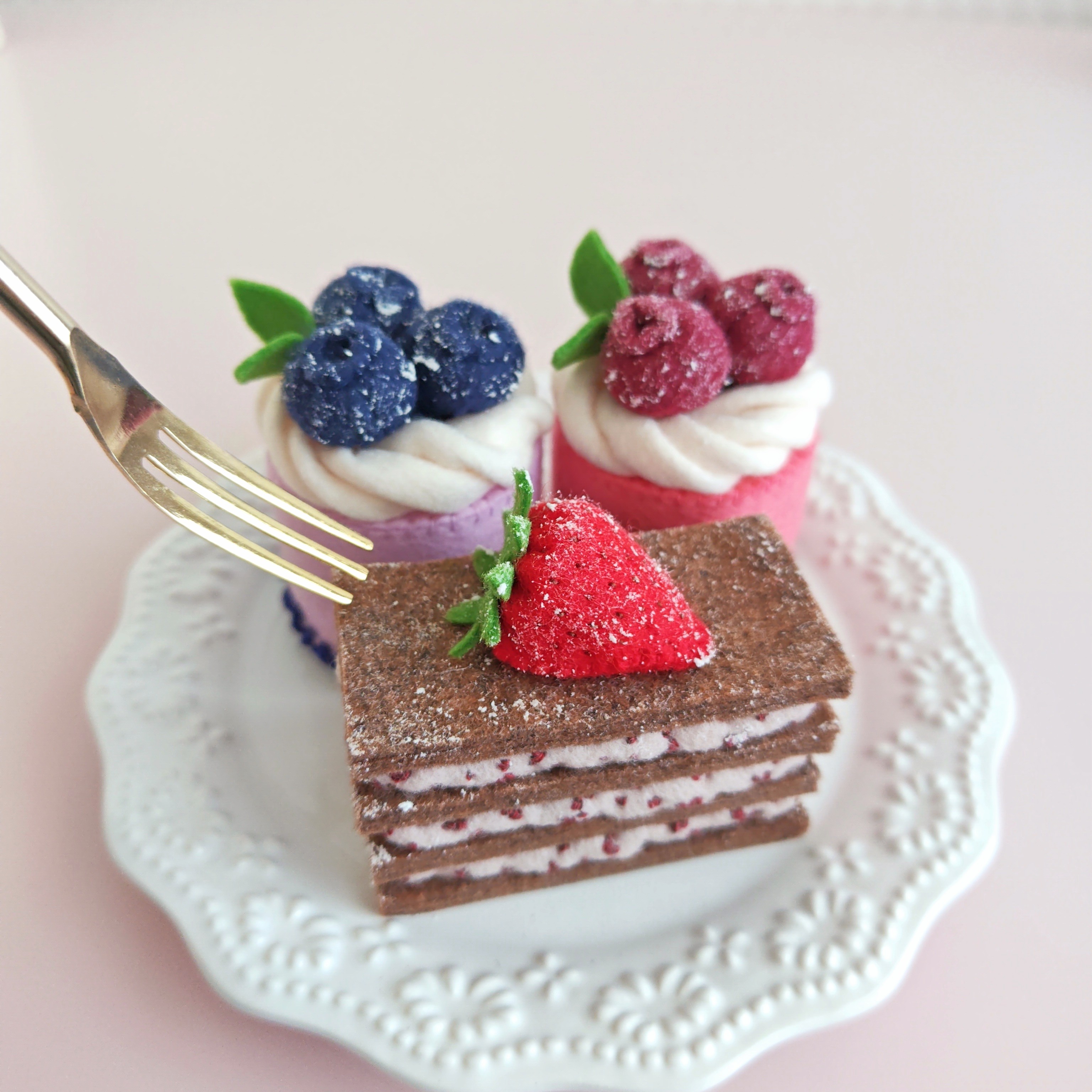 3種のベリーのプティガトーです。今回はお砂糖がけのブルーベリーとレッドベリーのケーキに、いちごのミルフィーユです。リニューアルに伴い、もっと本物のケーキに近づけるようにいちごの型紙をちょこっと変更し粒々の種を入れるようにして葉っぱも付けるようにしました。