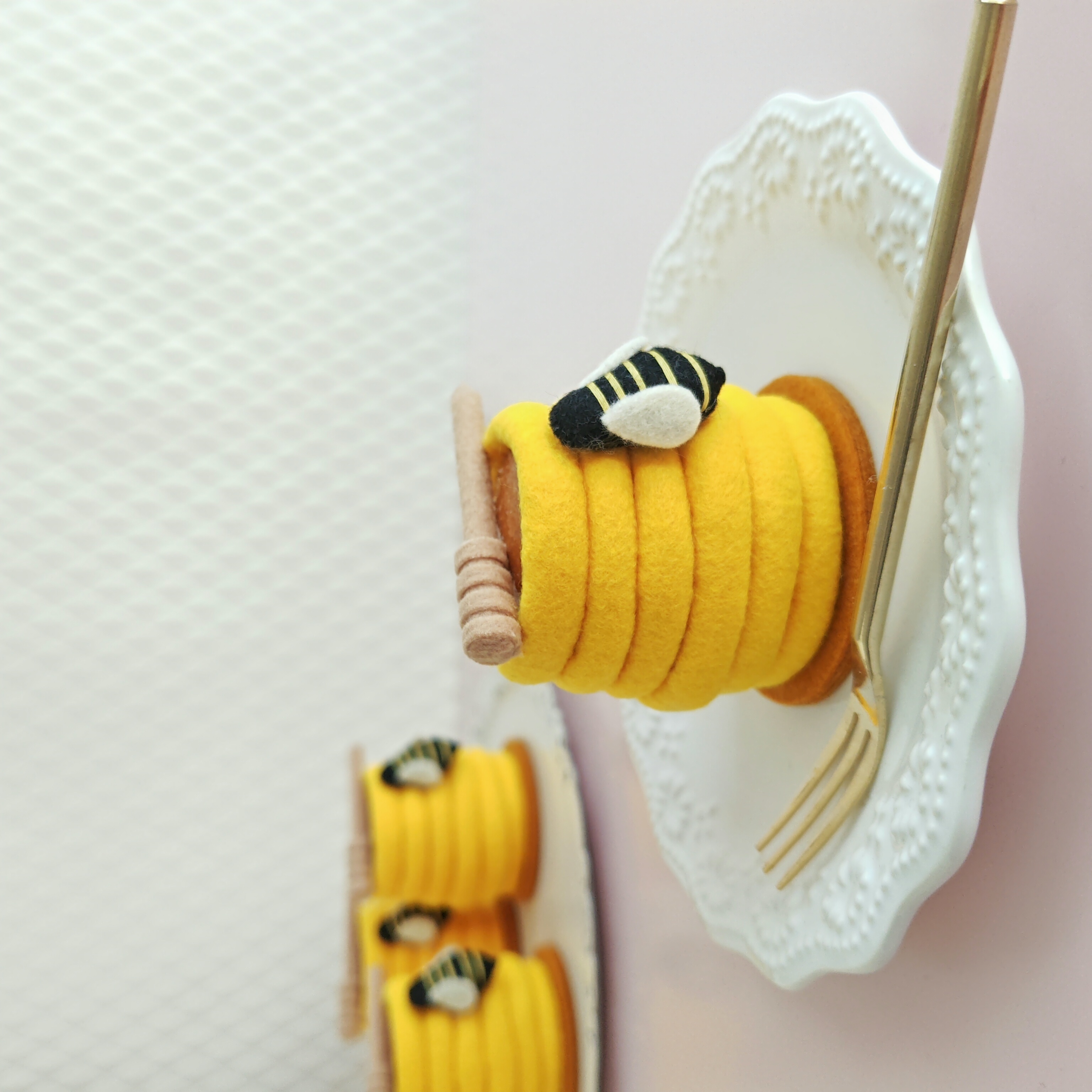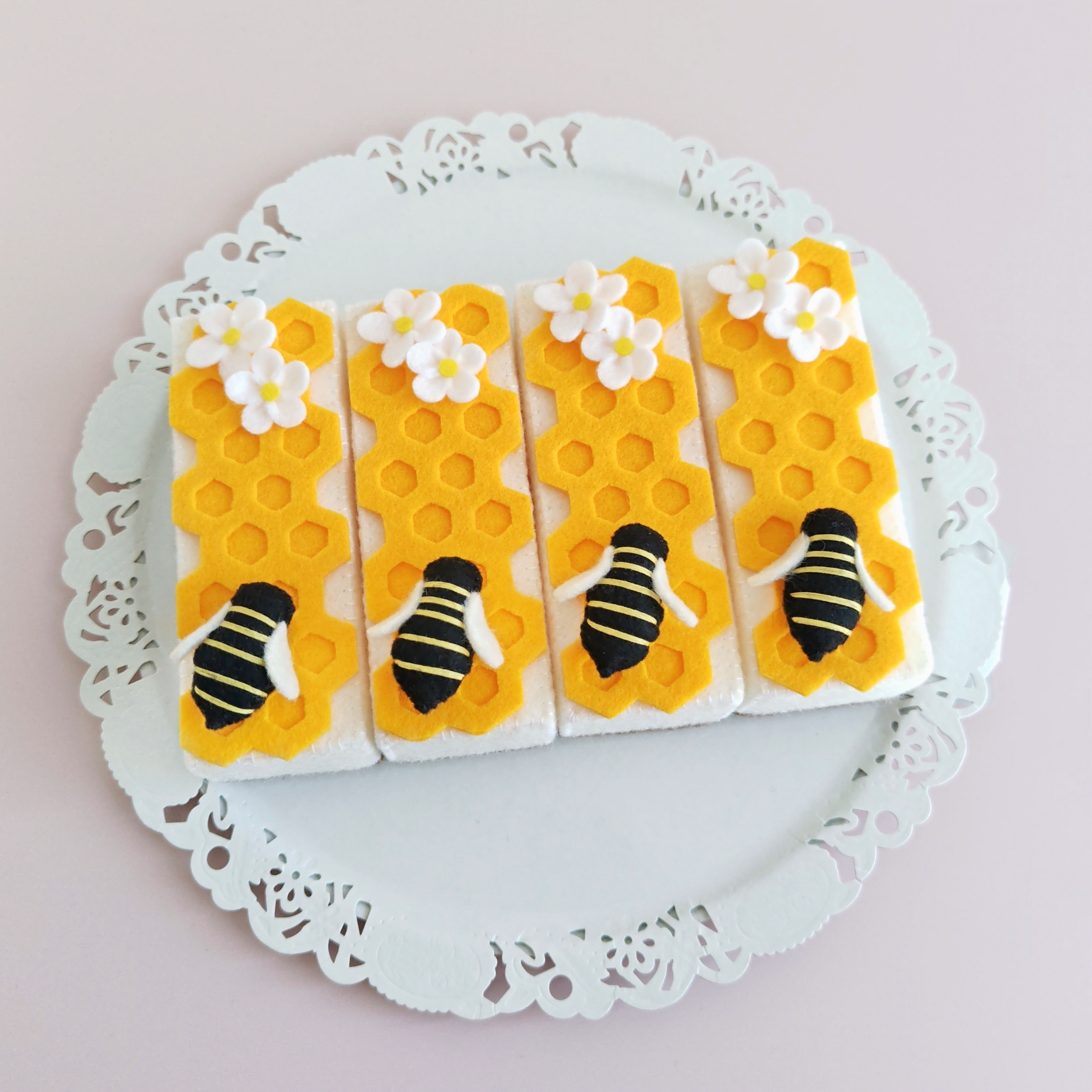 前回のハニーモンブランと合わせて作ったハニーチーズです。レアチーズケーキに蜂の巣に見立てたハニカムクッキーをのせてお花とミツバチを添えました。蜂さん。ハニーチーズとハニーモンブラン。一緒に飾ってもいいね♡