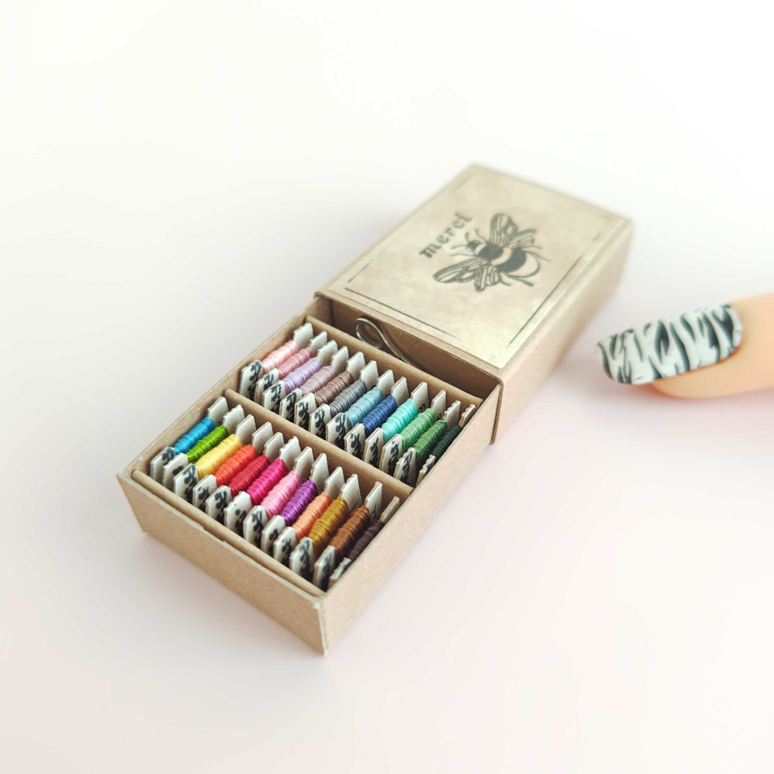 ミニチュアなお裁縫シリーズ♡糸巻き台紙に巻かれた糸24色です。はさみと一緒にスリーブ箱に入れました。糸はシャッペスパンなのでカラー番号も記載しました。小さいけど色見本にもなりそうです。色合わせのため3色は別糸を使ったのでその分はカラー番号の記載がありません。糸巻きのラベルの真ん中(穴のところ)が破けていて、ちょうどそこに色番号が書いてあったのでわからなかったんです。適当に書いてもよかったんですが何となく嫌で。