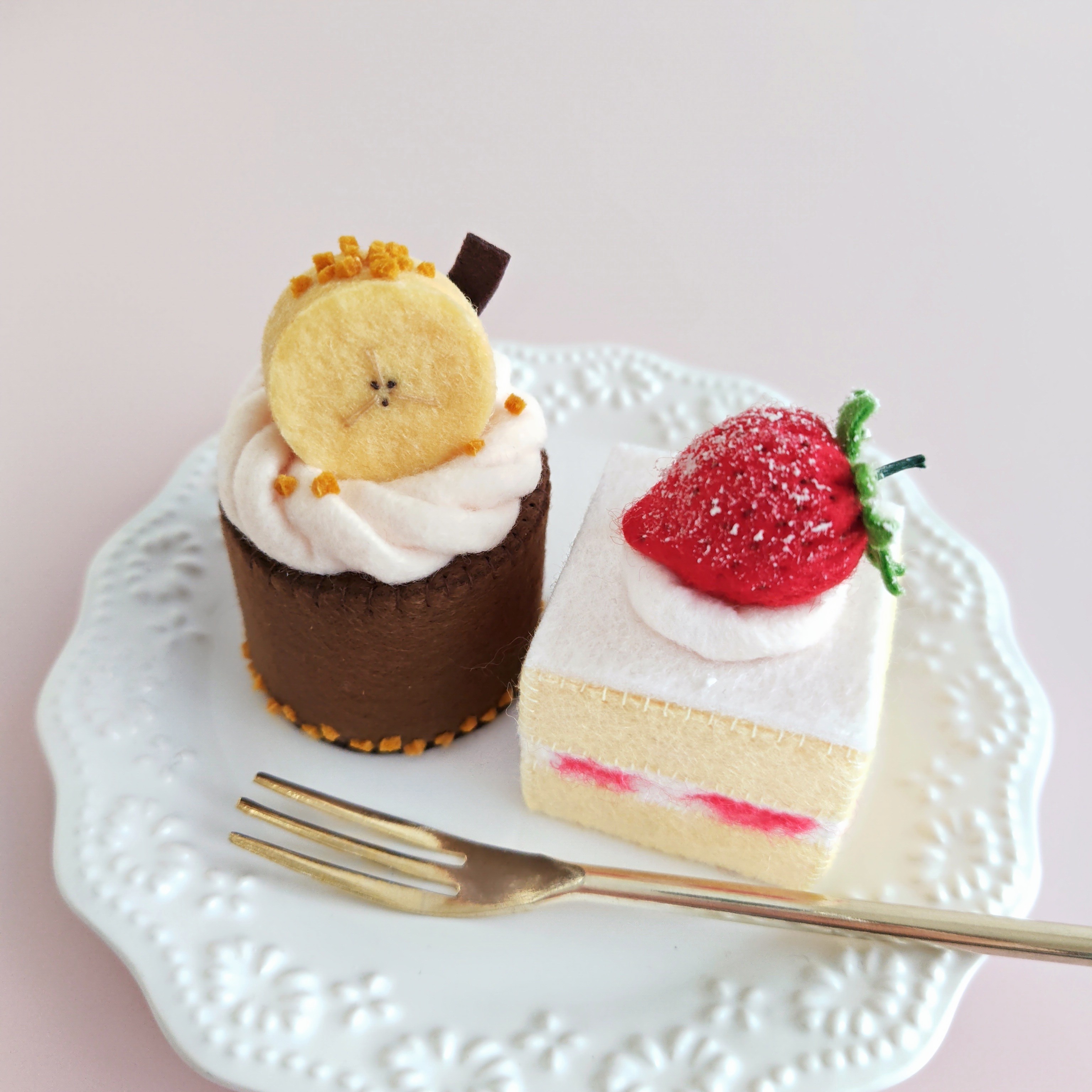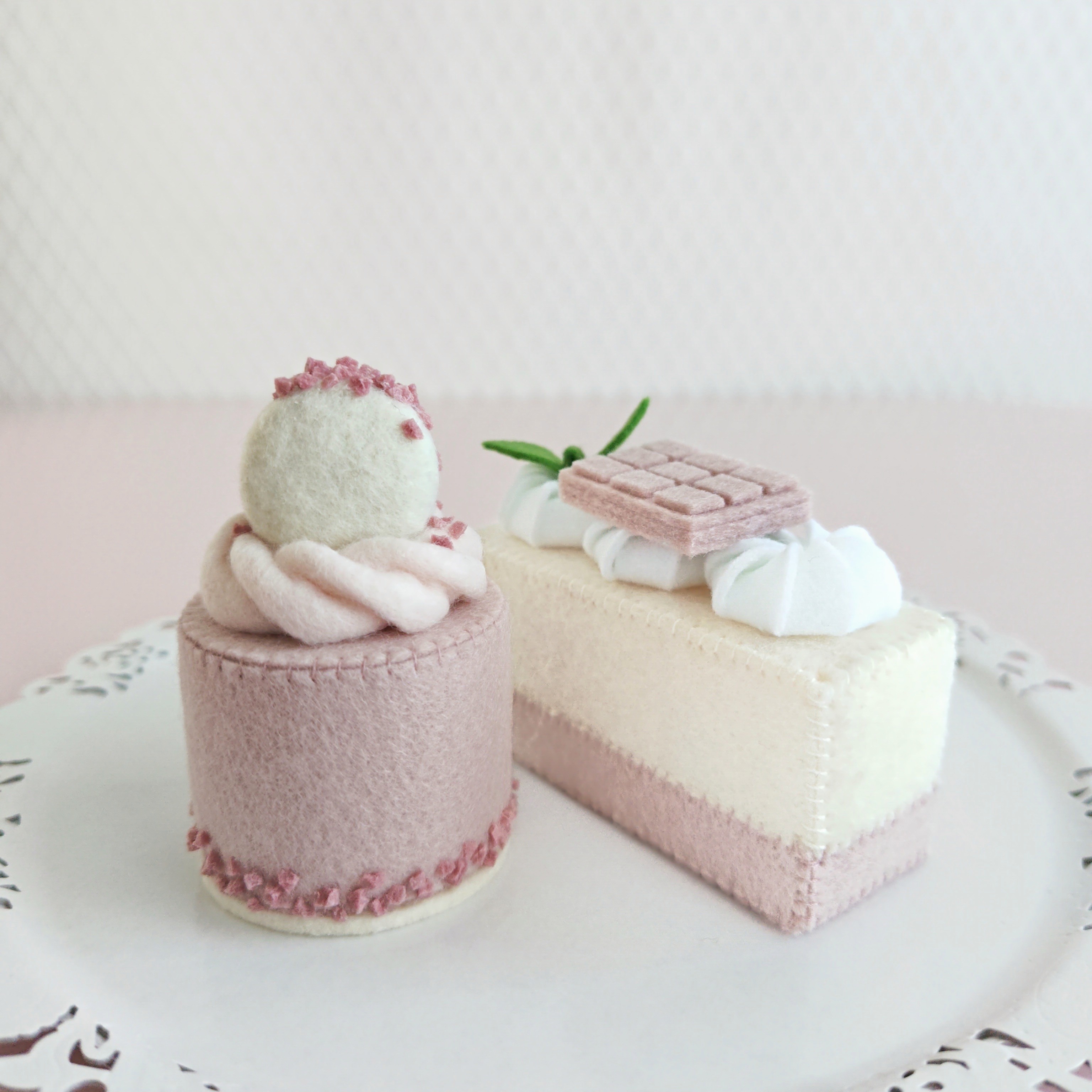 いちごミルクのケーキです。新しいアイボリー色のフェルトを見つけたのでくすみピンクと合わせていちごミルクのケーキを作りました。今回は敢えて果物のいちごを使わずに色で「いちごミルク」を表現してみました。ピンク色のフェルトはいろいろありますが、このくすみ系のピンクが優しい雰囲気で良い色合いのいちごミルクになりました。
