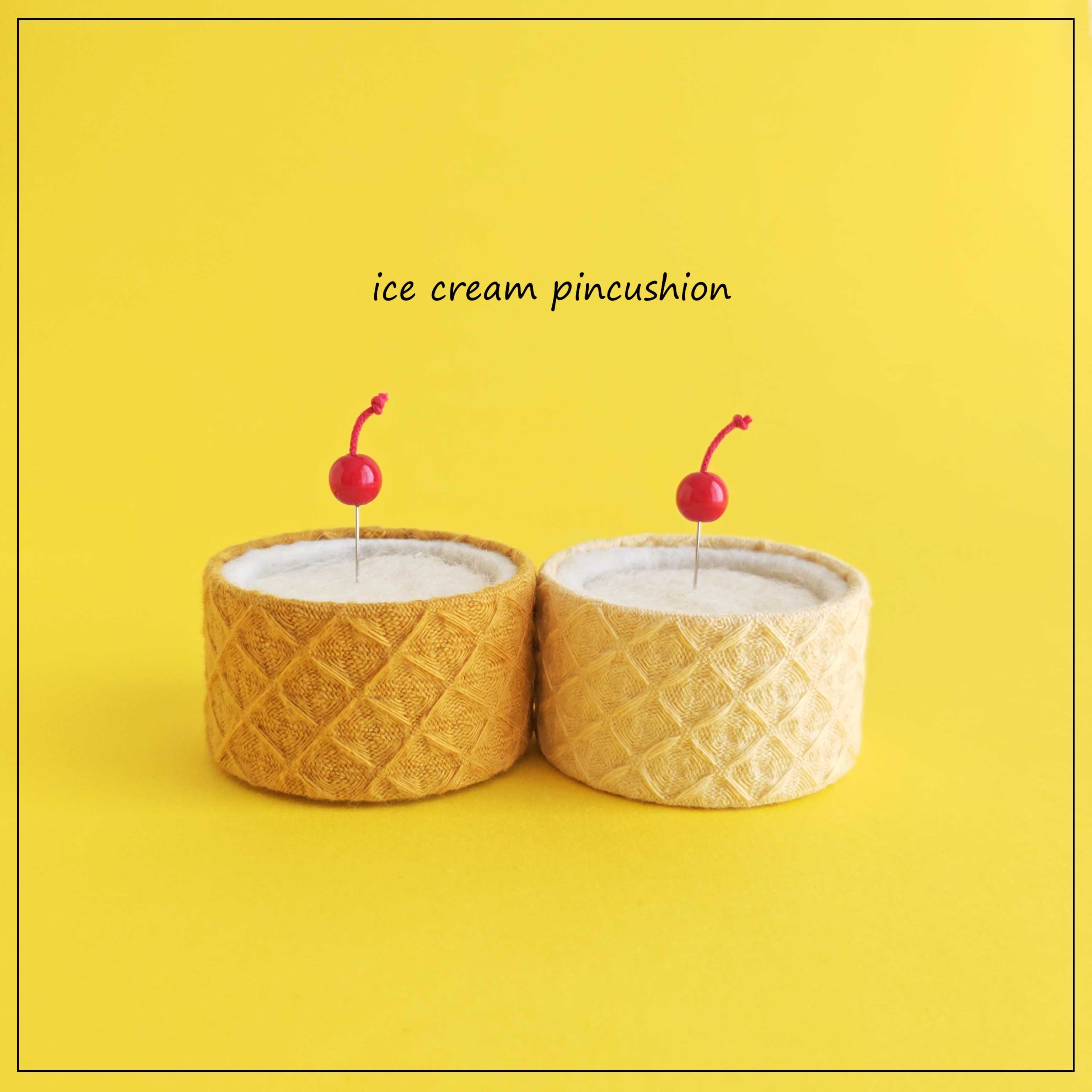 アイスのピンクッションを作りました。ワッフルコーンのカップを作りピンクッションにしました。カラーは2色、どちらかに決めきれず2色作りました。さくらんぼの待ち針も作ってデコレーション。どちらもおいしそうにできました♡