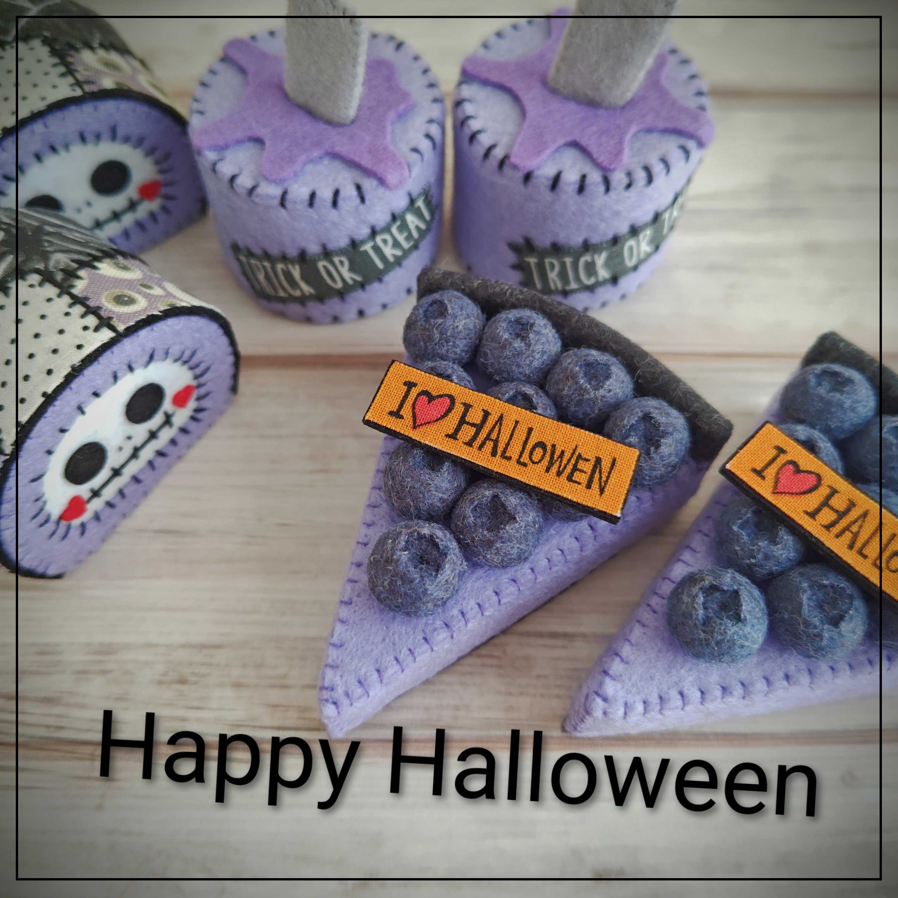 今日はハロウィンケーキ3種のセットです。◎ツギハギ模様☆ドクロちゃんロールケーキ ◎包丁が刺さった☆縫い目入りケーキ ◎ハロウィンカラー☆ブルーベリータルト今回のケーキのカラーはパープルのみになります。