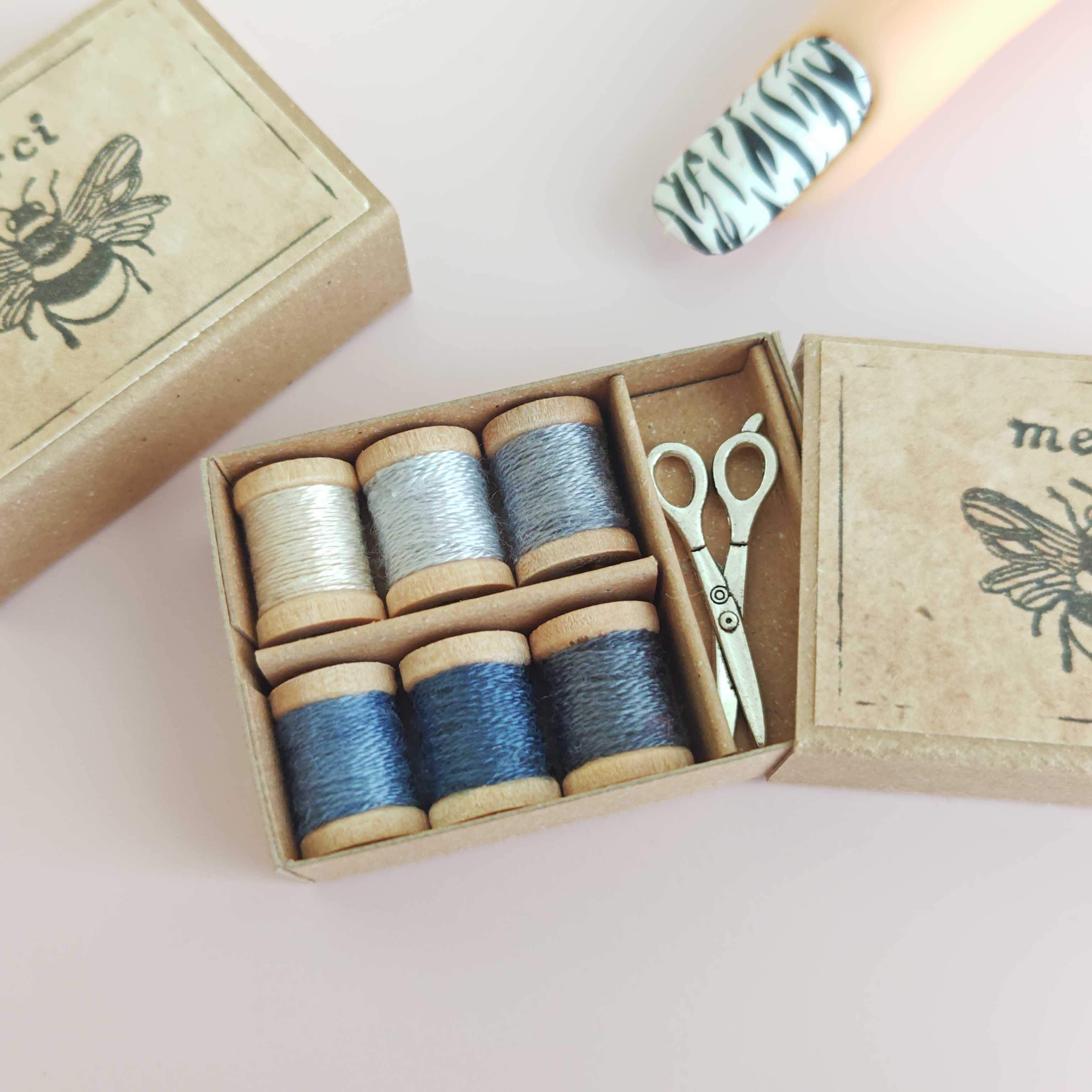 ミニチュアなお裁縫シリーズ♡スリーブ箱に入った小さな糸巻き6色とはさみです。ブルー系とグリーン系があります。久しぶりに小さいものが作りたくなって、以前作った時に残った小さなスプールを引っ張り出してきて糸巻きを作りました。はさみもセットにして箱に入れて、お店で数量限定販売しているような糸巻きセットにしてみました。小さいものってかわいいね♡