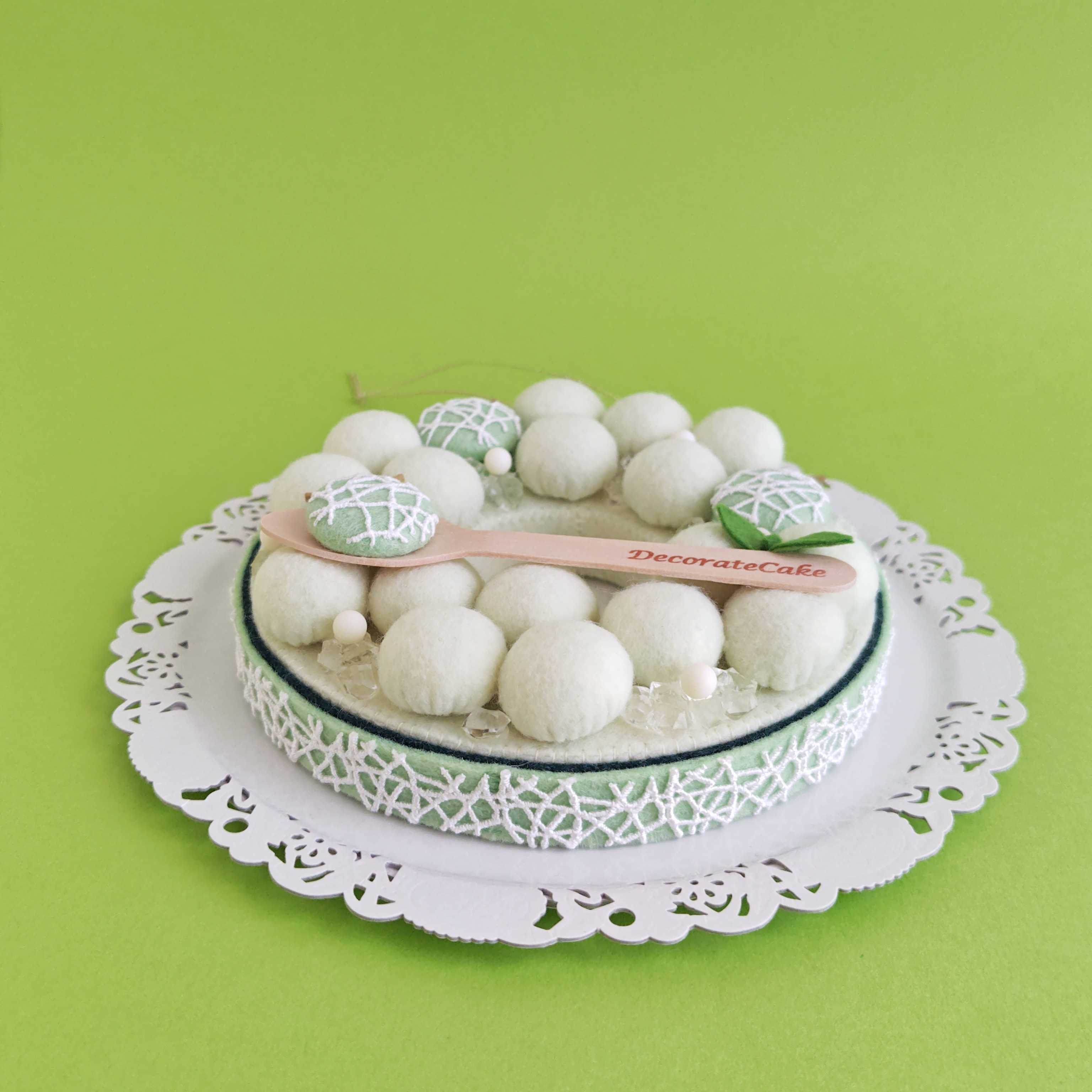 メロンタルトができました。輪切りメロンの土台に、まん丸メロンボール・メロンジュレ・メロンのマカロンをのせたメロンづくしのタルトを作りました。壁に飾れるケーキのリースです。透明なジュレが涼しげです。メロンの網目にはレースを使用しています。このレースを見つけた時にメロンみたいだなと思い、ケーキのリースを作っているところだったのでメロンを作ってみました。めっちゃメロン感が出るのでこのレースお気に入り♡ただいま他のものでもメロンを製作中。次回紹介したいと思います。