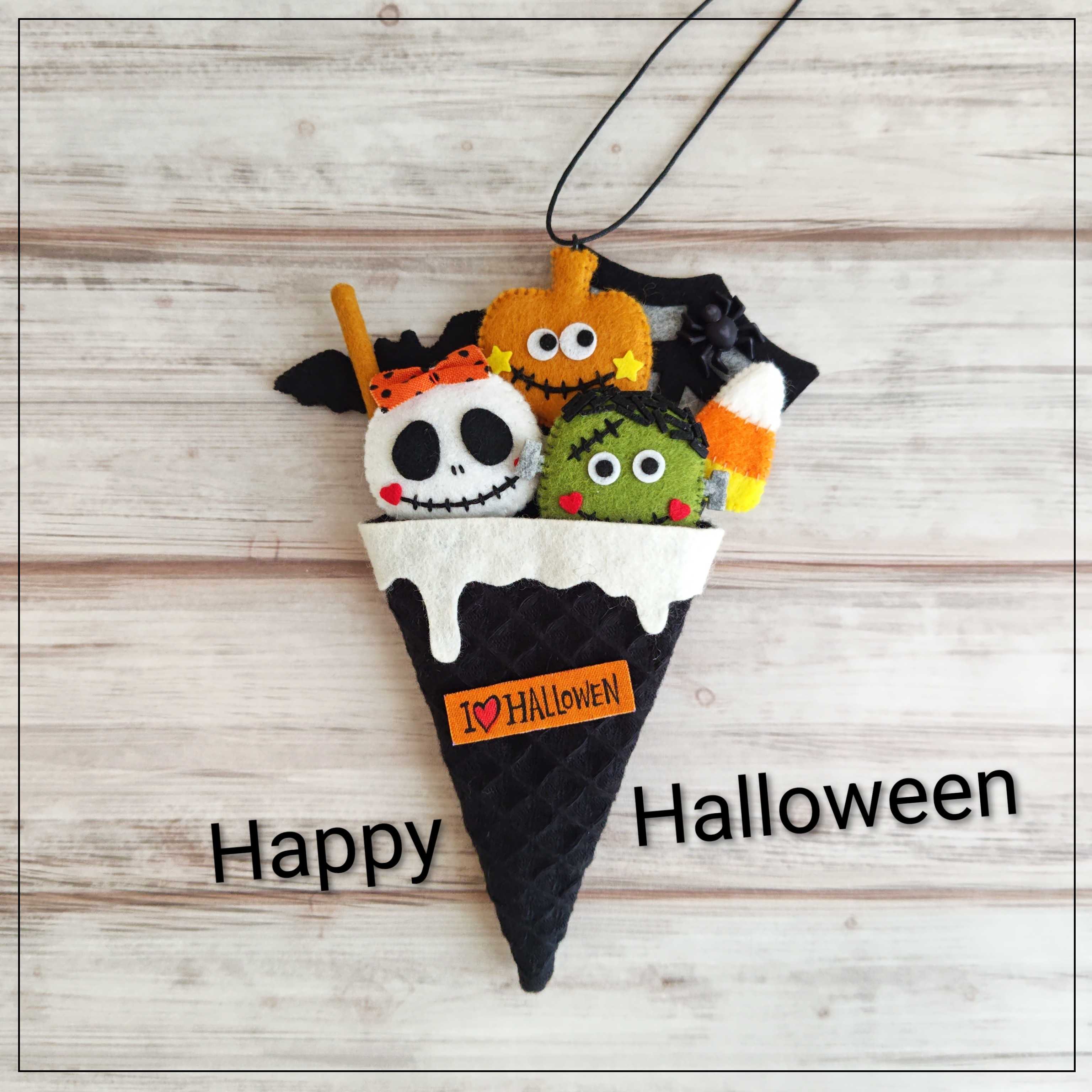 怖くないハロウィンオーナメント☆ブラックカラーのワッフルコーンにハロウィンモチーフを詰め込みました。壁に飾って、ハロウィン楽しんでね~☆