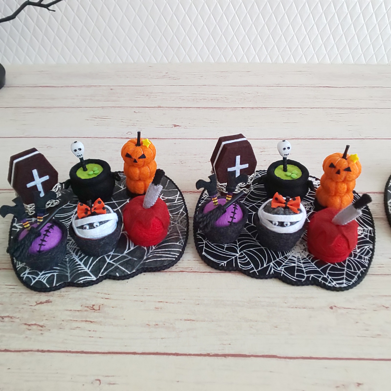 ハロウィンオブジェ6種と蜘蛛の巣柄のパンプキンプレートのセットになります。