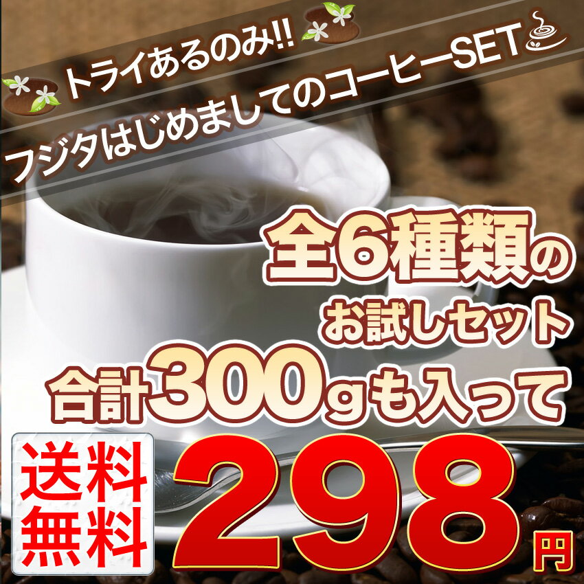 6種類が50gずつ入って合計300gで送料込298円です。 先月末に期間限定ポイントで購入してみました。 普通に美味しいコーヒーでした。 15日までのポイント利用に困っている方にはいいかもしれません。 お試しコーヒー福袋★お一人様1点まで【送料無料】◆6種類入ったコーヒーセット【300g