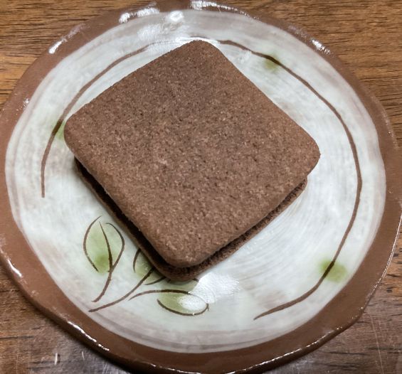 生チョコをチョココーティングしている物をクッキー生地で挟んであります