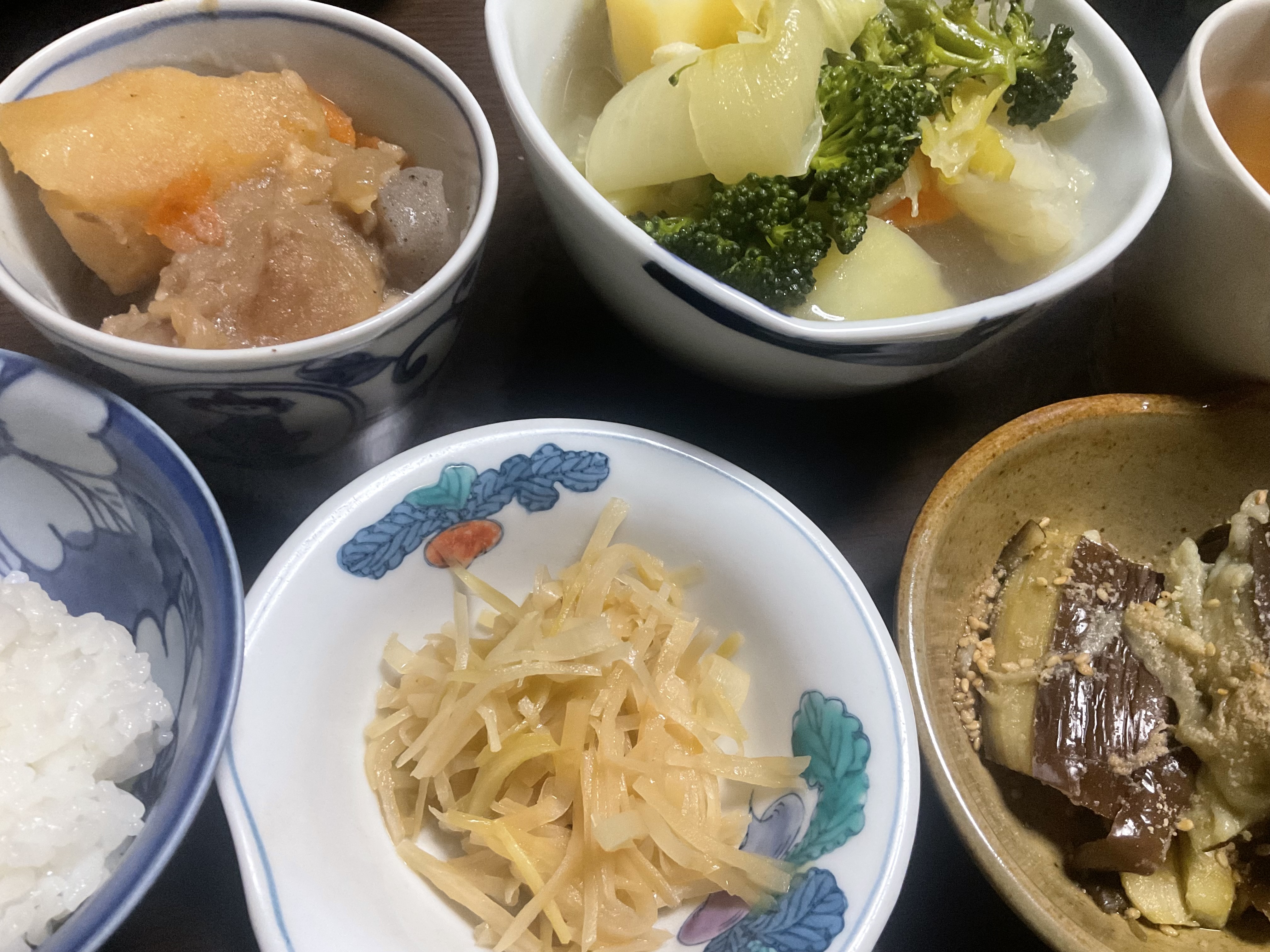 おばんです寒すぎて、買い出しに行く気持ちがしなしなと、失せてしまった夕飯ですそゆこと、多いですよねしょうがないので、冷蔵庫にあるもので済ませました〜ポトフ 茄子の胡麻和え 大根の皮のきんぴら 肉じゃがは残り物です茄子は安く手に入れたし、大根の皮は自家製 ブロッコリー🥦 カブ、ニンジン🥕も自家製でウインナー代のみの夕飯ですわ1人100円かかっておらず、めちゃくちゃ安上がりですいつもこうだといいのですが〜〜ごちそうさん