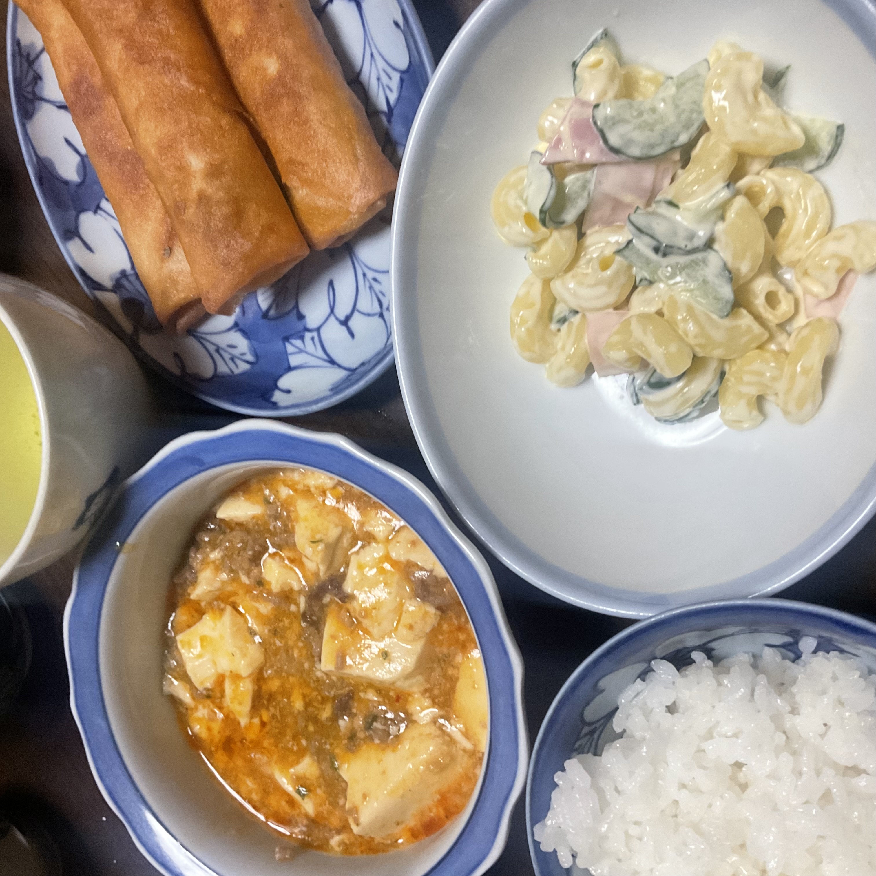 おばんですこの冬、夜にドライヤーを使うと、必ずブレイカーが落ちるんですどうなっているの?我が家はと思うけど、アンペアはあげるのはやめておこうと思うわけであげたらみんなして、もっと電気使うだろうなと思うんです今だって、もう、本当に電気代払うの限界なのよおおおおおお😵と、叫びたいくらいよ😭みなさん、どうされているのでしょうねさて、そんな今日の夕飯は…麻婆豆腐 マカロニサラダ 春巻き麻婆豆腐とマカロニサラダは孫ちんが食べるんで、なるだけ食卓にのせています何しろ、安上がりですし〜〜春巻きは市販のものですもはや、手作りする気力がありませぬごちそうさん