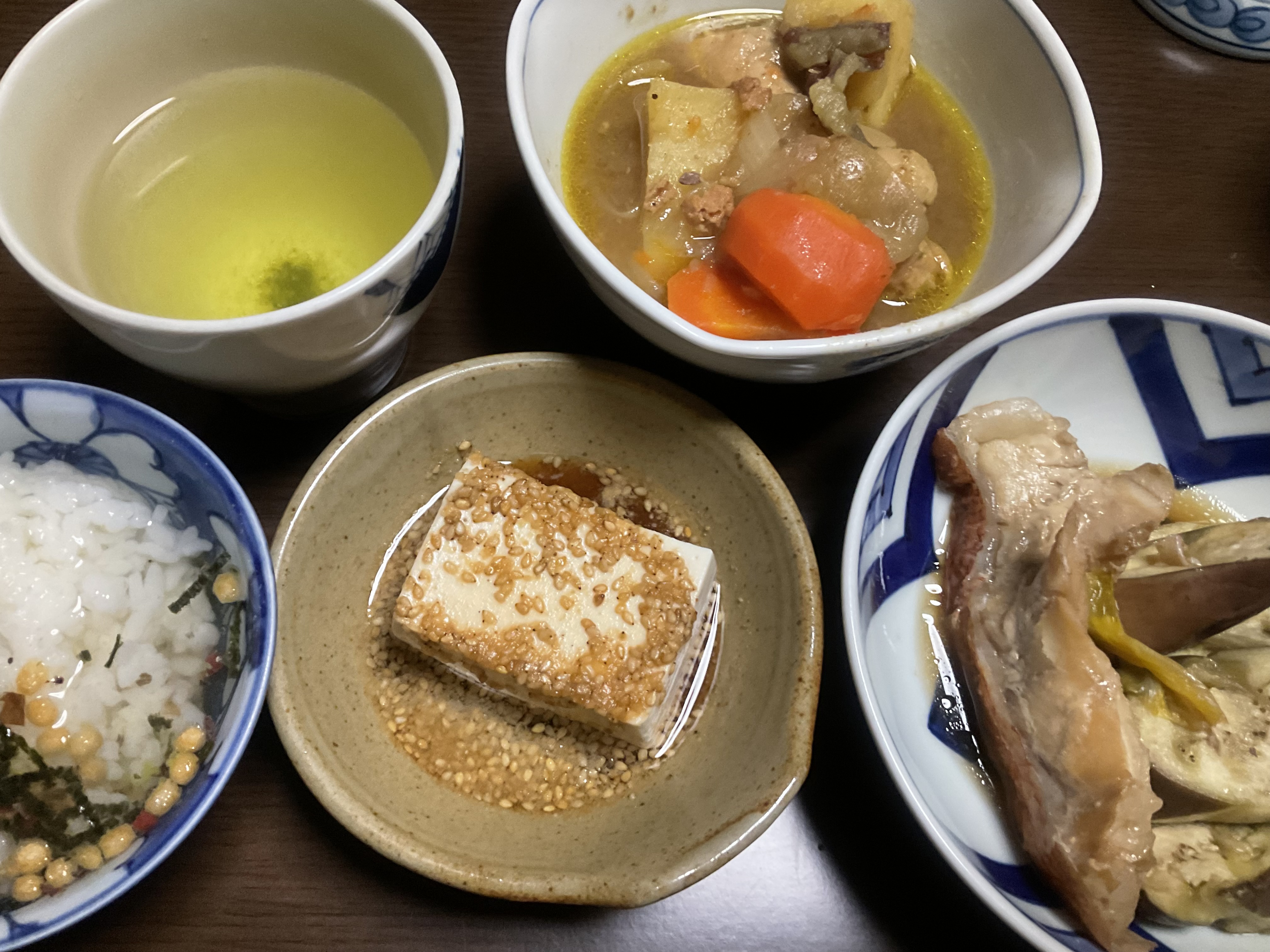 おばんです先日から体調不良だったもので、胃に優しいを目指しましたよ湯豆腐 赤魚の煮付けカレーの残りからの、鶏肉とサツマイモのスープ冷やご飯がたくさんあったので、お茶漬けに私、お茶漬け大好きなんです❤️ワサビに、紅鮭も忘れずに入れますごちそうさん