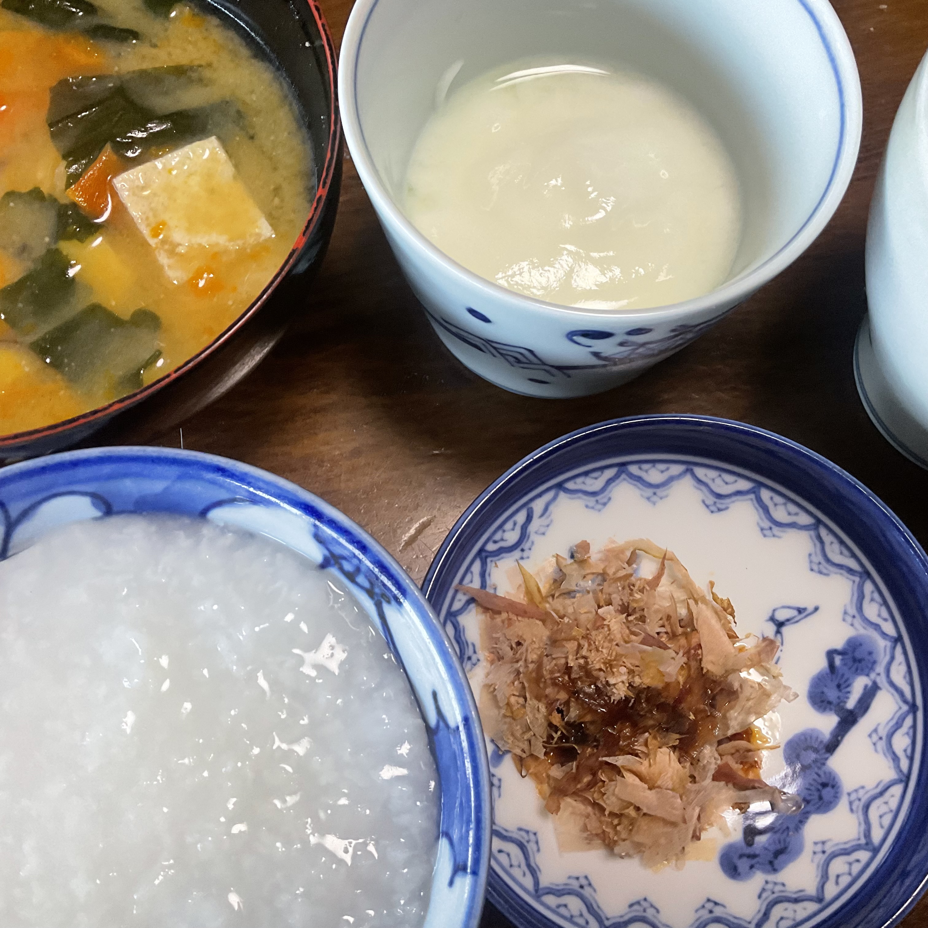 おはようございます🌞孫から嘔吐下痢をもらって、相変わらずお粥生活です孫はすっかり元気になりまして、それは良いのですが見ているだけで目が回りますお粥に鰹節味噌汁が追加されましたあと、ヨーグルトもね元気な盛りの孫を見るのは本当に骨が折れます叔母夫婦は七十過ぎて孫2人面倒見ているので、尊敬するばかりなり