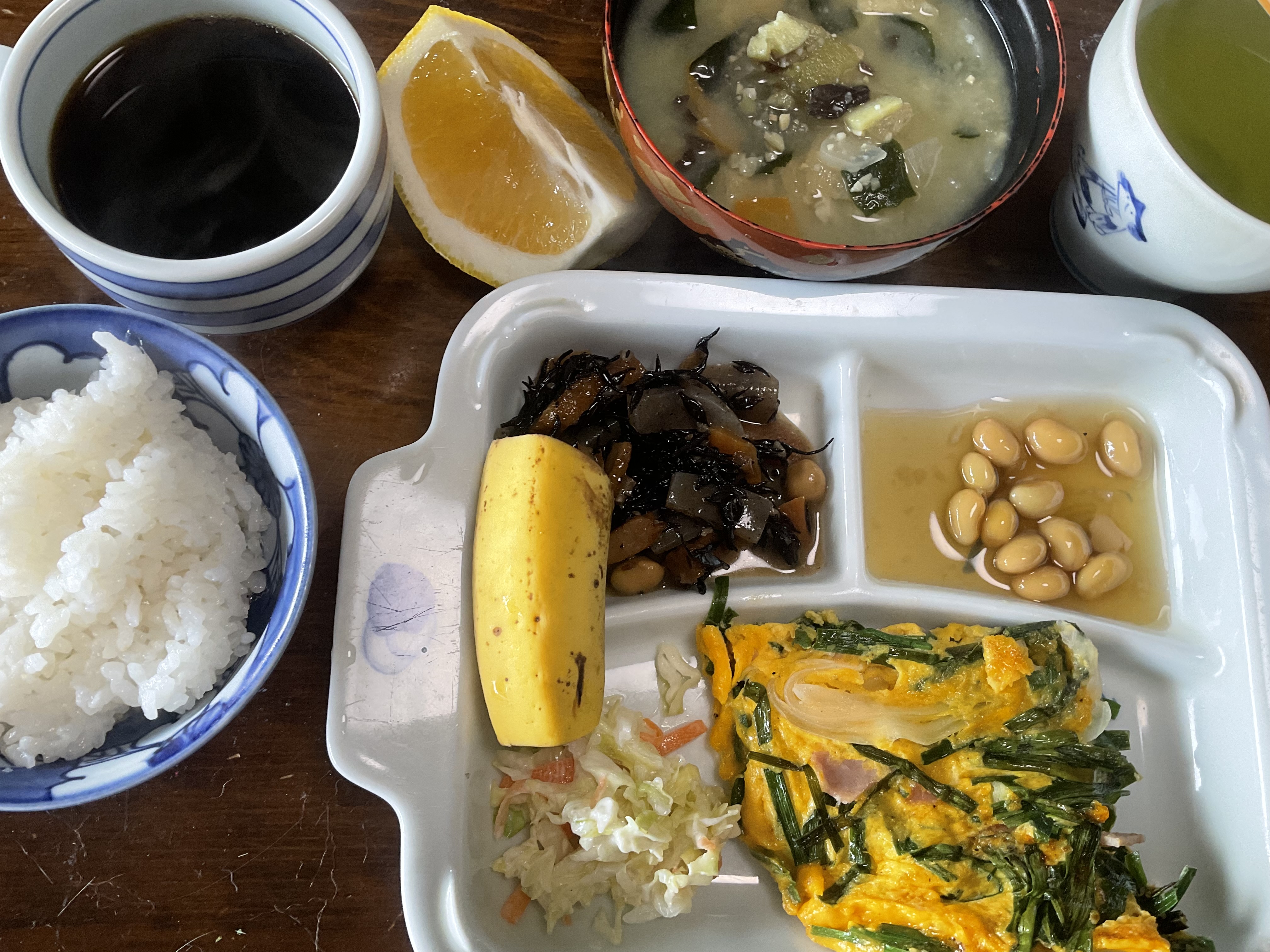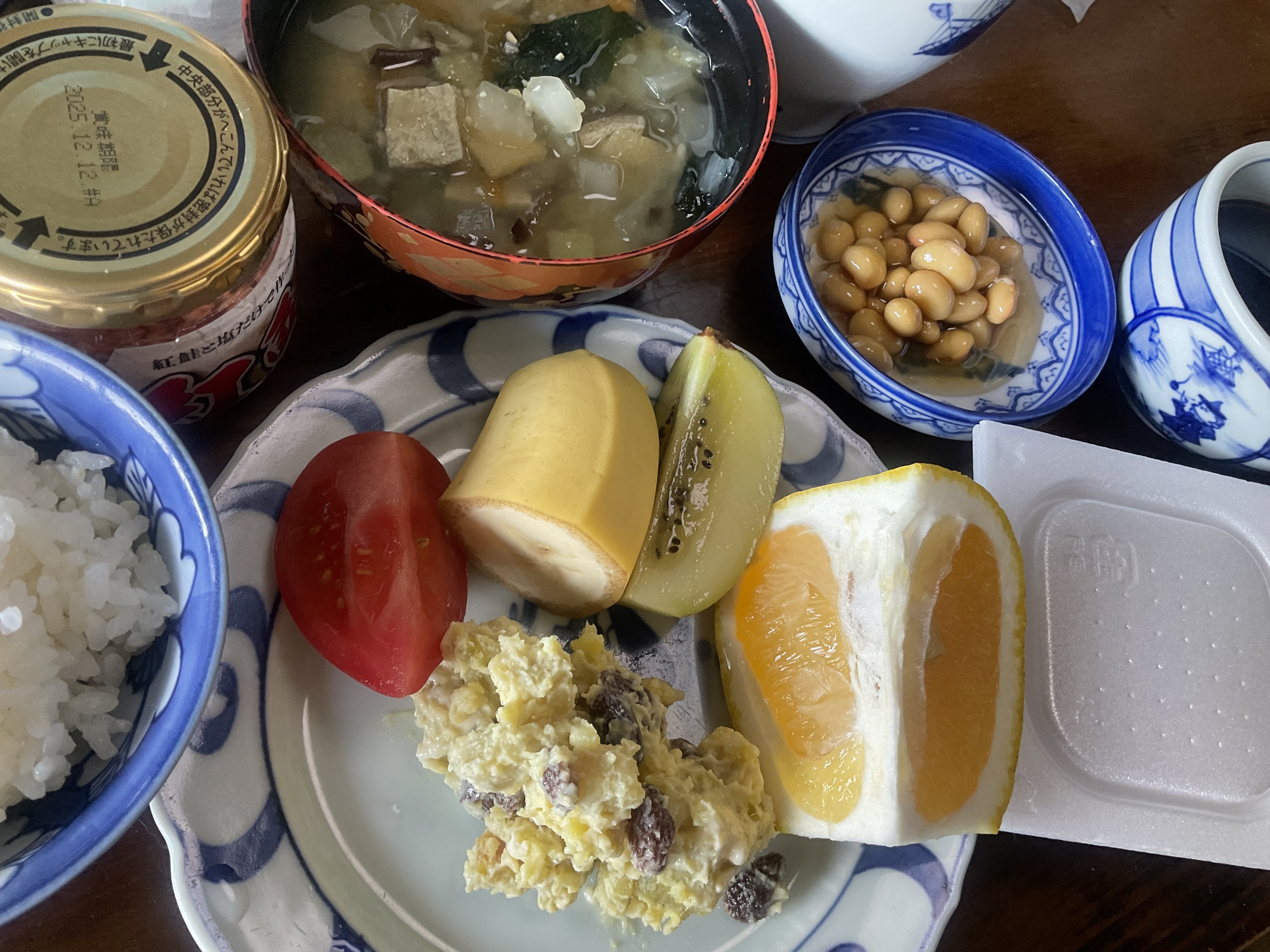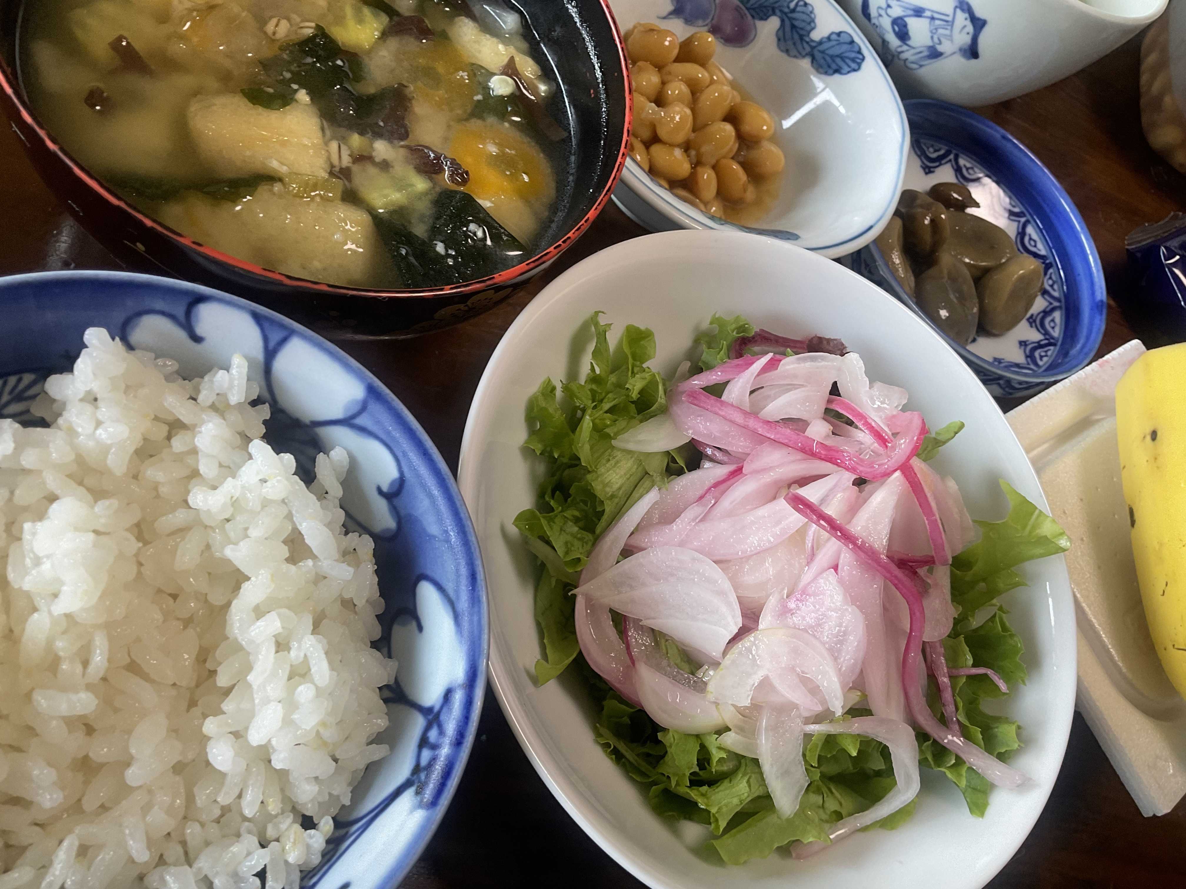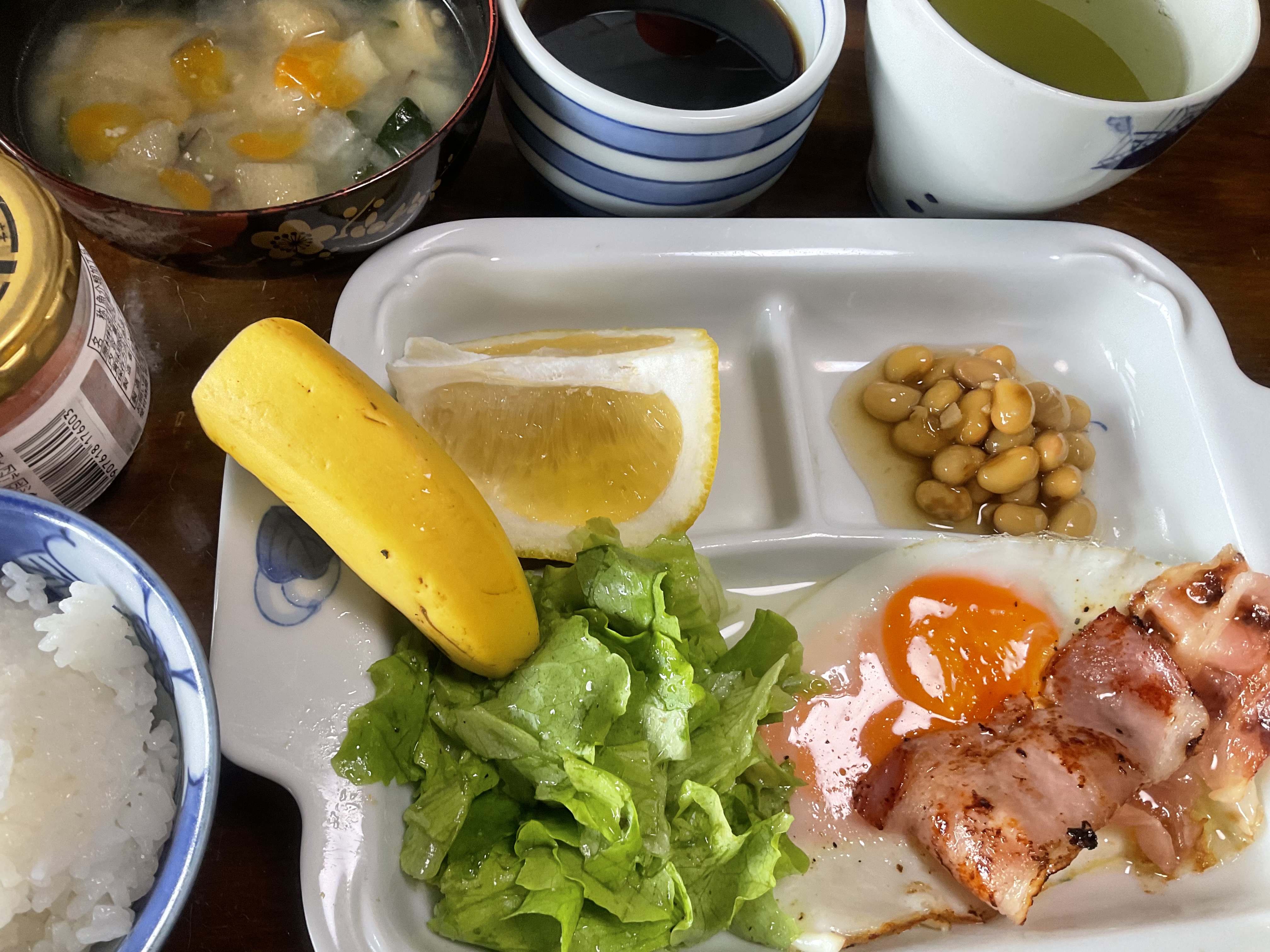 おはようございます😃なんか疲れが取れなくて、昨日は8時ごろねたのに、今日も目が覚めませんでした8時に起きたので、なんと睡眠時間12時間⏰どんだけ農作業こたえてるんだ……そんなわけで、Gさまらが作ってくれた朝ごはんです☀️味噌汁 目玉焼き🍳 ぶどう豆などなど自分で作らないと美味しい😋そろそろ田植えの準備で、本当に日々疲れていますごちそうさん
