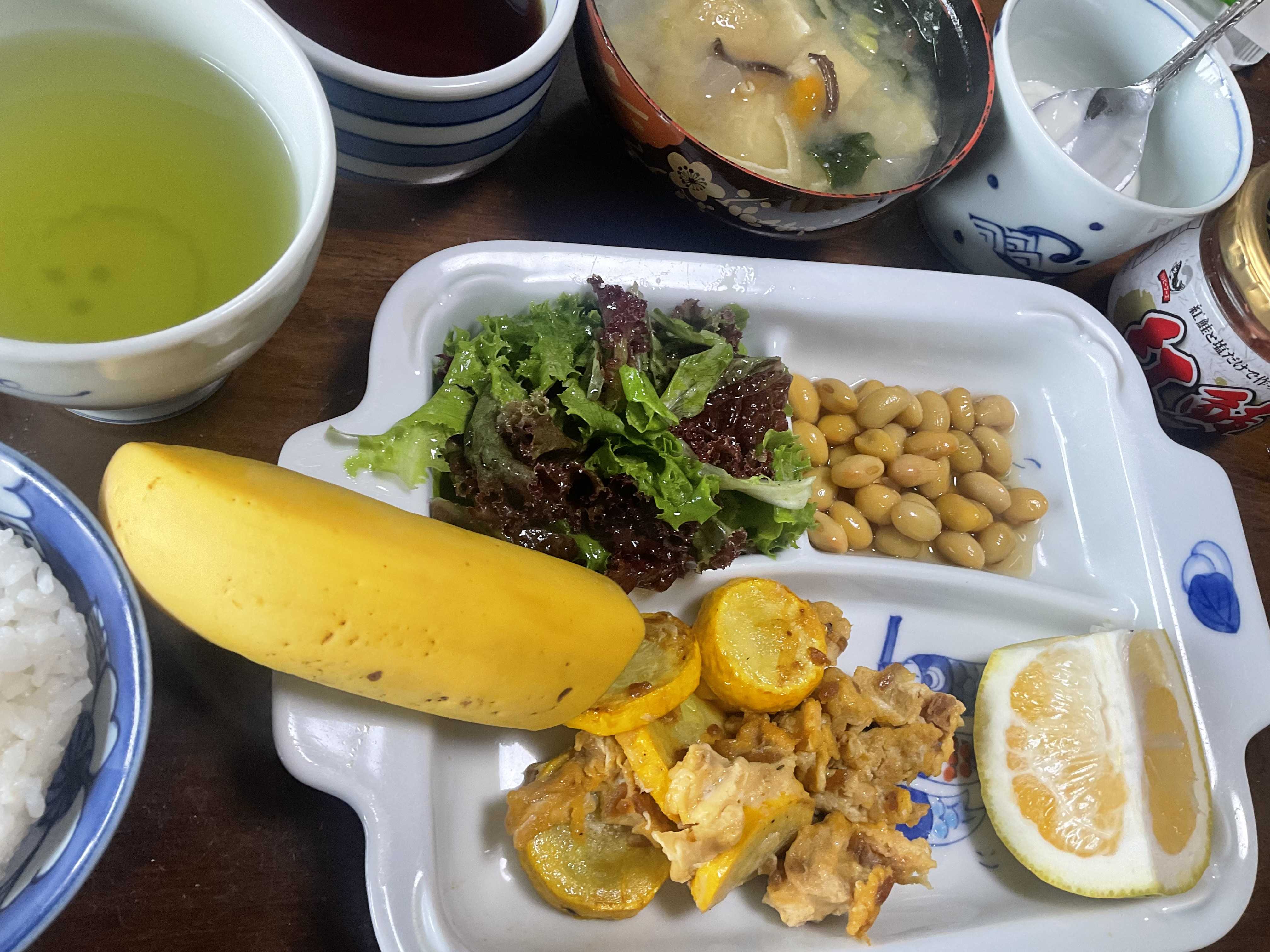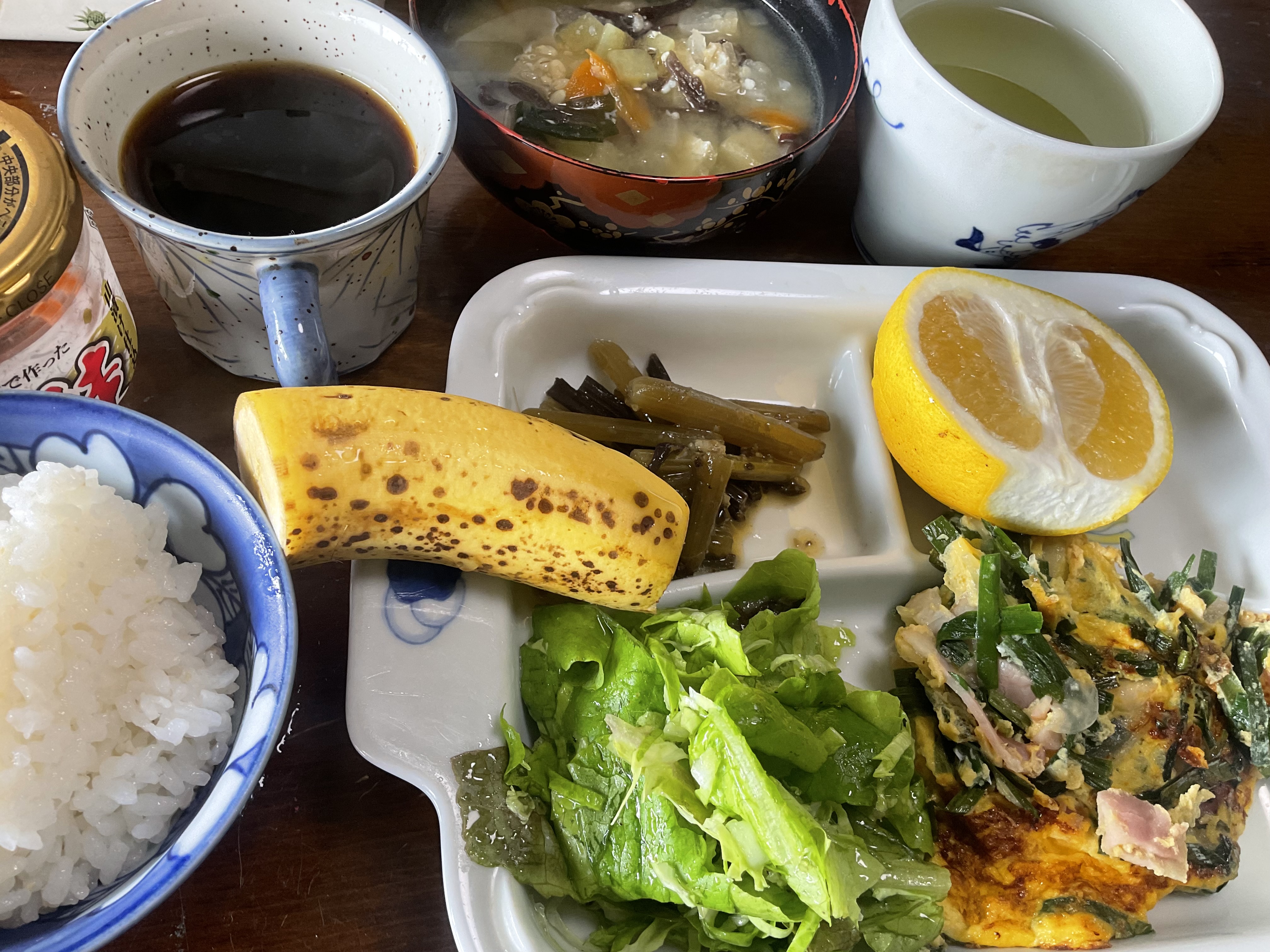 どもです日曜日なのに、特に予定がないまあ、こんな日ばかりなんですけどねもうじき、いやでも田んぼが忙しくなりまする韮大量オムレツ ニラは無料なので😉レタスのサラダ🥗 蕗の煮物 味噌汁今、畑にニラが大量ですレタスに蕗に玉ねぎも自家製なり卵とベーコン、バナナ🍌は買ってきたよ〜〜ごちそうさん