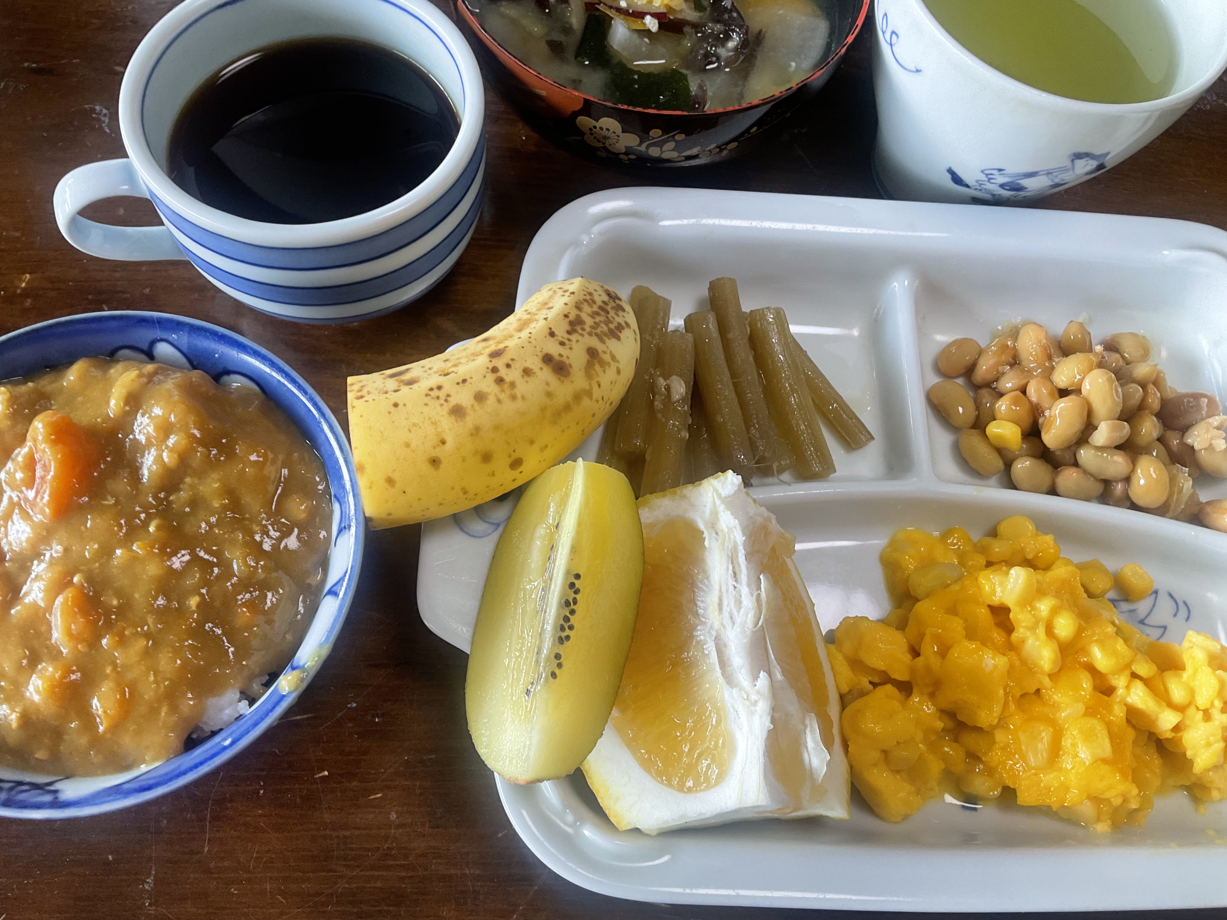 どもですあっという間に水曜日ですね昨日は、博多座のダンスオブバンパイアの特別先行販売のこと、うっかり失念していて、買い損ねました愕然としつつ、朝ごはんです🍚全部のせてから、妙に黄色いことに気がついたせめて、キウイフルーツくらい緑だったら良かっただに…コーンいりスクランブルエッグ 蕗の煮物 ぶどう豆 味噌汁キウイフルーツは100円の時に奮発して買いました〜大豆や蕗は自家製ですカレーは豚肉で。この頃残りがちなので、少し量を減らそうと思った次第ですごちそうさん