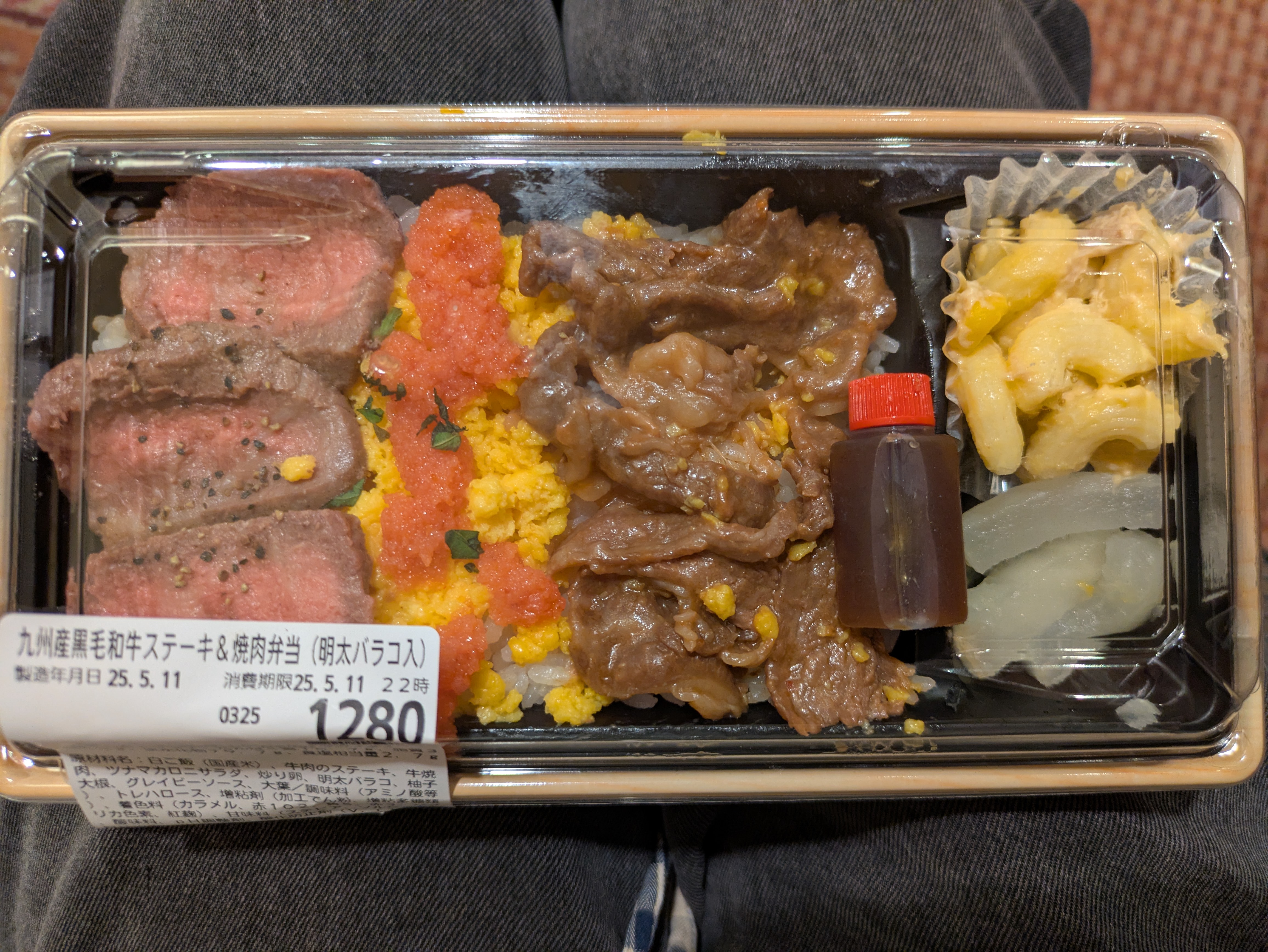 どもです博多座に行くたびに気になっていたステーキ弁当いつも、ぎりきりで行くから、売り切れていたんですよねばってん今回は気合い入ってたんで、1時間前に到着、みたいなお陰で、余裕で買えました🎶ステーキ弁当🍱1280円なりでも、ちょっと小さめで、Gさまには足りなかったはず幕間に、豆腐ドーナツ買ってしまいました♫ごちそうさん