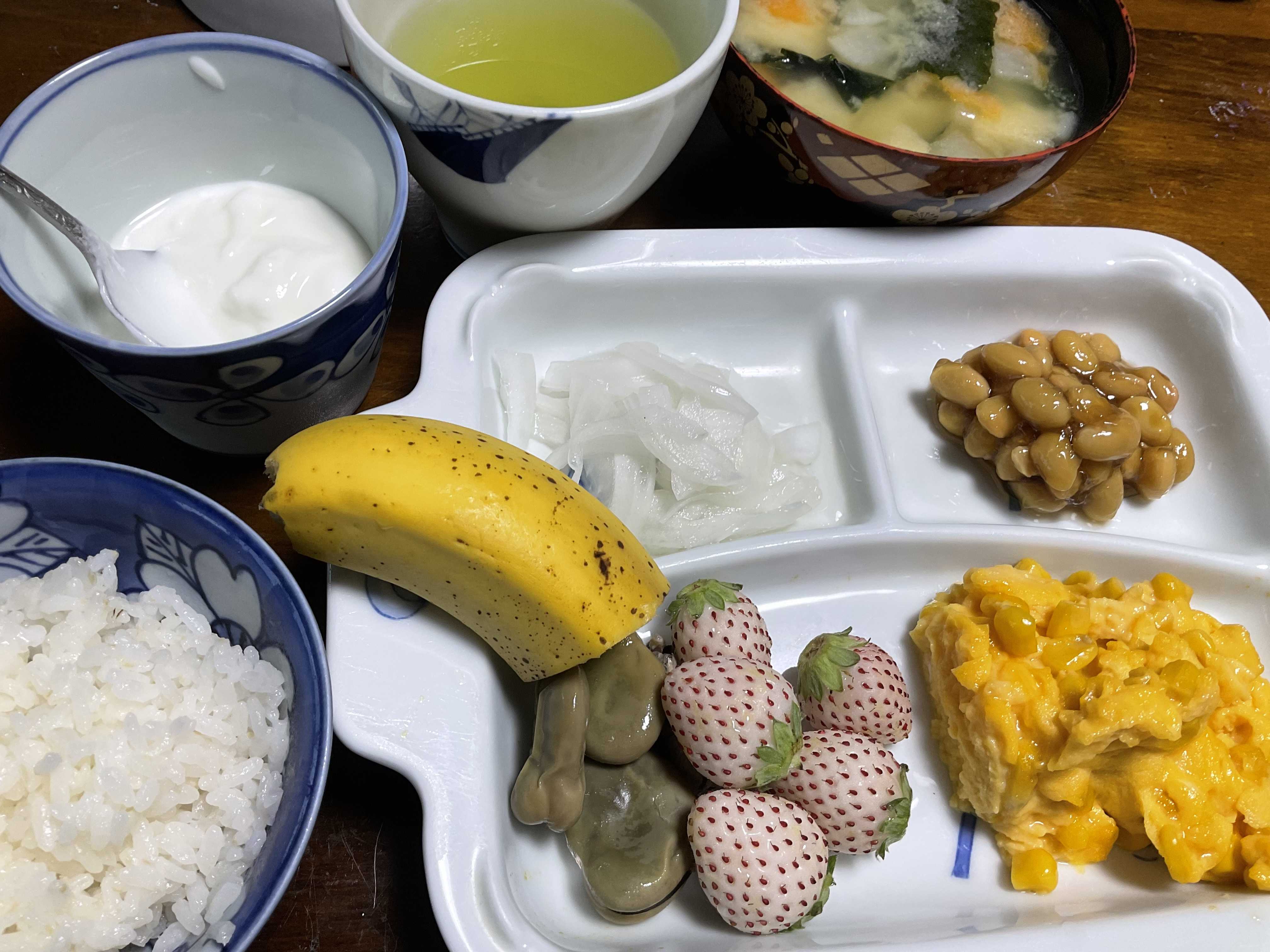 どもです今日はなぜだか、7時に目が覚めました👀土曜日なのに…奇跡じゃそのような朝ごはんです奇跡が起きても、いつもと同じ朝ごはん🍚☀️まあ、当然だけどコーン入りスクランブルエッグ🥚🌽玉ねぎのかんたん酢漬け 味噌汁 ぶどう豆 その他ヨーグルトは半額ゲットです半額シールサイコーさて、今日は一日中チクチクしてたけど、なんせなれないもので、一向に進まず目も悪いしねこれは、結構な暇つぶしになりそうですわ