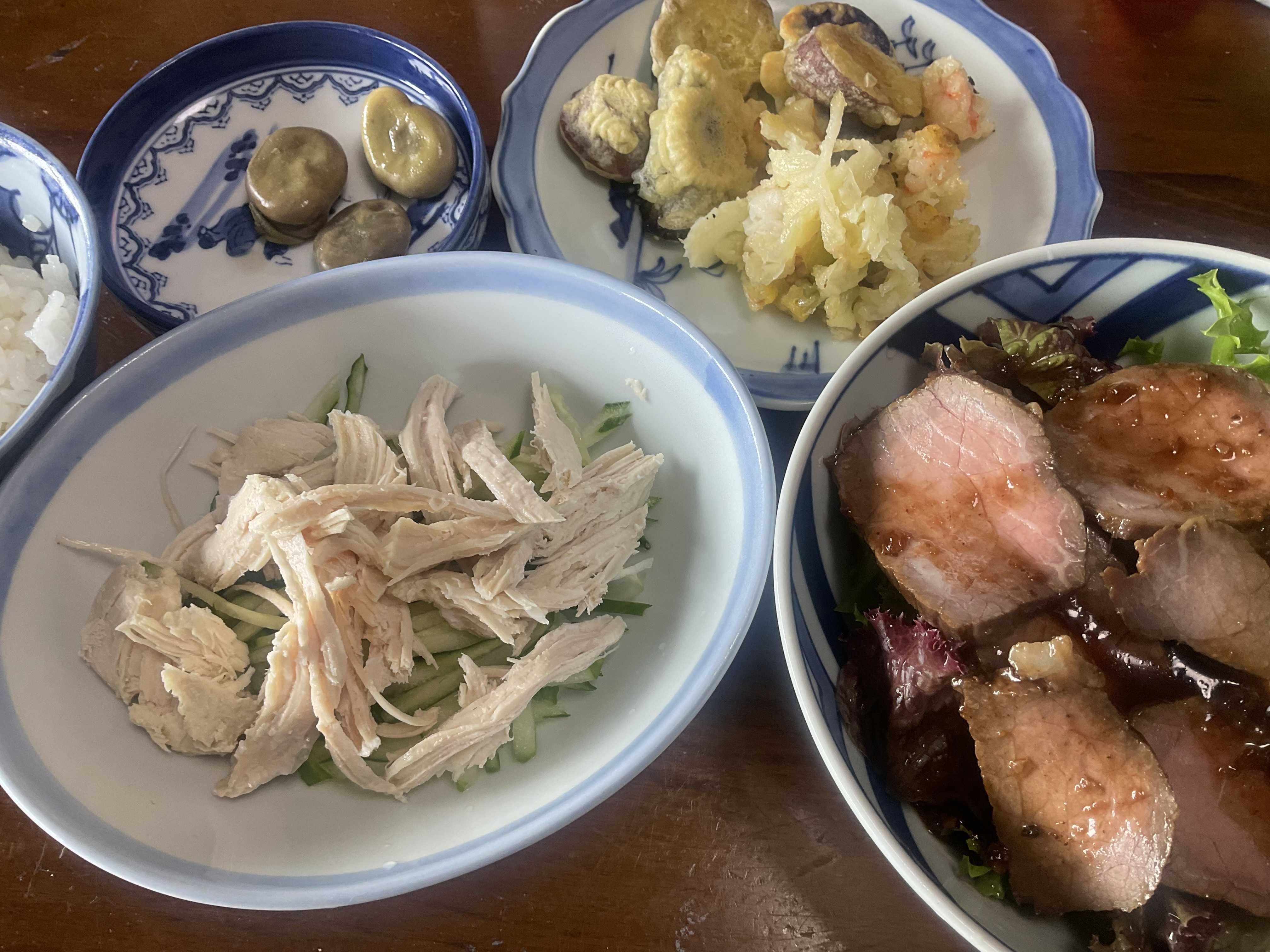 どもです今日は私のランチ当番です残り物をいろいろ並べる作戦ですローストビーフ 鶏胸肉のサラダ 天ぷら そら豆きゅうりがお安くなったのですごい助かります👍残り物、万歳🙌