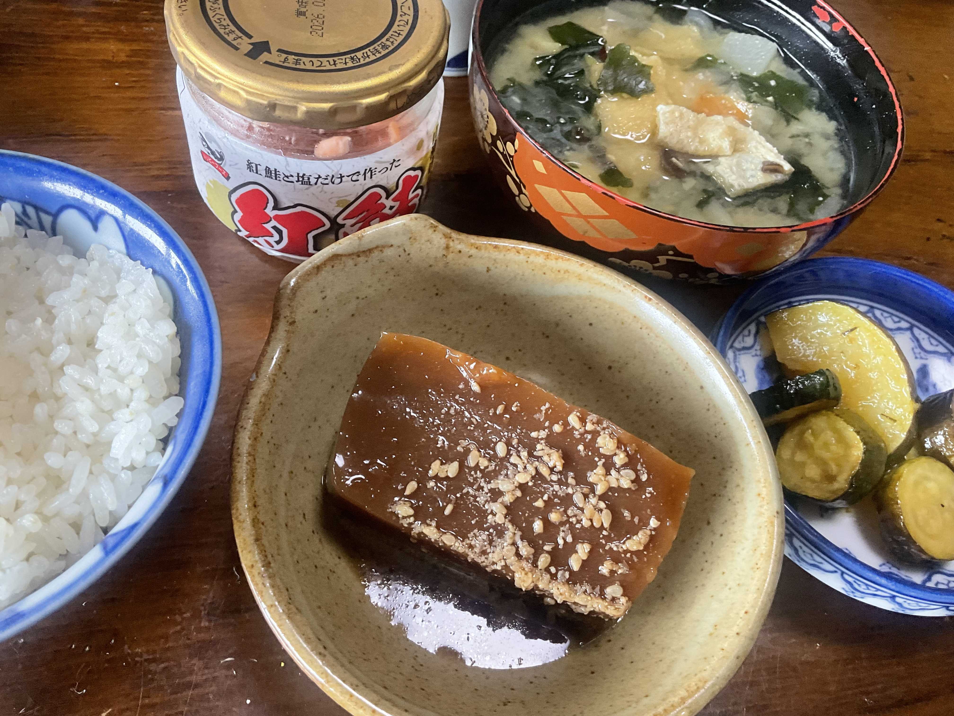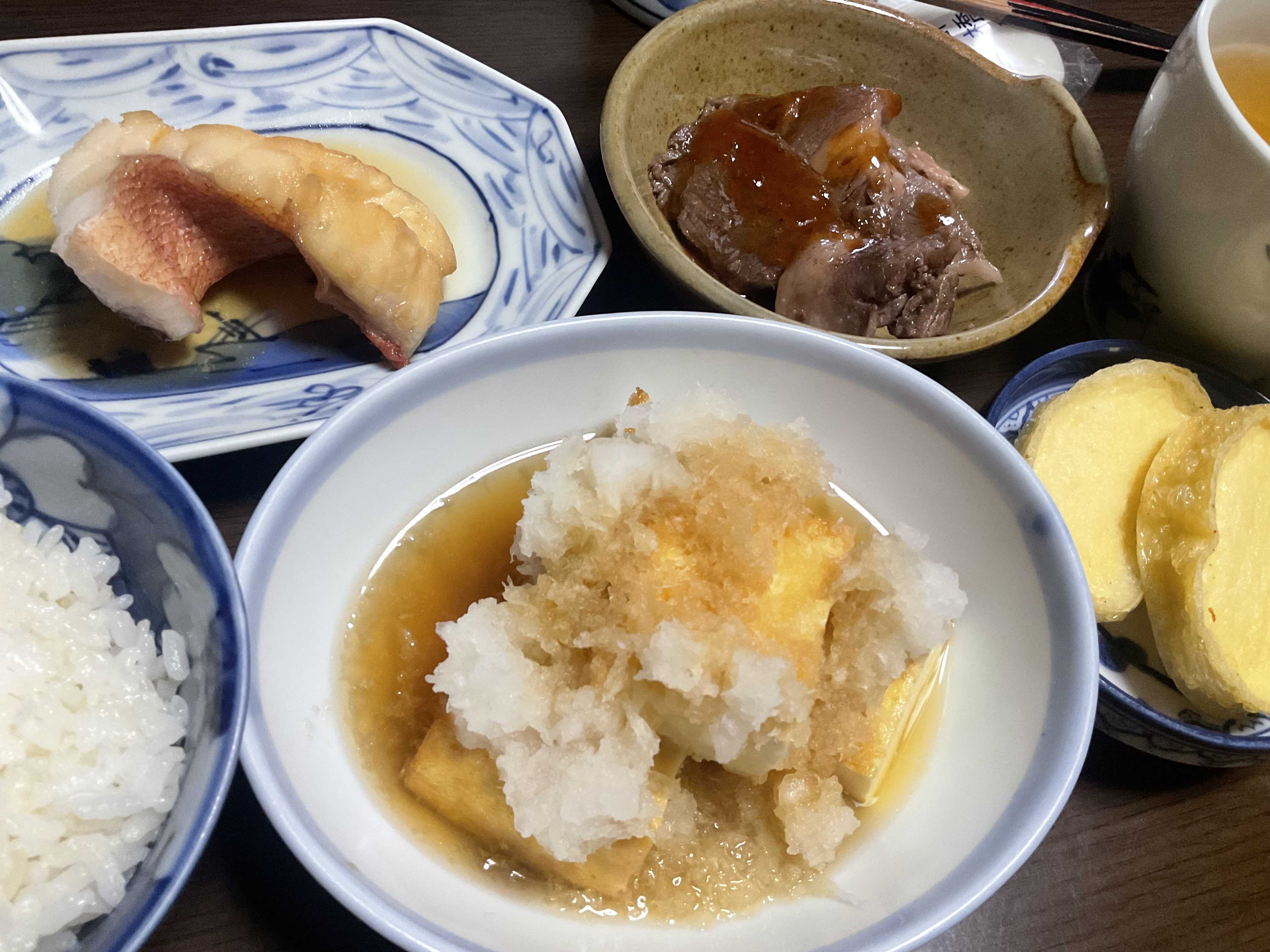 おばんですこのごろ、微妙に便秘気味というのも、きっと野菜が足りていないからわかっちゃいるだにタンパク質中心な夕飯献立のミスですな赤魚の煮付け 厚揚げ 湯葉揚げ ちょこっとステーキ🥩ちょっと質素な夕飯だったんで、半額ゲットしていたステーキ肉を1人3切れずつやきましてん湯葉揚げは妹にもらったやつ野菜が一品欲しいところですねごちそうさん