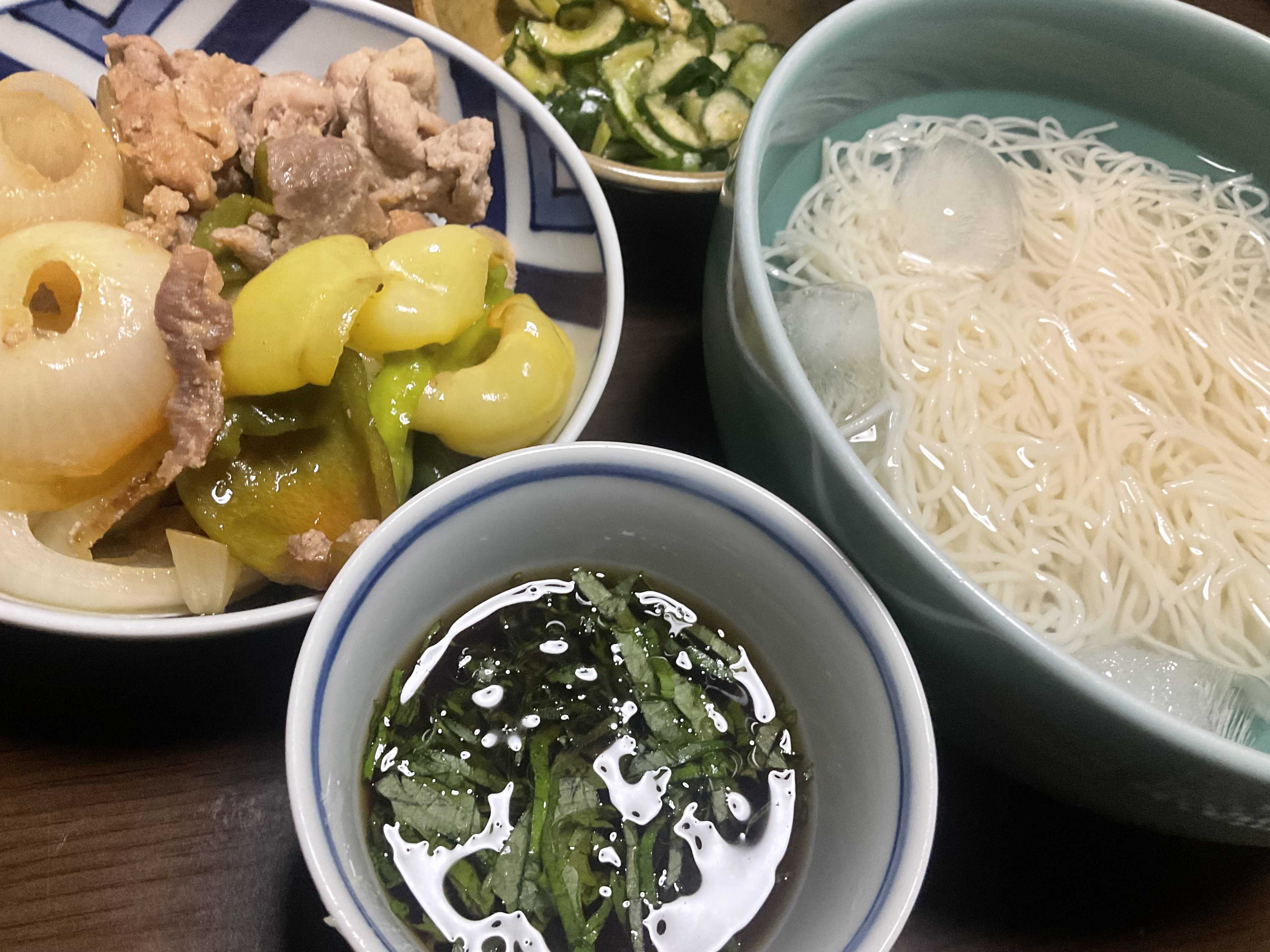 おばんです昼間、ブルーベリーを収穫していたGさま蜂に刺されてしまったでも、直ぐに痛みが引いていたなんて強いんだ私なら病院行くすごい腫れるんですで、 Gさまのリクエストで、今日はソーメンソーメン 豚の生姜焼き キュウリの胡麻和えソーメンはかなりやすいやつキュウリ 玉ねぎ シシトウ ピーマン 紫蘇は自家製1人140円ほどの夕飯ですほぼ、豚肉、ソーメン代ですな野菜があるって、ほんとありがたいごちそうさん