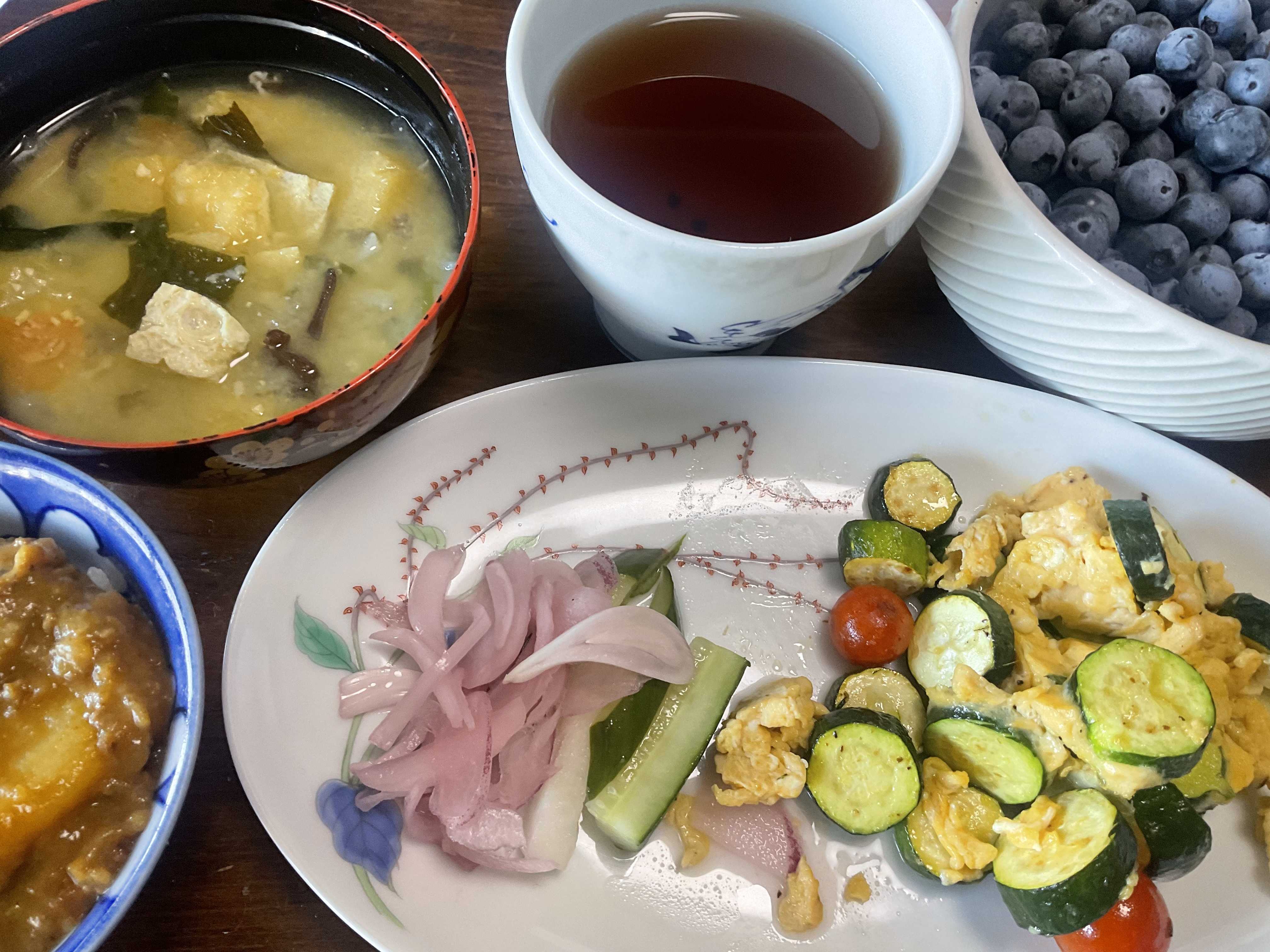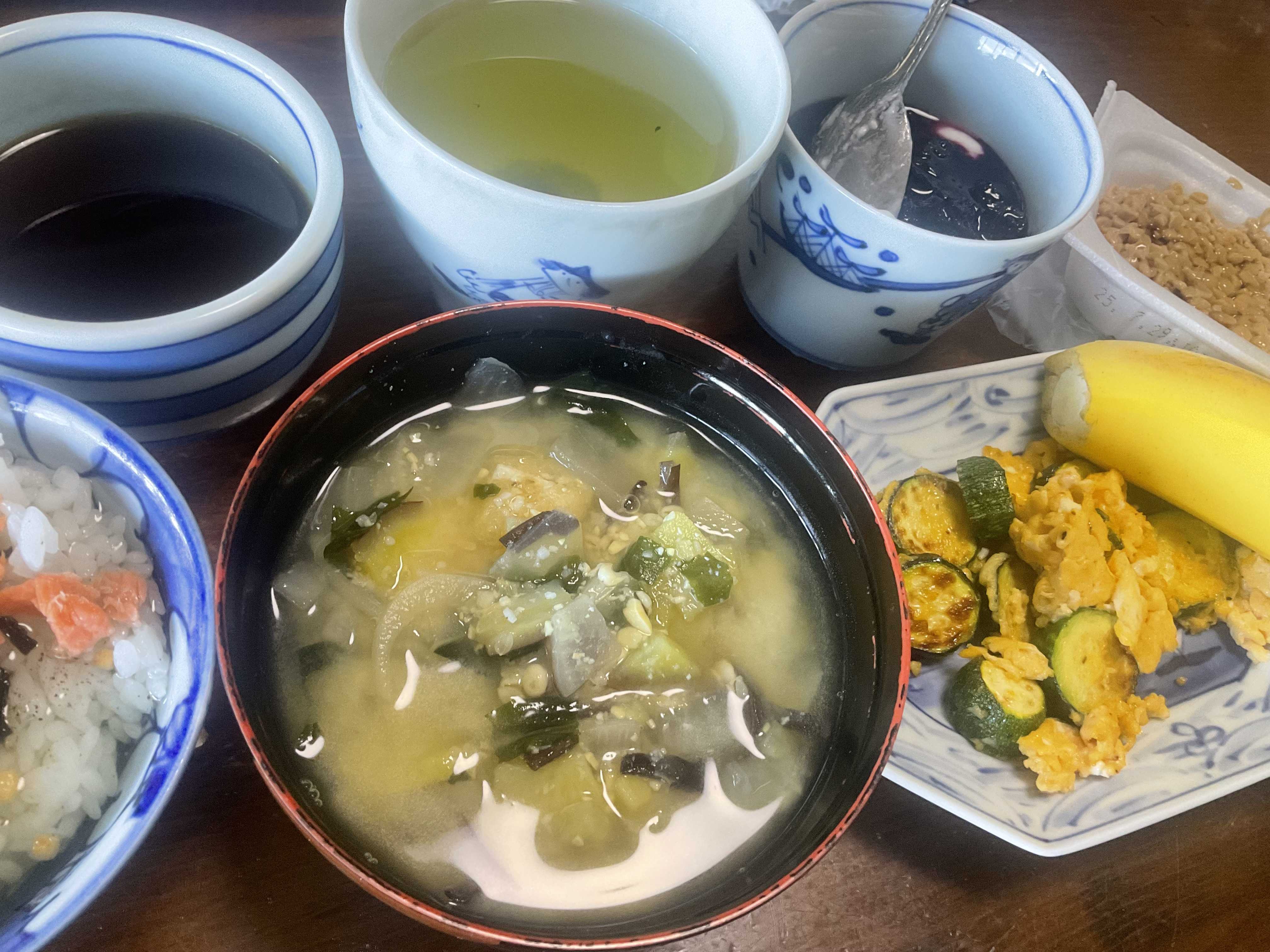 どもです昨日の夜というか夕方🌆 Gさまが食欲ないと箸を置いて寒いと言うので熱を測ったら38度オーバーなぬうううう滅多に熱出さないのに何故に?最後に熱出したのは、一昨年のコロナ⁉️と思いつつ、アクエリアスのませて寝せました〜えあこんも寒いというのです💦で、朝起きたら、普通に戻っていたいったい何だったんだろう?子どもは熱中症。というのですが、熱中症って、寒いんかい⁉️そのような朝ごはんですズッキーニ 味噌汁 ヨーグルト などなど久しぶりに味噌汁作ったら、味噌の量がわからないそして、作りすぎて大量に残ってしまったわ夜には腐ってしまうという夏場は作りすぎに注意⚠️しませう