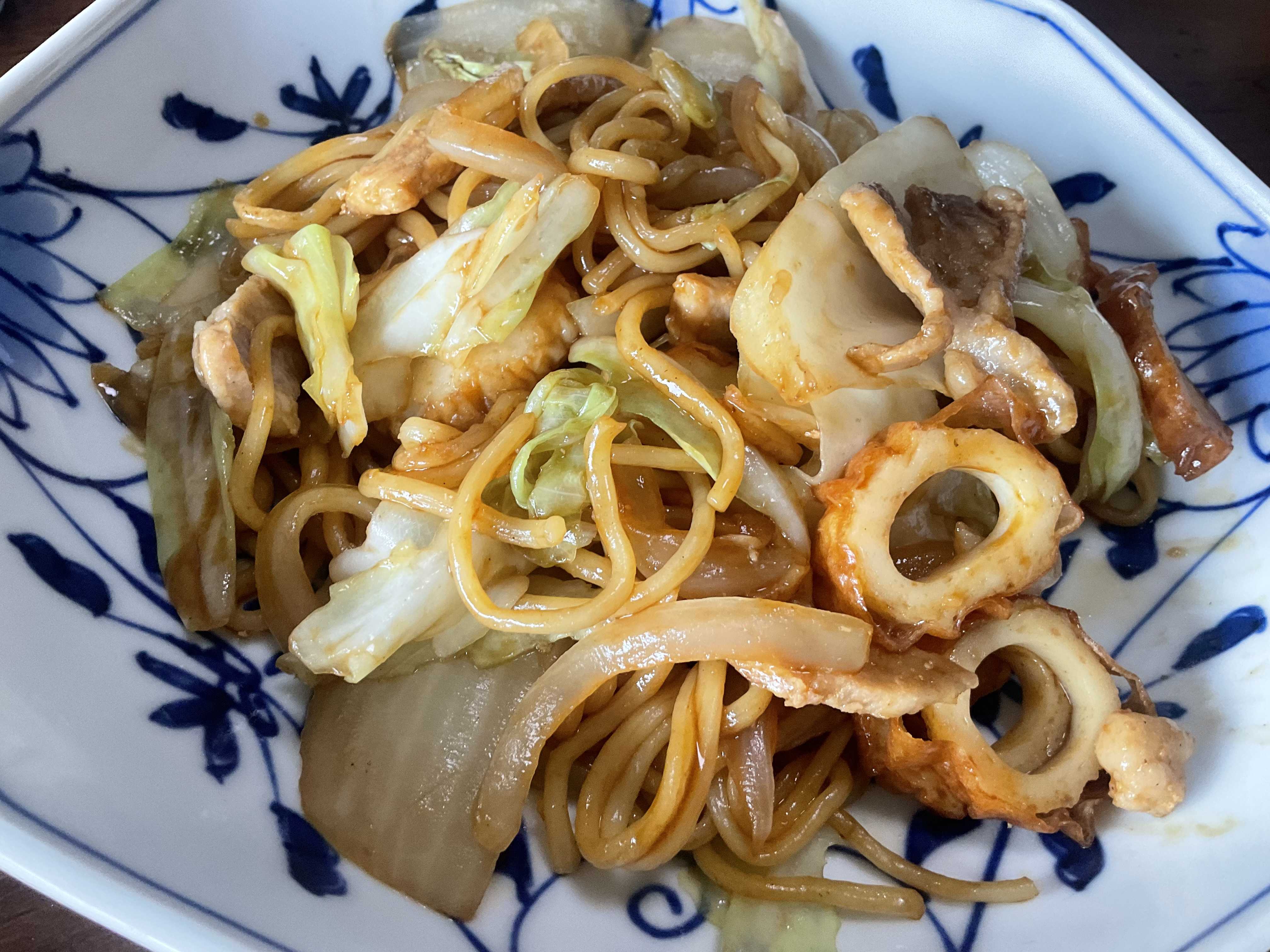 こんちゃです熱出した孫ちん、元気になったのは良かったですが、こんだ何食べさせるか迷ってしまうの好き嫌い 激しすぎますもう、食べなくてもいいと思うことにして、焼きそばです冷凍庫ひっくり返して、豚肉発見💡ちくわとか、玉ねぎ、キャベツ、総動員ですわ美味しいとかm美味しくないとか、関係なく腹いっぱいになればそれでOK🙆♀️てことでババに作らせたらそんなもんですごちそうさん