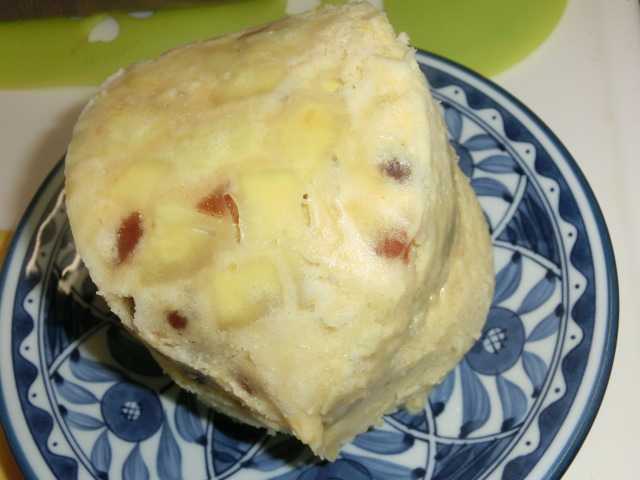 袋の中に牛乳とオリーブ油を入れて混ぜて、サツマイモを電子レンジで3分チンしてはちみつをからめたものとラム酒漬けのドライフルーツを入れて混ぜて電子レンジで3分チンするだけで出来ました。
