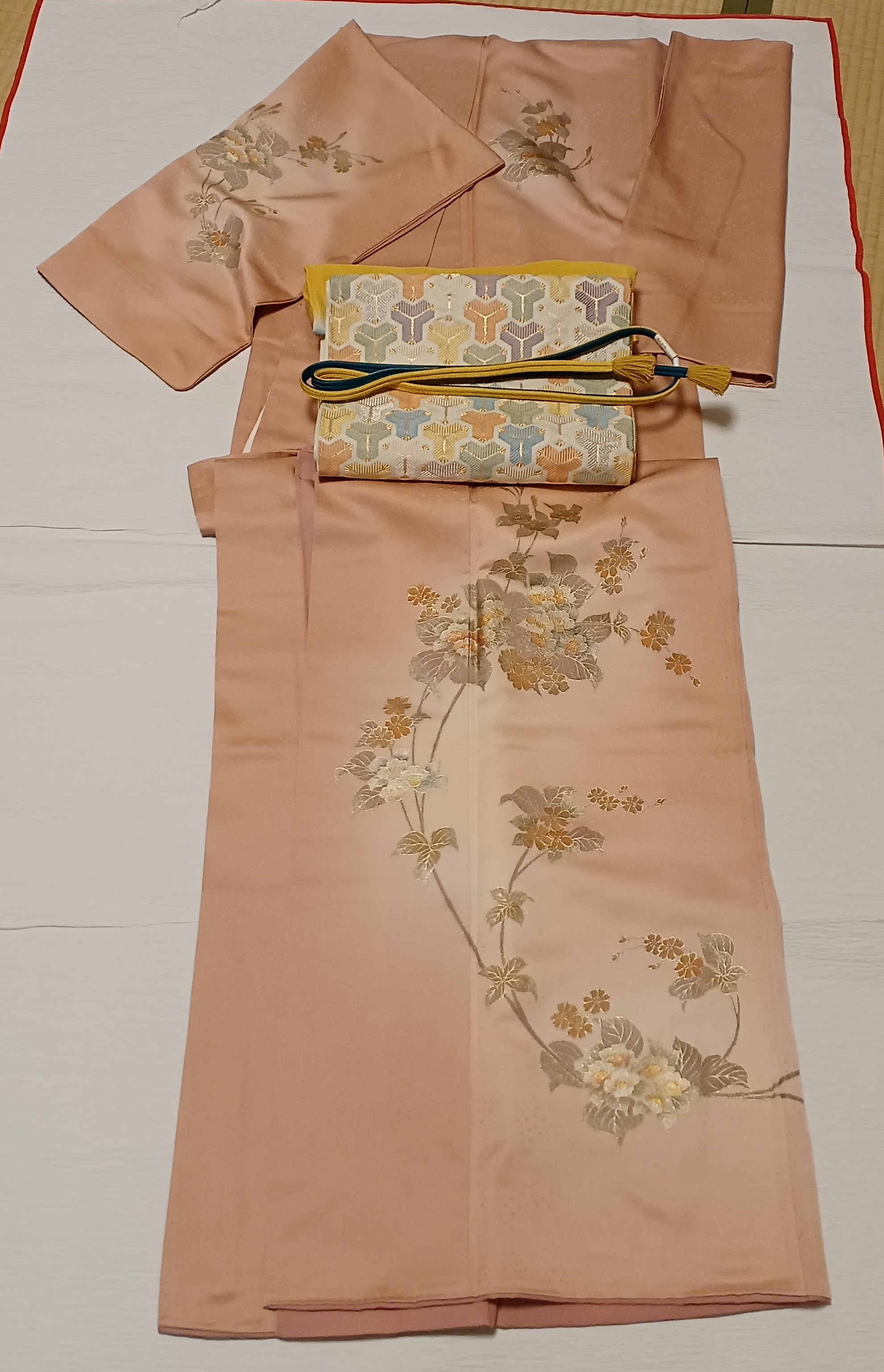 ↓のコーデも考えたけれど、白地にオレンジの菊が映える帯にしました。