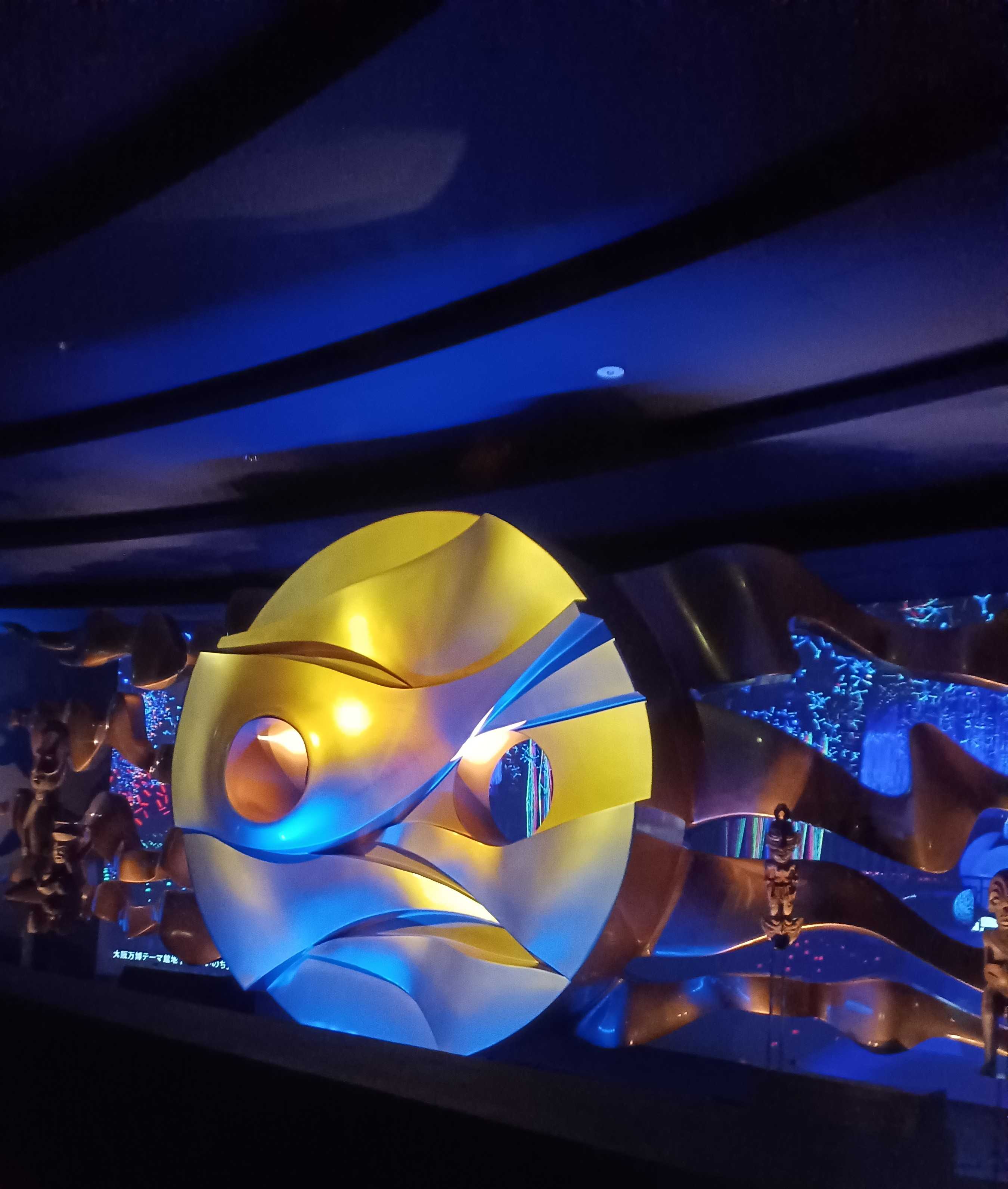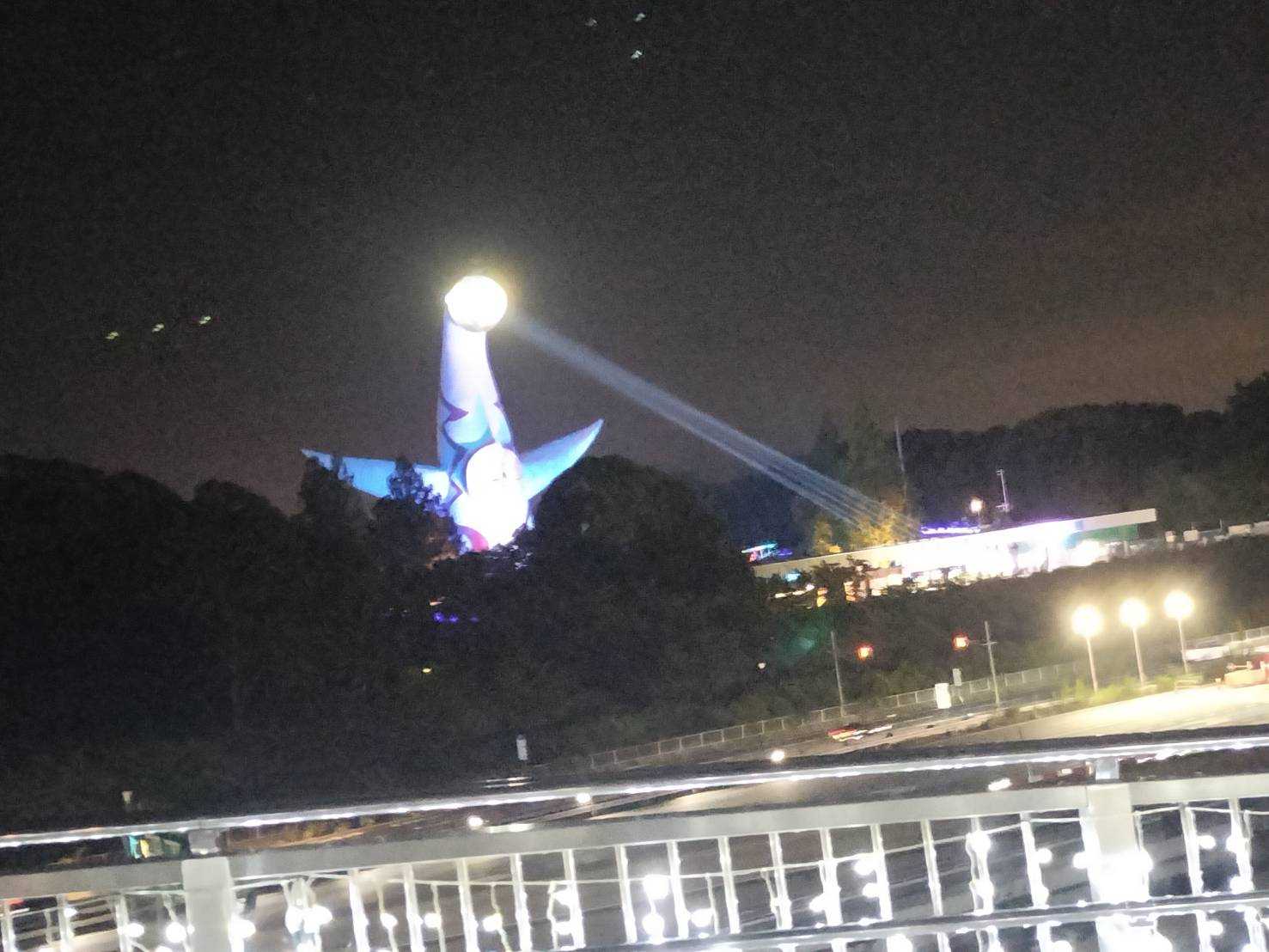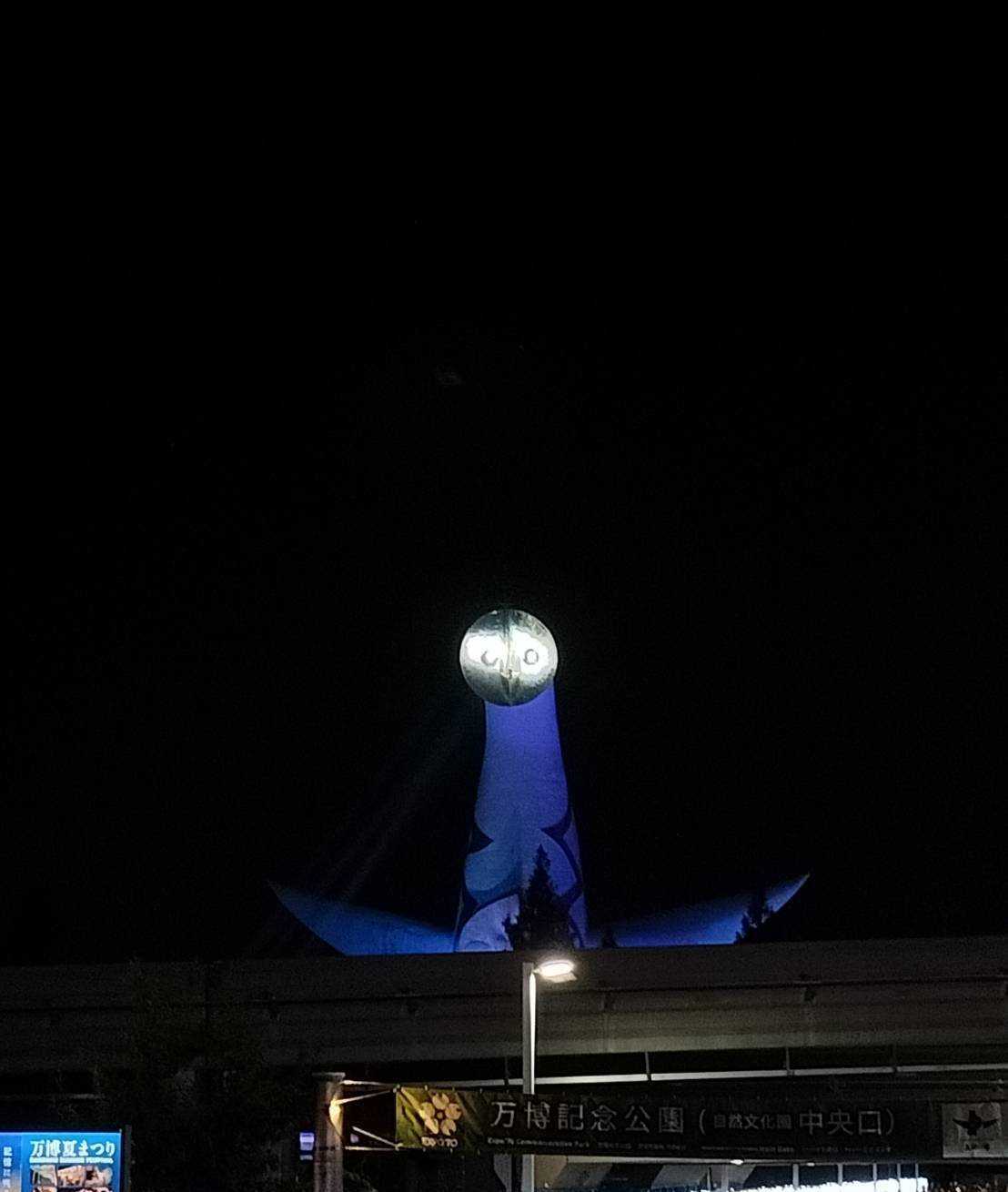 で、夜の太陽の塔顔?仮面?が怖いし、怪しい光線出してる