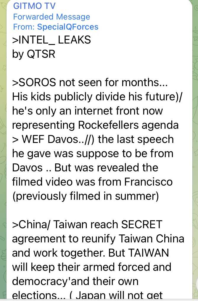 今年になってある方のビデオを見ました。その方が話されていることの中にはびっくりするような事柄が多く、特に日本の皇室のことはほとんどの人にとって驚愕の事実になろうかと思います。今世界の闇についてたくさんの真実が暴露されています。ウクライナの偽報道に隠されている真実は表に出たとしてもまだネット上に限られると思いますが、これから真実を皆に知ってもらう時期が来るのは確かです。そのビデオの中でお話をしている方は、一般社団法人 Wellbeing 協会 内藤晴輔さんとおっしゃいます。金融犯罪を追いかけているホワイトハットにスカウトされたそうです。日本の闇について驚くような事実を話されてます。日本人が真実を知る時期に来ていると思いますのでご紹介させてもらいます。 お話会1はこちら お話会2はこちらから、それぞれリンクさせてもらいました。テレグラムチャンネルにGITMO TVというのがあります。そこに意味深な投稿がありましたので日本語訳を書いてみます。ちょっと長いのですがお付き合いくださいね。こちらが最初のスクリーンショットです。(暗号もあるので日本語がわかりにくい箇所があります。🙏)INTEL_LEAKSby QTSR>数ヶ月間ソロスは姿を表していない... 彼の子供たちは公に未来を分ける?/ 彼は今インターネット上だけに存在し、ロックフェラーのアジェンダを実行している。つまりそれはWEF Davos(World Economic Forum、所謂ダボス会議)...彼の最後のスピーチはダボスからとされていたが...ビデオに撮られたのはサンフランシスコで前もって夏に納められたものだった。>中国と台湾は秘密裏に台湾中国として統一して共に協力することを同意している。しかし、台湾はその軍事力、民主主義と選挙制度を今まで通り継続するだろう...(日本は偽の戦争には加担しない)台湾は中国が戦争を引き起こし、そして落ちることを助ける。>ディープステートカバルのロスチャイルドはアジアのカバルリーダーたちに23trillion(23兆ドル)の借りがある。1月1日までの期日に返さなかったためパニックになっている。それがウクライナと中国で戦争を起こした理由。ロスチャイルド家のメンバーたちは彼らが所有する株を売却している!>DSがカザフスタンに潜入した後、ワクチンパスを作り食料をコントロールしようとした後...プーチンは我慢の限界に達した。カザフスタンの人々はロシア軍の情報とオペレーションの助けを借りて変革を試みた。そして、ダボスグループ側の企業のリーダーたちを追い出した。ダボスの連中、ヒラリー、オバマ(DS)たちは次にウクライナを標的にし、スラブ民族をターゲットに生物兵器を使おうとした。プーチンがウクライナに関してこれ以上待てなかった理由。>ジョージブッシュは生物兵器製造(新しいアメリカの世紀プロジェクト)の中心人物だった。それは、スラブ人のような特定の民族をターゲットにした。SARSは中国人とアジアの人々がターゲットだったが...人の免疫システムで治る方が遥かに速かった。(鳥インフルエンザ、エボラ、サーズも生物兵器)>ロシアが、ウクライナの生物兵器ラボについてや核兵器取引(中東DSオペレーターによりもたらされた核爆弾製造)についても、サーバーにある極秘情報をデクラスすると期待できる。ー 今はまだ闇の中>流れは、スイスにあるジュネーヴ湖(レマン湖)基地でコントロールしているDSのオペレーションへと向いている...>US特殊部隊がスイス軍の訓練に加わり、野営地の包囲の仕方や、ディープステートやCIAオペレーションの倒し方などトレーニングしてきた。>福島のイベントは、ロスチャイルドによるDS側の軍のオペレーションだった...福島原発メルトダウンが起きた翌日...イスラエルのネタニヤフが日本のリーダーに電話で、お金を要求する恐喝をしてきた。支払わないと日本人4000万人を北朝鮮に移動させてそこにロスチャイルドのNWOを作ると脅した... 福島のイベントを受けて数百ものメディアたちが日本のリーダーの会見を聞くために集まった...日本はそこで恐喝と4000万人移動の話をしたが、それに関して伝えたメディアは一つもなかった。ロスチャイルド(ハザリアン)がメディアの口を封じた。現在ネタニヤフは身柄を拘束され情報とサーバーを提供した。>ディープステート対ディープステートディープステート対アジアのディープステートの始まり...中近東で始まる...ロスチャイルドが彼らの資産や株を売却している。そして他のエリートたちに借りを返さない。力の実体に波及効果が出ている。内戦... ネタニヤフ、ウクライナ大統領、アフリカの大統領たち...etc.が今船に飛び乗り、情報を暴露している。これから中国や台湾に起きること、日本の3.11の真相など衝撃的です。この中にあったように、SARSやエボラ、鳥インフルエンザ、HIVなどのウィルスは全て生物兵器でした。それに対してビル ゲイツが作ったのはマッチポンプとしてのワクチンです。SARSはアジア人を、エボラはアフリカ人を削減する計画だったと