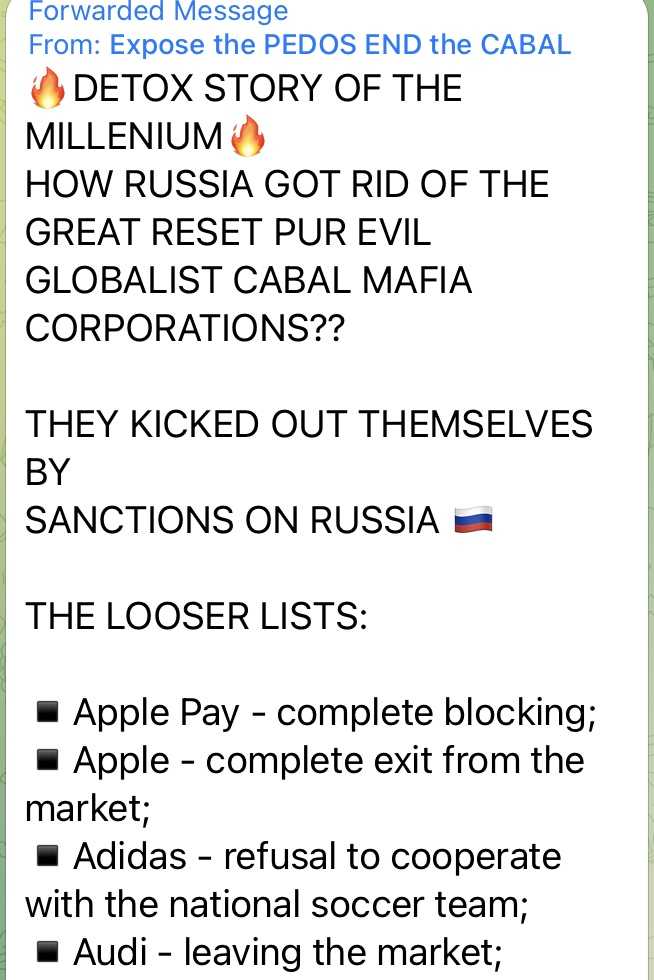 今日はここ数日に暴露された画像や証言などで興味深いものばかりをご紹介します。ちょっとまとまりがなくなりますが、どれも皆さんに知って欲しい情報ですので、びっくりしながらご覧ください。(日本語訳は画像下に書いています)まずプーチンさんがおっしゃったこと説得力あるね、プーチン”私は西側諸国の一般の人々にも私の言うことを聞いて欲しい。あなた方がいる困難な状況は、ロシアを敵国の行動として彼らがあなた方に見せているものだ。それらは謎のロシアの脅しに対する戦いとして、あなたがあなたの財布から支払う必要があると言っている。それらは全て嘘だ!そして真実は、西側諸国の人々が直面している問題は、西側の国々のエリートたちの支配が長年に渡り行われて来たことだ。彼らの間違いは、目先のことしか考えない野望を持ったことだ。これらのエリートたちは、市民の生活向上など考えない。彼らは莫大な利益にしか興味がない。”昨日起きたこと:ロシアの国旗がストラスボルグにある欧州理事会前のポストから降ろされた。NWO全ての組織にもはや属さないことは素晴らしいことだ!目覚めたロシア人たちが自由への解放を感じているだろう!ロスチャイルドが、ウクライナを失うわけにいかない、と言っていたのを覚えている?トランプ大統領が、ウクライナにあるバイオラボからだと我々にずっと言っていたんだ。彼はチャイナと言ってから三又の矛として綿棒を見せた、それはウクライナの国章(紋章)だったんだ。MJ_Innocent(マイケル ジャクソンさんのテレグラムチャンネル)トランプさんのこの発言はコロナパンデミックが起きて間もない頃(2020年)だったと思います。なんとトランプ大統領はは全てをご存知でこのように、わかる人にはわかるような話し方をなさったのですね。チャイナ発言は私がずっと疑問に思っていたことです。何故そこだけはっきりと言われるのかな?と...それに中国がチャイナ発言に反発していましたね。Q-tipは綿棒の商品名です。アメリカでティッシュをクリネックス、日本でセロテープ、ホッチキス、サランラップ、バンドエイド、など商品名が使われているのと同じです。プーチン:世界で起きたテロリスト攻撃の95%はCIAによるものだった。CIAはアメリカ市民のために働いているわけでも彼らの利益のために働いているわけでもない。CIAはディープステートの悪党組織の要素の一つだ。それは世界を支配する寡頭制と彼らのNWOビジョンのことだ。考えてみて、そしてシェアして!寡頭制(かとうせいoligarchy)は、少数の人が国家権力を握り行う独裁的政治のことです。人類に対する最も大きな不正 - ウィルスは分離(特定)されたことがない - ウィルス捏造が暴露された - どう思う? シェアして!もしこれが本当なら、すごい暴露です。新型コロナウィルスのプライマーがどこにもないということは以前から言われていました。ないウィルスに対してワクチンなど作れるわけありません。以前から名前のついているウィルスは皆人工的に作られたと思っていたのですが、幽霊ウィルスだった可能性が出てきたということです。もしこのことが証明されたら、マッチポンプとして作られたワクチンは全て嘘になります。製薬会社にとってこの事実は是が非でも隠したいことではないでしょうか?毒入りワクチンの副作用で亡くなったり障害を持つことになった人々がたくさんいます。子宮頸がんワクチンもその一つです。今後そのようなことも明らかにされるといいですね。ジャンクフード! 産業用配管やゴム手袋製造に使われる有毒な化合物がマクドナルド、バーガーキング、そしてピザハットの80%の食品から見つかった:危険な化学薬品は喘息、不妊症、精巣未発達に繋がっているとする研究結果がある。私が驚かないのは何故だ? プラスティックのマトリックスフードを食べないで。電気自動車とチャージステーション 1912年電気自動車とチャージステーション 2019年電気自動車は19世紀にはガソリン車より多く製造されていた。しかしロスチャイルドによって支援されていた石油とガスの企業は、運輸業における莫大な利益獲得のために電気自動車というアイデアを葬った。錠剤を溶かし磁石を近づけると、黒い酸化グラフェンが...実験で分かったことは、グラフェン オクサイドがNurofen錠(ヌロフェン錠)に含まれている。ヌロフェンはオーストラリアで良く売られている風邪薬だそうです。その中に酸化グラフェンが入っていたのです。酸化グラフェンは磁石に反応します。Covid-19遺伝子注射にも酸化グラフェンが混入されていると言われています。最後はかなり衝撃的ですので気の弱い人は読まないでくださいね。BitChuteという動画サイトに出ていた動画の中のナレーションの一部です。ニュールンベルグがやって来る - MIN-TX法律事務所がカン二バルたちの名前をあげました - 今アメリカの裁判所からファイルを取り除く動きがあります。*****DROEL法律事務所がファイルを破棄して、