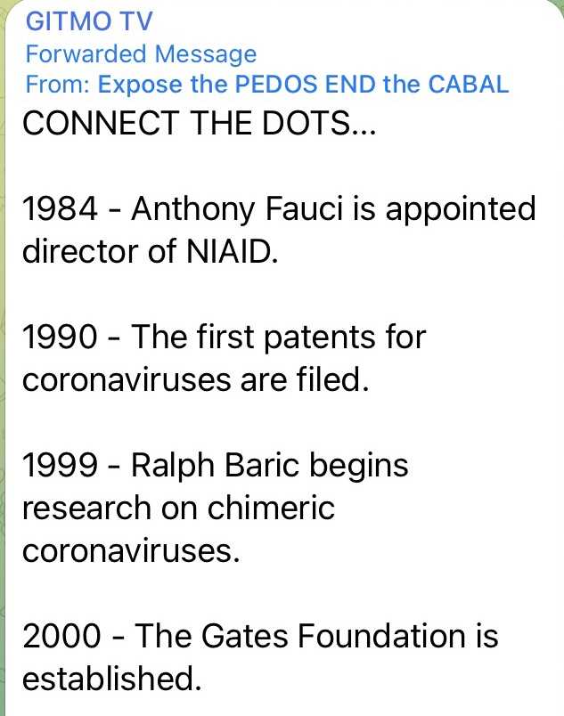 新型コロナパンデミックが起こされて2年以上が経ちました。日本では2020年2月にクルーズ船が横浜寄港をきっかけにプランデミックが起きました。私は当初から厚労省の言動や医師会の報告に注意していました。すると、すぐにおかしいことに気づき、その後1年もメディアのフェイク報道に呆れる毎日でした。そしてちょうど1年前の3月20日に長年休んでいたこのブログを再開することにしました。そして最初に日本語訳を投稿したのは、「ロックフェラーのロックステップ計画」についてです。プランデミックの元になった計画ですから、コロナ騒動が茶番だという一番の証拠になると考えたのです。それから、ブログの名前を ”森の中で” に変えました。長野の森の中から発信していたからです。4月頃からはとにかくワクチン注射が危険だと訴えて来ました。ニュールンベルグ条約やファイザー元副社長の証言や、国際裁判所の判決や資料などもご紹介して来ました。私は記事を書く時なるべく根拠となる画像や証言を一緒に載せています。それらは信用に値すると私が判断したものばかりですが、物事を判断するときは、知識の断片を繋いで考える必要がありますし、知識や情報量は一人一人違いますので、誰も強要はできないのです。なので是非皆さんのご判断で、点と点を繋いでみてくださいね。この頃はYouTubeやTwitterで化けの皮が剥がれてきている人もいます。無知だから?と思っていた人たちがやはり情報を操作していたとわかり、ちょっとガッカリしています。私は、それでも近い将来きっと全ての真実が明るみに出る日が来ると信じています。その時、私たちは慌てず冷静でいたいですね。😉因みに、”Connecting the dots." という表現を使ったのは故スティープジョブズさんです。スタンフォード大学で卒業生を前にして素晴らしいスピーチをされた時、ご自分の経歴について3つの点を繋ぎながら説明されました。スピーチの最後に、”Stay hungry, Stay foolish." (ハングリーで愚かでいろ)とおっしゃいました。あの時の経験がなかったら今の自分はない、あの時あの人に出会わなかったら今の自分はない、と思うことは誰にでもあると思います。歴史は瞬間(点)の積み重ねでできています。それはタイムラインとも呼ばれています。😉そんなこと考えていたら、GITMO TVというチャンネルから点と点を繋いだという投稿がありました。1984年から起きたことが時系列に書かれています。全部繋がって最後はプランデミックになります。ちょっと恐ろしい点ばかりですが日本語にしてみます。(スクショは一枚のみです)点を繋いでみると...1984年 - アンソニーファウチがNIAID(National Institute of Allergy and Infectious Diseases国立アレルギー感染症研究所)のディレクターに任命された。1990年 - コロナウィルスに対して最初のパテント(特許)が申請された。1999年 - ラルフ バリックがコロナウィルスのキメラの研究を始めた。(キメラ:生物学で同一個体中に遺伝子型の違う組織が互いに接して存在する現象、合成生物)2000年 - ゲイツ財団が設立された。2000年6月 - 人間のゲノム配列が初めて解析されたことに関して、クリントン大統領が、”今日我々は創造主神の生命の展望について学ぶことになった。”と言った。そのプロジェクトはフランシス コリンズ(ファウチのボス)によって資金提供を受けた。2001年に大統領の座を去ると、ビル クリントンはクリントン財団を設立した。2001年12月 - 最初のアンドリュー カーネギー賞が、”近代奉仕活動のビジョンを示した人” として、テッド ターナー、ジョージ ソロス、ビル ゲイツ、ブルック アスター、アイリーン ダイアモンド、レオノア アネンバーグ、ローレンス ロックフェラーらに与えられた。アンソニー ファウチもイベントに出席した。2003年2月 - 中国で最初のSARS アウトブレーク(感染爆発)が起きた。CDC がコロナウィルスに関する情報、人間に感染することも含め、全てで特許を取ろうとした。自然に対して特許を取ることは違法とされている。ということは、コロナウィルスは人工的に作られたのか、特許申請は違法だということ。パテントは合法とみなされたので、CDCは、ウィルス研究を行う資格が与えられる者を全てコントロールした。結果、他には誰もウィルス研究ができなかったばかりか、テストキットの開発も不可能だった。2005年2月 - ビル クリントンがエプスタインのプライベートジェットで北京を訪問した。クリントンは帰国するとすぐにヒラリーと共に、クリントン グローバル イニシアチブを設立した。2005年ブッシュ大統領がNIH(National Institutes of Healthアメリカ国立衛生研究所)に未来のパンデミックに向けて準備をするよう指示を出した。2008年 - ブッシュ大統領からファウチに、大統領の ”自由のメダル" が与えられた。2010年 - ゲイツが、もし我々がワクチンで本当に良い仕事をしたら、世界の人口を10%から15%削減できる、とスピーチ(TED)で主張した。2011年 - ゲイツがエプスタ