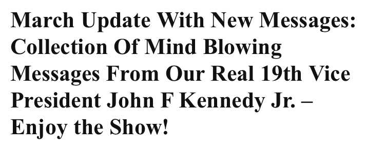 今日は何回も繰り返しになりますが、最近になってネット上で暴露されていることを書きます。殆どのことは新しいことではなく、私が1年間繰り返し書いてきたことですが、まだ半信半疑の方がいらっしゃるかも知れないと思いました。TVなどで見聞きしたニュースに、180度違う方向から向き合うきっかけになると思います。*2年間続いたコロナパンデミックは1990年頃から用意周到に計画されたこと。2019年10月にはシミュレーション(イベント201)が行われた。目的は人類削減と残った人間をコントロールするNWOへGreat Resetするため。 ➡️コロナパンデミックは茶番*Covid-19ワクチンは従来のワクチンではなく遺伝子実験注射。HIVウィルス、酸化グラフェン、ナノボットなどが入っている。摂取すると体の中でADE(抗体依存性免疫増強)が起きる。結果免疫力の著しい低下が起きる。 ➡️Covidワクチンはジェノサイド*1985年以降作られたワクチンは、ウィルス、細菌を弱毒化し抗体を作るものではない。あらゆる毒が混入されている。 ➡️ワクチンは毒注射*名前のついているウィルスにはパテントが取得されている。自然界のものにはパテントは取れない、従ってSARS, MARS, HIV, SARS-Cov2, などは人工的に作られたウィルス。 ➡️ワクチンはマッチポンプ ➡️ウィルスは変異を繰り返し弱まる*医師による処方薬、ドラッグストアで購入できる多くの薬は、人間の自然治癒力に拮抗し治癒反応を止める ➡️薬は対処療法、免疫力が病気を治す ➡️長期使用は危険、寝たきり、認知症、人工透析などの原因*癌細胞の初期は良性、悪性の区別はつかない、また判別は難しい。癌は自然退縮することがある。 ➡️早期発見、早期治療で治ると言えない ➡️抗がん剤は癌を悪化させる*所謂花粉症は飛行機から上空に撒かれた化学物質(ケムトレール)が原因で起こされていた。スギ花粉など植物アレルギー反応とは別。 ➡️アレルギーの薬はアレルギーマーチの引き金*地球温暖化は嘘の映像と気象兵器で捏造されて来た。それに伴い二酸化炭素排出量を売買する仕組みができた。 ➡️大地震、大洪水などは人工災害の一つ*地球には人類だけでなくレプティリアンなど人類とは違う生命体が多く存在していた。 ➡️人類 対 人間もどき(悪の宇宙人) の戦い*日本と北朝鮮にあった拉致問題は捏造の可能性。李王朝家 李ぎんへ嫁いだ李方子(まさこ)との間に生まれた女の子が李早紀江さん。日本人横田さんと結婚し横田早紀江となり、生まれた娘が横田めぐみさん。金正日(ジョンイル)とめぐみさんの子が金正恩(ジョンウン)。 ➡️金正恩は日本人の血筋驚くことばかりだったと思いますが、このような情報は捏造され、メディアの流すフェイク情報として殆どの人々の頭に刷り込まれて来ました。世界で起きた戦争もその多くは意図的に起こされたとジュリアンアサンジさんが言ったことを昨日の記事でご紹介しました。多くのことが180度違う事実としてメディアを通し私たちに教えられて来ました。それを今になってひっくり返せと言われてもなかなか難しいと思いますが、ちょっと(できれば180度、🤣)視点を変えて見るきっかけにしてくださったら嬉しいです。AMG Newsからとても興味深い記事が出て来ました。アメリカ共和国の19代副大統領はジョンF.ケネディーJr.さんです。そのJFK Jr.さんがずっとBulletin(公報)を出されていたのですが、その中で驚くような真実を語ってらっしゃるのです。私はかなり前からJFK Jr.さんのテレグラムチャンネルに参加して投稿の殆どを見て来ましたが、これらのメッセージの中では、テレグラムには載せていないことを詳しく説明されてます。AMG Newsの記事から3月最新情報とメッセージ:我々の本当の19代副大統領からの驚愕のメッセージの数々 ー ショーを楽しんで!あなたの意識がぶっ飛ぶ準備して、これらは、本物の19代副大統領から共和国のために書き保存した驚きのメッセージです。私は、副大統領であるジョンFケネディーJr.の公報メッセージを見つけました。価値あるこれらの情報は驚愕の事実です。ついている連続番号からメッセージの全てを手にしていませんが、私たちが学ぶには十分過ぎるほどです。私は引き続き欠けている公報を探して見ます。見つけたらアップデートします。沢山あるメッセージの一つを選んで、調べ、勉強して見てください。ソーシャルメディア、ブログ、ビデオチャンネルなど使って皆に知らせてください。つまり我々自身が勉強し同時に人々に知ってもらうのです。私はメッセージに書かれている項目の専門家ではありませんので、これからたくさん調べる必要があります。皆さんも楽しみではないですか?沢山ある中からD.U.M.B(地下ミリタリー基地)について書かれているものを日本語訳してみます。Deep Underground Military Bases(D.U.M.B.)は高度なトンネル、そして地下シティーへと繋がっている。そこにはクローン製造施設があり、人間たちを繁殖、拘束し、松果体からアドレノクロムを採取し