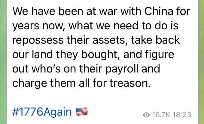 我々は中国と長年戦争状態にある。今すべきは、我々の財産を取り戻すこと、彼らが買った土地を買い戻すこと、そして彼らの資金が誰に行ったのか明らかにし、国家反逆罪で裁くことだ。