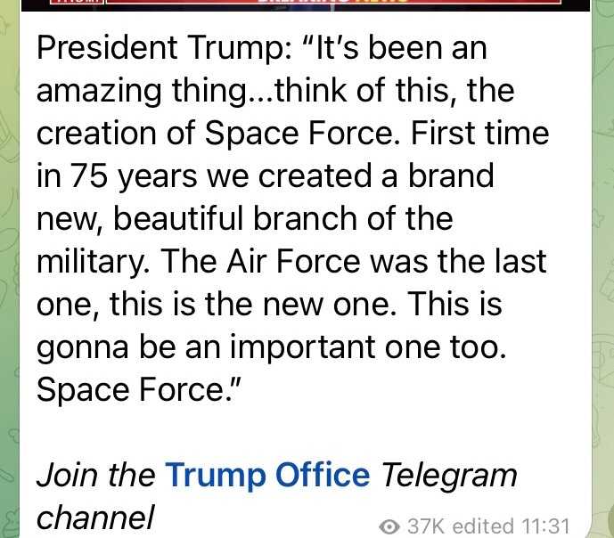 我々は、75年も経って初めて、新たに素晴らしい軍の支部を造ったのだ。空軍の後の新しい軍だ。宇宙軍はこれから重要なものになるだろう。