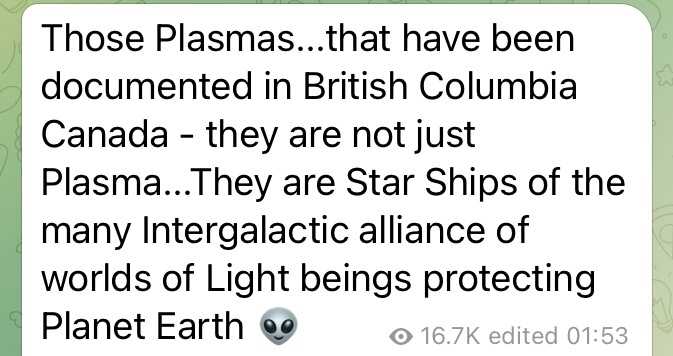 それらのプラズマは…カナダ、ブリティッシュコロンビアで文書化されてますが - それらはただのプラズマではありません…それらは、惑星地球を守っている光の存在の銀河連合のたくさんの宇宙船なのです。