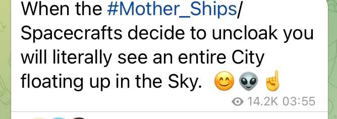 皆さんは心の準備できてますか? 私は想像しただけで怖くなる自分がいます。人って自分より大きなものに畏怖の念を持ったりしますが、母船は大き過ぎです! 映画ならスクリーンの大きさが限界ですから、平気、でも本当に目の前に母船が現れたら、宇宙人が私の家のドアをノックしたら……どうしよう??😅