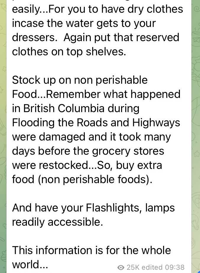 腐らない食料をストックしてください。ブリティッシュコロンビア州で洪水が起きた時のことを忘れないように、道路や高速道路がダメージを受けてしまいました。食料品店が再開されるまでに何日もかかりました。だから日持ちのする食料を確保しておいてください。