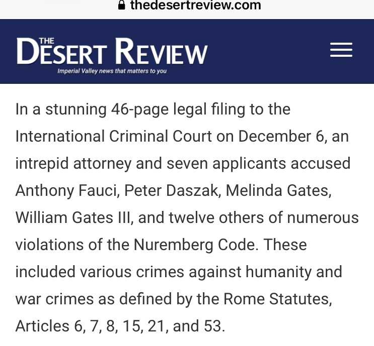 12月6日に、勇敢な弁護士と7人の申請者は、国際刑事裁判所に46ページの驚くべき法的文書を提出しました。告発されたのは、アンソニーファウチ、ピーターダザック、メリンダ ゲイツ、ウィリアム ゲイツ3世、その他12人で、ニュールンベルグ条項の多くに違反するものとして告発されました。それらの犯罪には、ローマ規定の第6,7,8,15,21,そして53 に定義される、人道と戦争に対する様々な犯罪が含まれています。
