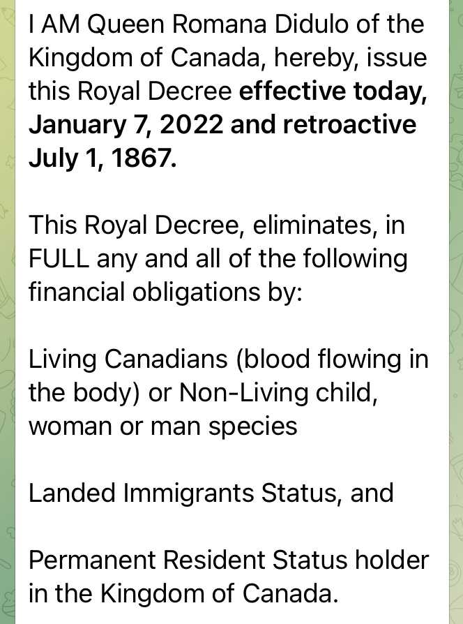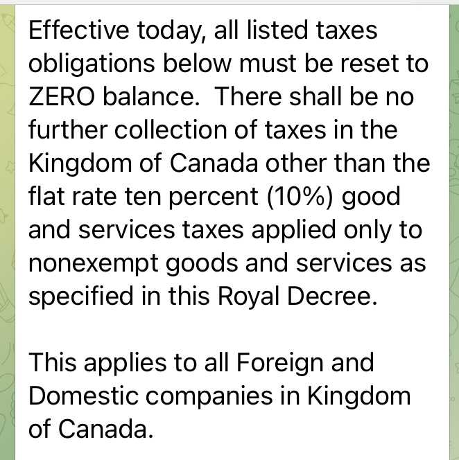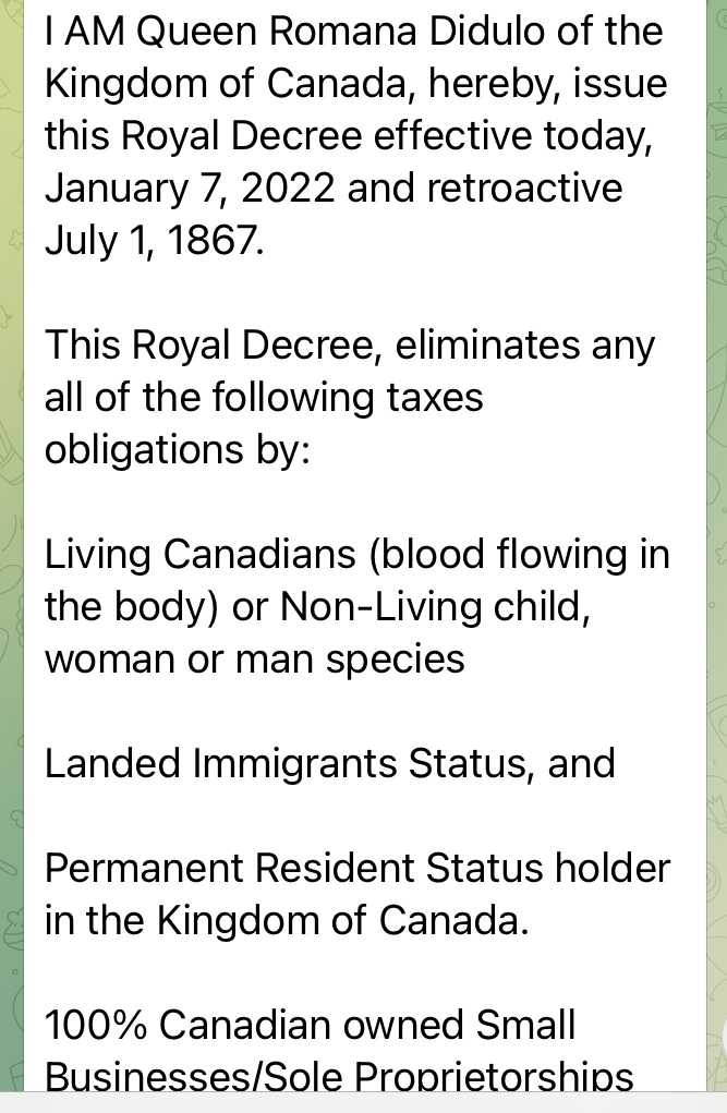 昨日のロマーナ女王の投稿はまさにカナダにおけるNESARAの始まりです。女王が、人々の今までの負債を免除するという政令と、今までの税制度を廃止せよという政令を出されました。