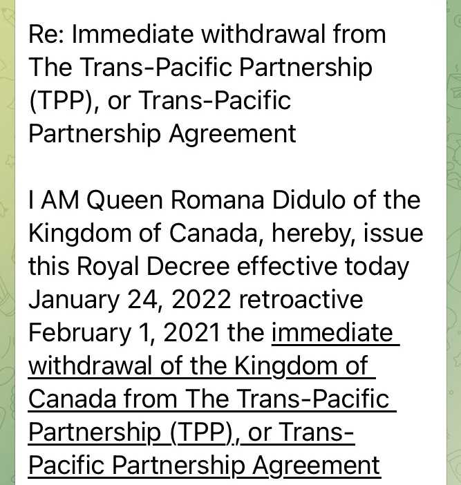 私クイーン ロマーナ ディデューロは、2022年1月24日をもって、2021年2月1日まで遡り、ここにTrans-Pacific Partnership(TPP)からのカナダ王国の即時脱退を女王政令で命令するものです。