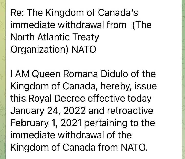 私クイーン ロマーナ ディデューロは、2022年1月24日をもって、2021年2月1日まで遡り、ここにThe North Atlantic Treaty(NATO)からのカナダ王国の即時脱退を女王政令で命令するものです。